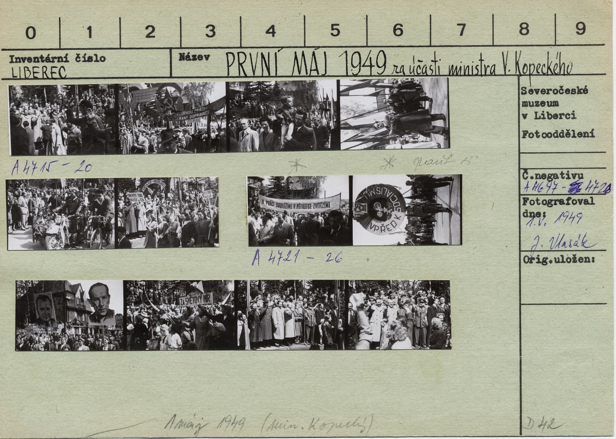 nA02164: negativ z fotodokumentace SM - Stráž n. N., odsun německých antifašistů, film acetát, Jiří Vlasák, 1946, Liberec nA04702: negativ z fotodokumentace SM - Liberec, První máj 1949 za účasti ministra V. Kopeckého (alegorický vůz), film acetát, Jiří Vlasák, 1. 5. 1949, Liberec nA04726: negativ z fotodokumentace SM - Liberec, První máj 1949 za účasti ministra V. Kopeckého (tribuna s V. Kopeckým aj. Harusem), film acetát, Jiří Vlasák, 1. 5. 1949, Liberec nA10083: negativ z fotodokumentace SM - Liberec, Den osvobozeného pohraničí, film acetát, Jiří Vlasák, 1947, Liberec nA25669: negativ z fotodokumentace SM - Liberecká spořitelna, pomocná úřadovna pro Němce, film acetát, Jiří Vlasák, 1945, Liberec nB09402: negativ z fotodokumentace SM - LVT ´63, kulturní dny, Karel Kraugartner, film acetát, Jan Kabíček, září 1963, Liberec nB12798: negativ z fotodokumentace SM - LVT ´65, exteriéry, nový pavilon F, film acetát, Jan Kabíček, září 1965, Liberec nB20324: negativ z fotodokumentace SM - Liberec ´18. listopad 1968 - první den stávky vysokoškoláků´, film acetát, Milan Mazánek, 18. 11. 1968, Liberec nB20698: negativ z fotodokumentace SM - Liberec ´Ulice . května - barikády pro rozhlas´, film acetát, Milan Mazánek, srpen 1968, Liberec nB20715: negativ z fotodokumentace SM - Liberec, nám. Bojovníků za mír, pomníček Jindřicha Kuliše u radnice, film acetát, Milan Mazánek, srpen 1968, Liberec nB20830: negativ z fotodokumentace SM - Liberec, smuteční akt u krematoria ´Srpen 1968 – 1. pohřeb obětí´, film acetát, Milan Mazánek, 24. 8. 1968, Liberec nB31507: negativ z fotodokumentace SM - LVT ´68, instalace v pavilonu A, film acetát, Jan Kabíček, září 1968, Liberec nB39425: negativ z fotodokumentace SM - Ještěd, restaurace nového hotelu, film acetát, Jan Kabíček, září 1974, Liberec nB39438: negativ z fotodokumentace SM - Ještěd, interiér nového hotelu (´Meteority´ S. Libenského a J. Brychtové), film acetát, Jan Kabíček, září 1974, Liberec nB42281: negativ z fotodokumentace SM - Liberec (tehdejší Gottwaldovo náměstí), novostavba obchodního domu, film acetát, Jana Ducháčková, srpen 1976, Liberec nB75644: negativ ze souboru fotografa Kříže - Liberec, Sokolská ul., průjezd vojsk Varšavské smlouvy, film acetát, Adam Kříž, 21. /?/ 8. 1968, Liberec nD0542: negativ kolódiový z daru G. Ginzela - Dražejov ´Draschen bei Dauba - Weg am Felsen´, plochý film nitrát, Rudolf Ginzel, 11. 7. 1907, Liberec nD0562: negativ kolódiový z daru G. Ginzela - Liberec, trh u děkanského kostela, sklo, Rudolf Ginzel, okolo 1910, Liberec nF1465: negativ kolódiový z daru G. Ginzela - Hejnice ´Kreuzgang´, sklo, Rudolf Ginzel, 17. 8. 1821, Liberec nF1552: negativ kolódiový z daru G. Ginzela - Ruští zajatci v Maria Luggau (Korutany) ´Luggau - Russen´, sklo, Rudolf Ginzel, podzim 1915, Liberec nF1558: negativ kolódiový z daru G. Ginzela - Liberecko, skupina školních dětí, sklo, Rudolf Ginzel, okolo 1910, Liberec nF01788: negativ kolódiový z fotoateliéru J. Šimon - Portrét Jana Šimona, sklo, autor neuveden, okolo 1900, Turnov nF01789: negativ kolódiový z fotoateliéru J. Šimon - Portrét starého muže z Turnovska, sklo, Jan Šimon, ca 1895, Turnov nF01792: negativ kolódiový z fotoateliéru J. Šimon - ´Krajinská výstava v Turnově. Národopis (v budově realky)´, sklo, autor neuveden, 1925, Turnov nF01793: negativ kolódiový z fotoateliéru J. Šimon - ´Malovaný šatník z Holenic u Turnova´, sklo, Jan Šimon, okolo 1900, Turnov Karta s kontaktními kopiemi z dřívější hromadné evidence studijní sbírky negativů Nově zabalené skleněné negativy v obálkách a krabicích z nekyselého papíru Depozitář fotografie