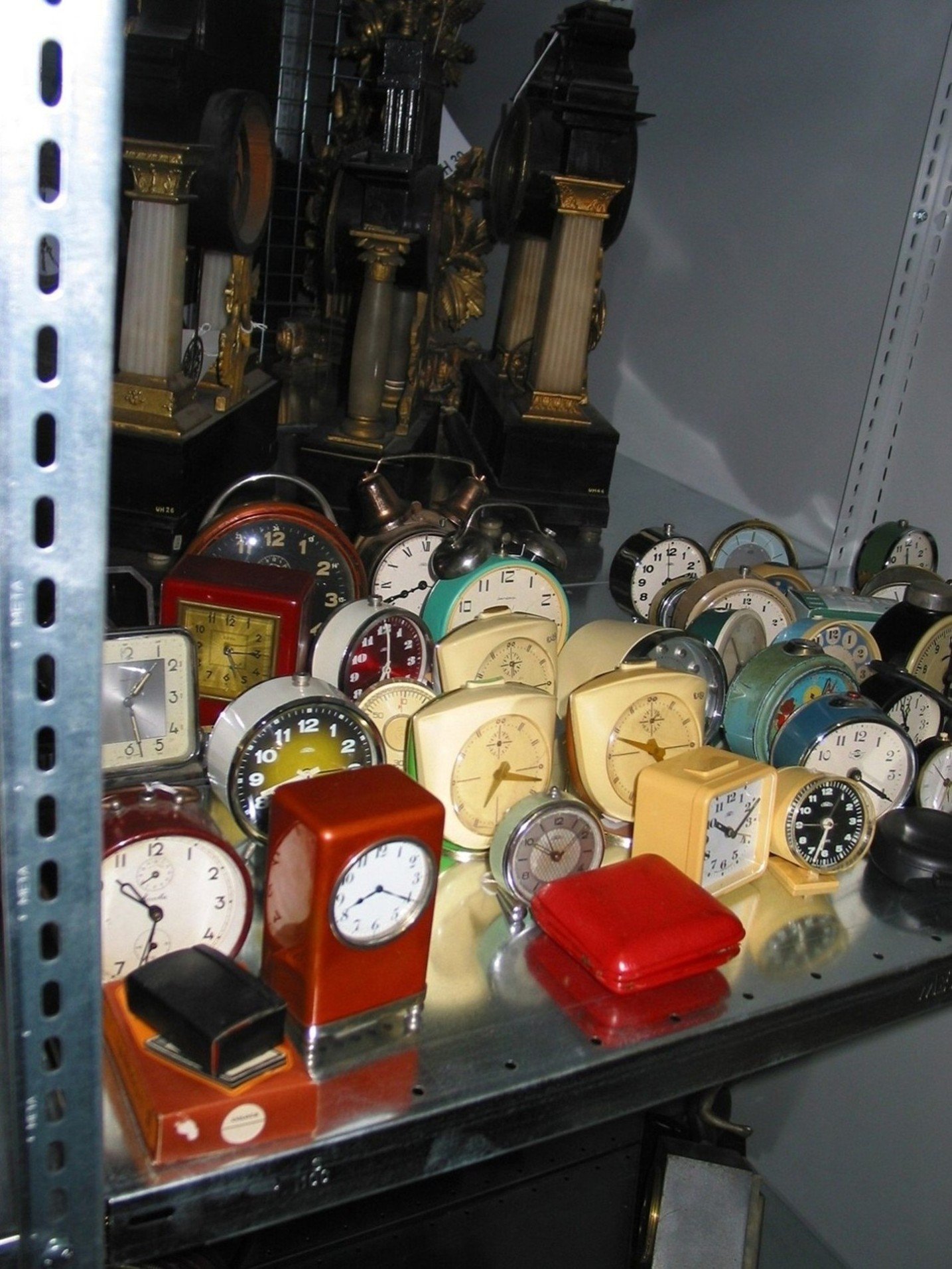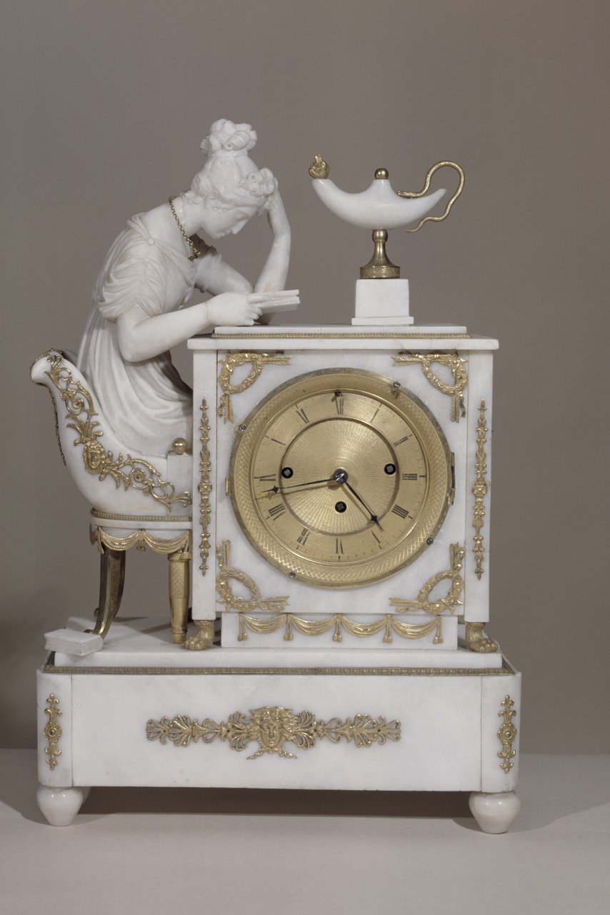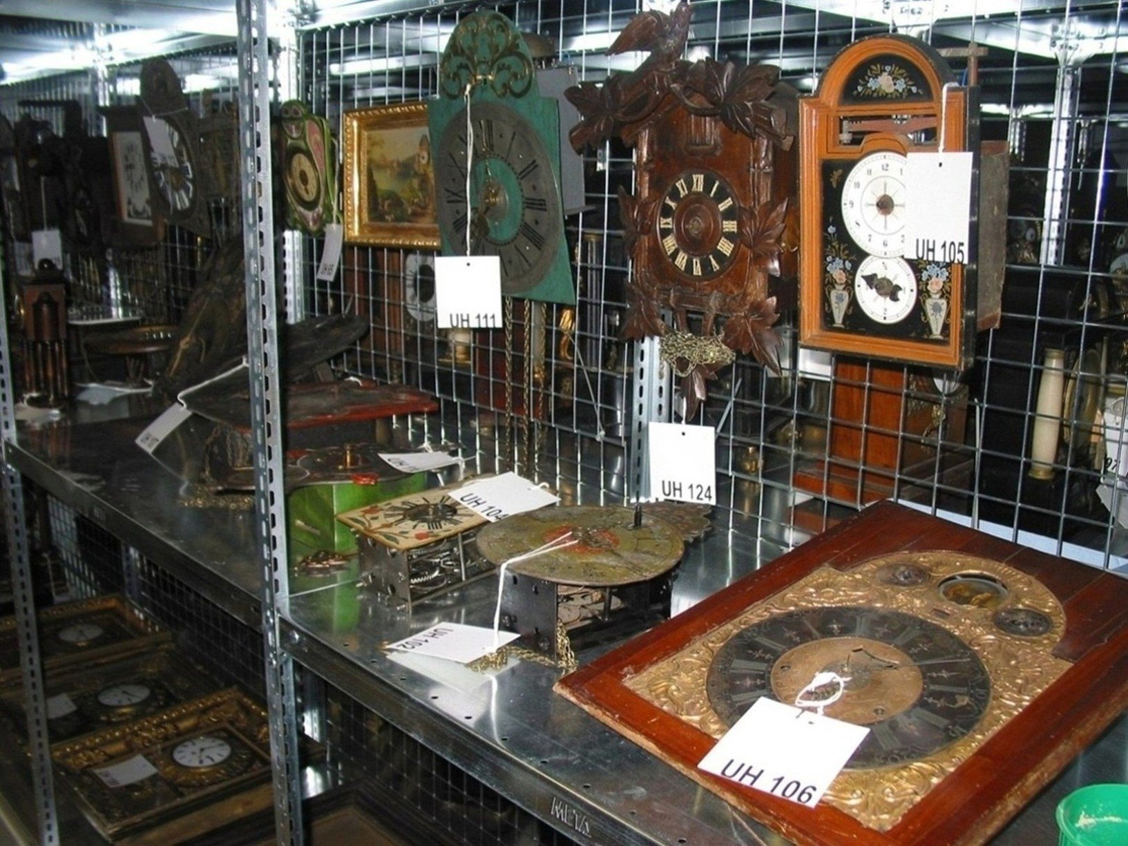 Fotografie z uložení sbírky Umělecké hodiny UH308: Náramkové hodinky, zn. Poljot, SSSR, 70. léta 20. století, mosaz, sklo, 3,6x4x1 cm UH94: Sloupkové hodiny, Čechy, Praha, strojek Ludwig Hainz, kolem 1860, chyrzonis?, mosaz, bronz, v. 39cm UH114: Nástěnné hodiny s dřevěným strojkem, Čechy, kolem 1800, dřevo, zrcadlo, sklo, v. 35 cm UH159: Skříňkové hodiny, Čechy, Praha, sign. Josef Kraus, kolem 1790, dřevo, mosaz, bronz, email, v. 46cm UH170: Horizontální hodiny, zn.Beniamin Zoll, Dantzig (Gdaňsk), 1720–30, mosaz, sklo, p. 11 cm UH233: Nástěnné hodiny, zn. Kienzle, Čechy, porcelán, dřevo, mosaz, kolem 1940, v. 39 cm UH242: Budík, zn. Prim, Čechy, kolem 1980, obecný kov, sklo, v. 10,5 cm UH246: Budík, zn. Slavia, SSSR, kolem 1970, obecný kov, sklo, v. 9 cm UH275: Budík, zn. Prim, Čechy, kolem 1970, obecný kov, sklo, v. 10,5 cm Fotografie z uložení sbírky Umělecké hodiny Fotografie z uložení sbírky Umělecké hodiny UH65: Nástěnné talířové hodiny, Čechy, kolem 1900, glazovaná keramika, mosaz, železo, v. 26cm UH88:Skříňkové hodiny, Čechy, kolem 1940, dřevo, mosaz, sklo, v. 17 cm UH91: Figurální hodiny, Německo, Míšeň, kolem 1790, porcelán, mosaz, v. 60cm UH95: Sloupkové hodiny, Francie, kolem 1830, mramor, mosaz, bronz, v. 40cm UH109: Nástěnné talířové hodiny, sign. Graupner, Německo, mosaz, kolem 1740, v. 25 cm UH134: Budík s pokladničkou, Německo, zn. JGEHA, kolem 1930, obecný kov lakovaný, sklo, v. 12 cm UH153: Stolní hodiny, Návrh Artur Berger, provedení Rudolf Souval,Rakousko, Vídeň, 1913, lakovaný obecný kov, perleť, sklo, v. 14 cm UH169: Stolní hodiny stylu UH180: Stolní hodiny, Německo, Lenzkirch, kolem 1915, bronz, mosaz, v. 41,5 cm UH200: Hodiny ve tvaru lucerny, Německo, Augsburg?, kolem 1680, železo, mosaz, měď, zčásti zlaceno, samet, v. 25 cm UH316: Nástěnné hodiny, zn. Weimar, Quarz, 80. léta 20. století, plast, obecný kov, p. 26,7 cm UH209: Sluneční hodiny, žlutý vápenec, Slovinsko, Lujblana?, 17.století, 43x43 cm UH235: Nástěnné hodiny, neznačeno, Čechy?, poč. 20. století, dřevo, mosaz, v. 67 cm UH238: Budík, zn. Gustav Becker, Německo, kolem 1920, obecný kov, sklo, v. 19 cm UH240: Budík, zn. Junghans, Čechy, kolem 1910, obecný kov, sklo, dřevo, v. 16,8 cm UH247: Budík, zn. Prim, Čechy, 70. léta 20.století, plast, obecný kov, sklo, v. 10 cm