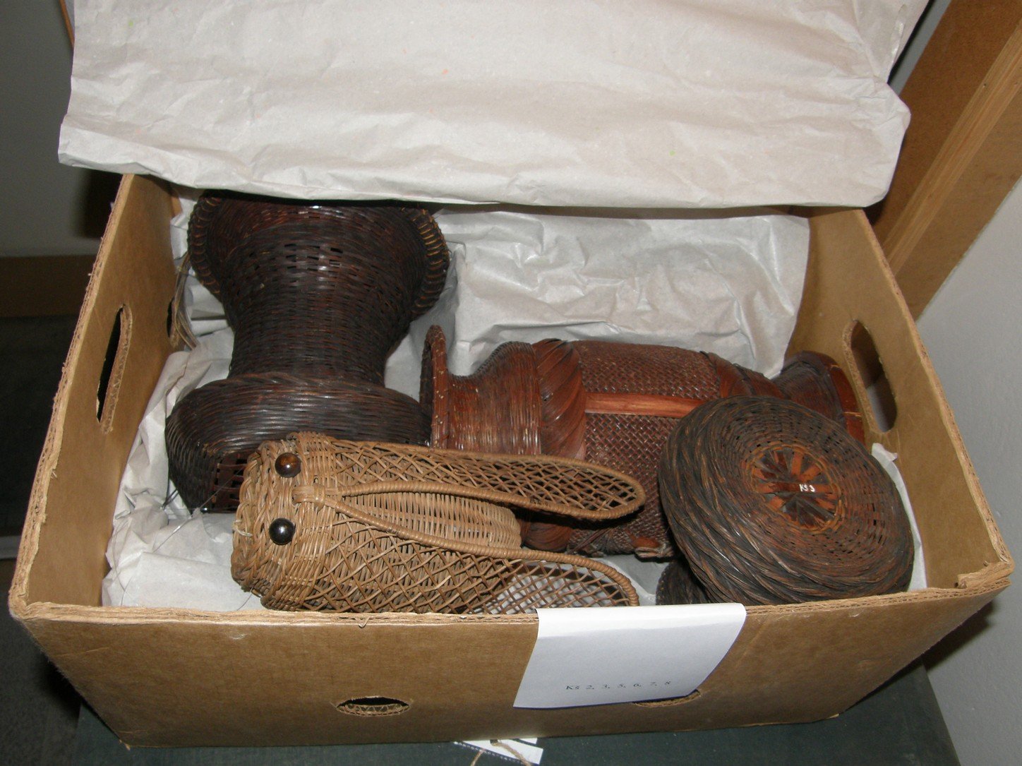 Ks001: váza, mořený bambus, košíkářská technika, 4. čtvrtina 19. století, Japonsko Ks006: závěsný košík, tropické traviny, košíkářská technika, 4. čtvrtina 19. století, Japonsko Ks007: váza, mořené březové loubky, košíkářská technika, 4. čtvrtina 19. století, Japonsko Ks008: váza, mořený bambus, košíkářská technika, 4. čtvrtina 19. století, Japonsko Ks013: závěsný košík, mořený bambus, košíkářská technika, 4. čtvrtina 19. století, Japonsko Ks016: košík s vysokým uchem, rotang, košíkářská technika, 4. čtvrtina 19. století, Japonsko Ks017: košík s vysokým uchem, mořený rotang, košíkářská technika, 4. čtvrtina 19. století, Japonsko Ks026-031: krabičky s víčky, sláma, intarzie, 1873, Čína Ks034: košík s víkem, štípaný bambus, košíkářská technika, 1873, Čína Ks036: košík s víkem a uchem, bambus, košíkářská technika, 1873, Čína Uložení košíků v krabici Ks038: košík s víkem, štípaný bambus, košíkářská technika, 1873, Čína Ks043: košík s uchem, štípaný bambus, košíkářská technika, 4. čtvrtina 19. století, Japonsko Ks091: krabička s víčkem, dřevo, sláma, intarzie, 1873, Japonsko Ks003: závěsný košík, mořený bambus, košíkářská technika, 4. čtvrtina 19. století, Japonsko Ks010: váza se dvěma uchy, mořený bambus, košíkářská technika, 4. čtvrtina 19. století, Japonsko Ks011: závěsný košík, tropické traviny, bambus, košíkářská technika, 4. čtvrtina 19. století, Japonsko Ks033: krabička s víčkem, dřevo, sláma, intarzie, 1873, Japonsko Ks035: krabička s víčkem, proplétané pásy slámy, 1873, Čína Uložení košíků v polici Uložení košíků v krabici Ks064: ošatka, přírodní a barvený papyrus, speciální technika, 19. století, Evropa Ks058: košík na ruční práce, tropické traviny, bavlna, dřevo, 19. století, Čechy Ks067: prostírka, přírodní a barvený papyrus, vazba plátnová, 19. století, Evropa Ks068: prostírka, papyrus, vazba rypsová, 19. století, Japonsko Ks069: baňatá nádoba, papyrus, speciální technika 19. století, Evropa Ks074: podnos, rotang, ořechové dřevo, len, sklo, košíkářská technika, paličkovaná krajka, 1914, Rakousko-Uhersko Ks075: podnos, rotang, dřevo, len, sklo, košíkářská technika, paličkovaná krajka, 1914, Rakousko