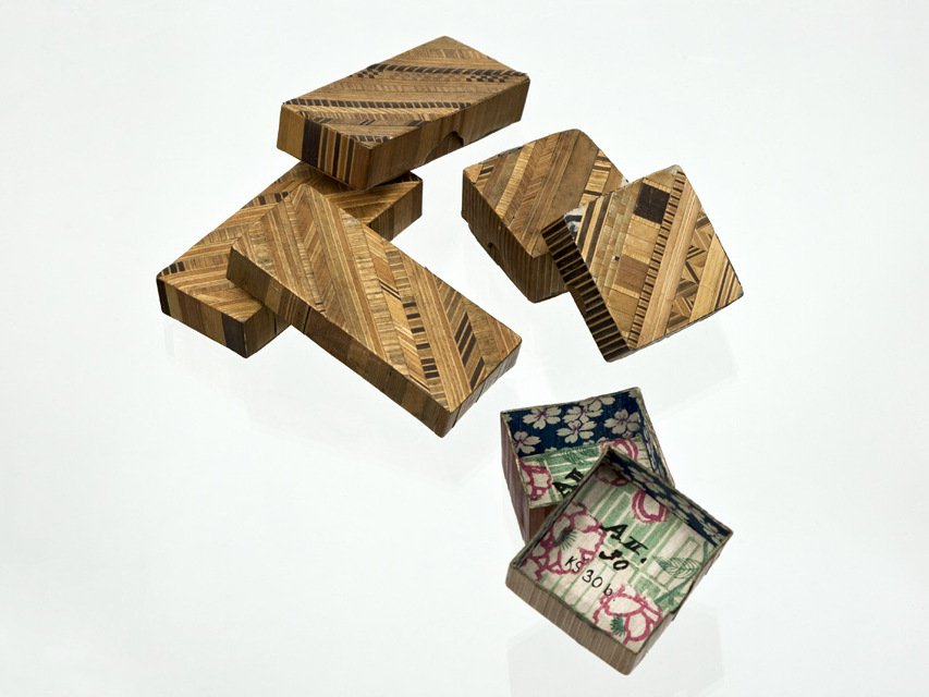 Období19. až 20. století.Soubor intarzovaných krabiček byl zakoupen r. 1873 na Světové výstavě ve Vídni, v době založení muzea, převážná část japonských košíků, váz a dóz byla koupena v letech 1886 a 1887 od muzea v Hamburku a od R. Wagnera z Berlína, další skupina japonských dóz a košíků byla získána darem od dolnorakouského průmyslového spolku ve Vídni prostřednictvím Ústavu slepců na Klárově v Praze.