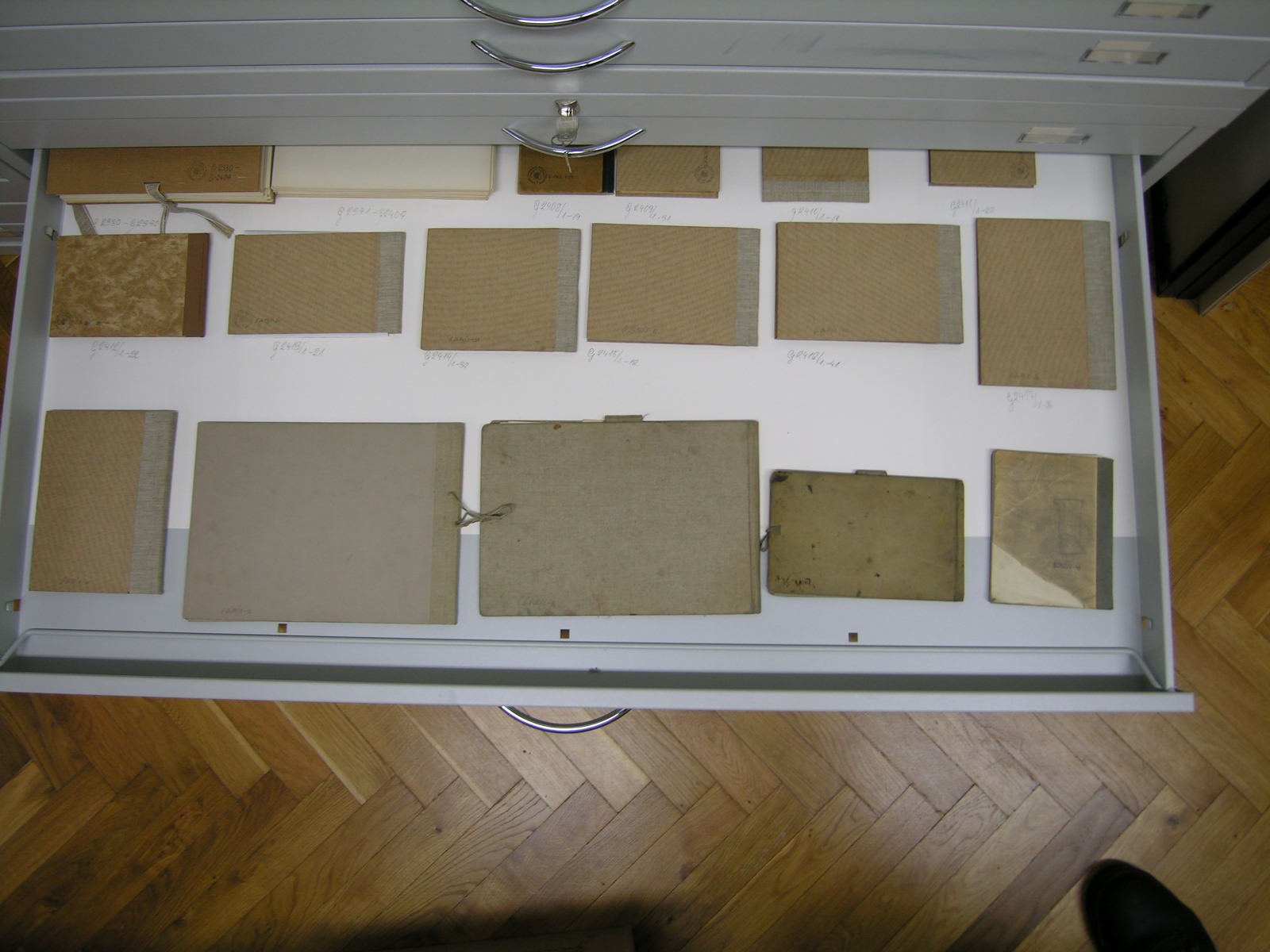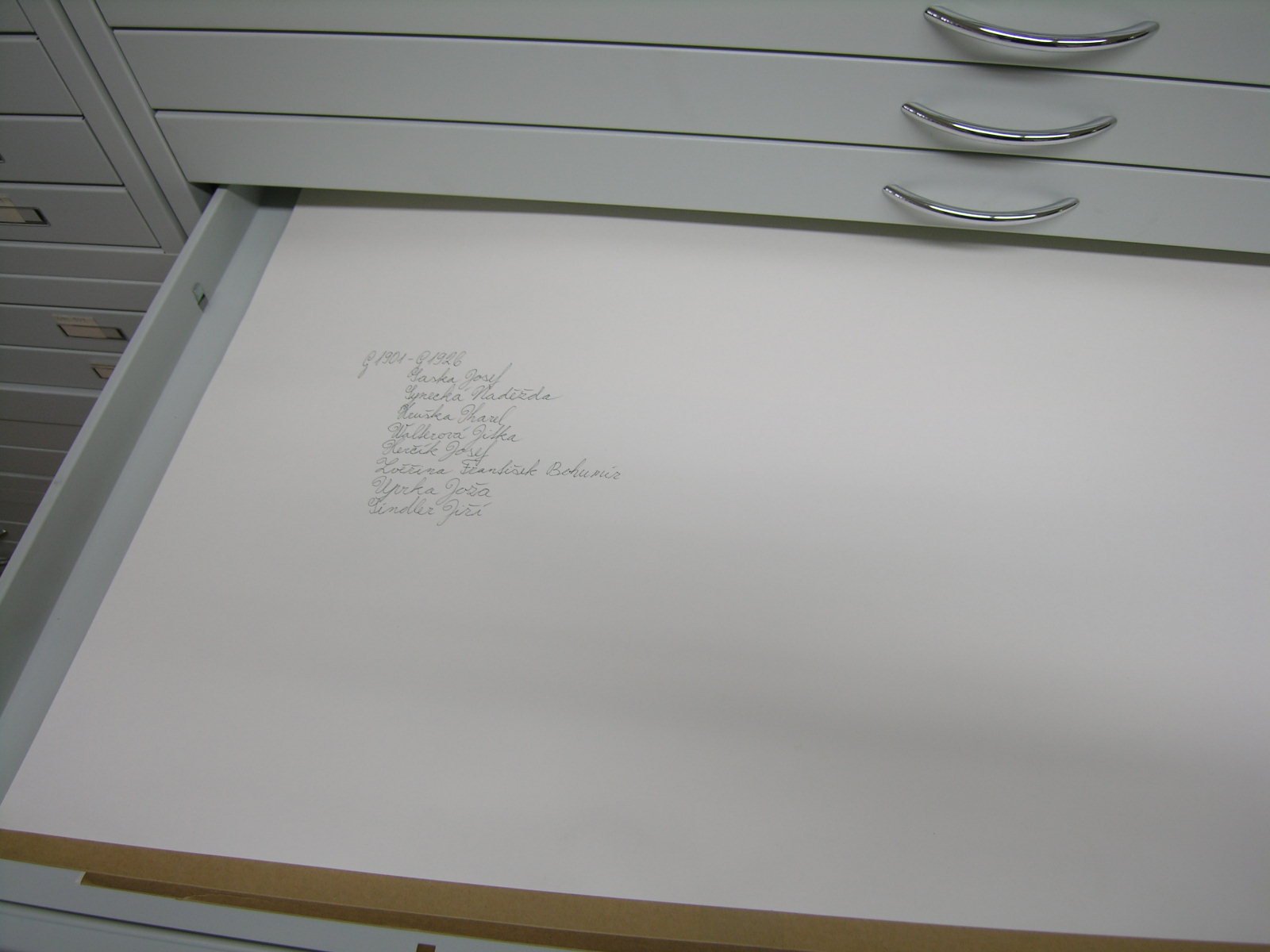 Němec Karel, Hejkal  z cyklu Pištělka Petr, Bratr plukovník R. M., litografie, papír, 405x302 mm, převod ze sbírkového fondu bývalého spolku SVUM, 1922, G107. Votruba Jaroslav, Starý větrný mlýn, dřevoryt, papír, 501x568 mm, převod ze sbírkového fondu bývalého spolku SVUM, nedatováno, G210. Měšťánek Tomáš, Ateliér (triptych), pastel, papír, 1000x700 mm, 2004, koupě 2005, G2318/3. Ondrůšek František, List ze skicáku, kresba sochy ženského torza, tužka, papír, 318x210 mm, převod ze sbírkového fondu bývalého spolku SVUM, nedatováno, G312. Ondrůšek František, List ze skicáku, nevyužito, 318x210 mm, převod ze sbírkového fondu bývalého spolku SVUM, nedatováno,  G312 zadní strana listu. Ondrůšek František, List ze skicáku, portrét muže, studie ženského aktu, tužka, papír, 318x210 mm, převod ze sbírkového fondu bývalého spolku SVUM, nedatováno, G314. Ondrušek František, List ze skicáku, nevyužito, 318x210 mm, převod ze sbírkového fondu bývalého spolku SVUM, nedatováno, G314 zadní strana listu. Ondrůšek František, List ze skicáku, Studie ženského aktu, tužka, papír, 318x210 mm, převod ze sbírkového fondu bývalého spolku SVUM, nedatováno, G316. Ondrůšek František, List ze skicáku, Studie sedícího muže, tužka, papír, 318x210 mm, převod ze sbírkového fondu bývalého spolku SVUM, nedatováno, G317 zadní strana listu. Ondrůšek František, List ze skicáku, Studie mužského aktu, tužka, papír, 318x210 mm, převod ze sbírkového fondu bývalého spolku SVUM, nedatováno, G319 zadní strana listu. Ondrůšek František, List ze skicáku, Studie ženského aktu, tužka, papír, 318x210 mm, převod ze sbírkového fondu bývalého spolku SVUM, nedatováno, G320 zadní strana listu. Ondrůšek František, List ze skicáku, Studie ženského aktu, tužka, papír, 318x210 mm, převod ze sbírkového fondu bývalého spolku SVUM, nedatováno, G322 zadní strana listu. Ondrůšek František, List ze skicáku, Studie ženského aktu, tužka, papír, 318x210 mm, převod ze sbírkového fondu bývalého spolku SVUM, nedatováno, G325 zadní strana listu. Ondrůšek František, List ze skicáku, Studie ženského aktu, tužka, papír, 318x210 mm, převod ze sbírkového fondu bývalého spolku SVUM, nedatováno, G328. Ondrušek František, List ze skicáku, nevyužito, 318x210 mm, převod ze sbírkového fondu bývalého spolku SVUM, nedatováno, G329. Ondrůšek František, List ze skicáku, Studie ženského aktu, tužka, papír, 318x210 mm, převod ze sbírkového fondu bývalého spolku SVUM, nedatováno, G330 zadní strana listu. Ondrůšek František, List ze skicáku, Studie ženského aktu, tužka, papír, 318x210 mm, převod ze sbírkového fondu bývalého spolku SVUM, nedatováno, G331. Ondrůšek František, List ze skicáku, Studie mužského aktu, tužka, papír, 318x210 mm, převod ze sbírkového fondu bývalého spolku SVUM, nedatováno, G332. Ondrůšek František, List ze skicáku, Studie mužského aktu, tužka, papír, 318x210 mm, převod ze sbírkového fondu bývalého spolku SVUM, nedatováno, G333. Ondrůšek František, List ze skicáku, Studie ženského aktu, tužka, papír, 318x210 mm, převod ze sbírkového fondu bývalého spolku SVUM, nedatováno, G334 zadní strana listu. Ondrůšek František, List ze skicáku, Studie mužského aktu, rudka, papír, 318x210 mm, převod ze sbírkového fondu bývalého spolku SVUM, nedatováno, G335. Ondrůšek František, List ze skicáku, Studie mužského aktu, rudka, papír, 318x210 mm, převod ze sbírkového fondu bývalého spolku SVUM, nedatováno, G336 zadní strana listu. Ondrůšek František, List ze skicáku, Studie mužského aktu, rudka, papír, 318x210 mm, převod ze sbírkového fondu bývalého spolku SVUM, nedatováno, G337. Ondrůšek František, List ze skicáku, Studie mužského aktu, rudka, papír, 318x210 mm,převod ze sbírkového fondu bývalého spolku SVUM, nedatováno, G338. Depozitář podsbírky Grafika. V téže místnosti je také depozitář podsbírky Fotografie. Uložení skicáků a slohy. Depozitář podsbírky Grafika. V téže místnosti je také depozitář podsbírky Fotografie. Uložení slohy. Depozitář podsbírky Grafika. V téže místnosti je také depozitář podsbírky Fotografie. Uložení skicáků. Depozitář podsbírky Grafika. Celkový pohled.V téže místnosti je také depozitář podsbírky Fotografie. Okno v depozitáři má skla opatřené fólií s UV filtrem. Kovařík Hubert, Náš lid, litografie, papír, 160x200 mm, dar od soukromé osoby, 1942, G493. Uprka Joža, Děvče, lept, papír, 156x91 mm, nedatováno, koupě 1973, G1205. Švabinský Max, Diana, lept, papír, 441x350 mm, nedatováno, koupě 1976, G1450. Urban Cyril, Krajina III., suchá jehla, papír, 246x194 mm, nedatováno, koupě 1977, G1522. Uprka Joža, Slovácká madona, akvarel, papír, 435x570 mm, převod ze sbírkového fondu bývalého spolku SVUM, nedatováno, G413. Jaroněk Bohumír, Pod borovicemi, barevný dřevoryt, papír, 355x520 mm, převod ze sbírkového fondu bývalého spolku SVUM, nedatováno, G410. Kovařík Hubert, Koncentrační tábor, lept, papír, 240x195 mm, dar od soukromé osoby, nedatováno, G481a. Hrabal Arnošt, Posed v lese, litografie, papír,  200x260 mm, 1924, koupě 1980, G1578. Anderle Jiří, Komedie VII., barevná suchá jehla, papír, 640x495 mm, převod z Ministerstva kultury a informací, nedatováno, G836. Holoubek Jan, Zemědělská krajina, linoryt, papír, 496x593 mm, 1980, převod z Ministerstva kultury, G1735. Měšťánek Tomáš, Chodba (triptych), pastel, papír, 1000x700 mm, 2004, koupě 2005, G2319/1. Uprka Joža, Hudec, lept, papír, 177x100 mm, nedatováno, koupě 1973, G1206. Zvěřina František Bohumír, Slepý guslár, kresba perem, papír, 265x456 mm, nedatováno, koupě 1973, G1442. Němec Karel, Maršovice, dřevoryt, papír, 185x241 mm, přev