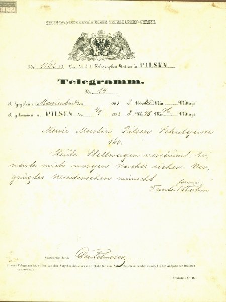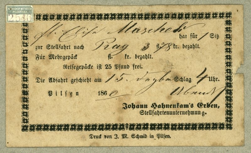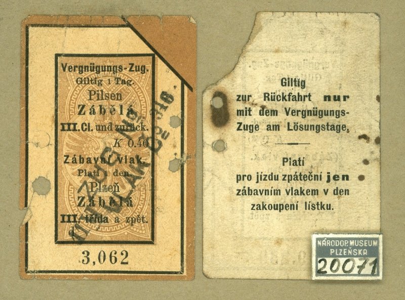 Depozitář fondu Textil lidový NMP 1402 Plena chodská z bílého plátna. Motivy vyšity bílou bavlnkou, zdobeno paličkovanou krajkou.  Chodsko, přelom 19. a 20. století. NMP 2284 Peněženka z červenohnědé kůže s ocelovým kováním, Plzeň, kolem roku 1880. NMP 2546 Lístek k jízdě dostavníkem firmy Joh. Hahnenkam, 1860. NMP 3670 Dvě náušnice z oválných kostěných destiček s vyřezanými hrady a červeným rámečkem. Zapuštěné do ocelového věnečku z buillonu a ocelových perliček. 19. století. NMP 6134 Telegram z plzeňské pošty, 1863. NMP 9558 Černobílá fotografie, Masopust v Bílově u Kralovic. Polovina 20. století. NMP 11253 kniha tištěná: Herbář pro lidi. Vydáno u Jana Ryppla v Jihlavě roku 1830. Převázáno v pevné kartonové vazbě, 175 stran. NMP 16275 Kovářské vývěsní znamení, ze Šťáhlav, kolem roku 1850. NMP 19760 Pískovcová nádrž k fontáně, zdobená stylizovanými reliéfy andělů, Plzeň, 2. polovina 19. století. NMP 23716 Okovaná kraslice z vyfouknutého vejce. Na plášti 3 podkovy, nahoře a dole ozdoba a závěs. Kování pozlaceno. Chocenická Lhota, přelom 19. a 20. století. Depozitář fondu  Památky obchodní Depozitář fondů Hudebniny a Písemnosti L 669 Reklamní plakát na čaj s nápisem L 894 Plechový límec k uvázání k pranýři, se zámečkem a hrotitým okrajem. Na čelní straně z plechu řezaná písmena IM a odznak sladovnický, datace neuvedena, Plzeň. NMP 792 Skříň z měkkého dřeva, jednokřídlová, se skosenými hranami. Dole zásuvka, nohy hranaté, římsa profil. Malba žlutohnědá, mramorovaná. v.188 cm, s.105 cm, h.47 cm. Červený Hrádek, 19. století. NMP 63959 Panenka oblečená do dětských šatiček se slaměným kloboučkem a vlasy spletenými do copů, počátek 20. století. NMP 65421 Dokumentární film o řezbáři a loutkáři Gustavu Noskovi. 16 mm. Autor Karel Zeman, 1966. NMP 70716 Komoda s nástavcem vcelku, Součást souboru barokního nábytku z tvrdého dřeva, leštěného hnědě. NMP 72736 Kočárek hluboký, tzv. košatina, z bílého pedigu. Podvozek chromovaný s péry, kolečka s pryží po obvodu. 20. století. NMP 75930 Utírátko na pero v podobě vztyčené dlaně ze železa, s vlněnými kanýry, 70. léta 19. století. NMP 1574 Pozvánka tištěná na kartonu, Ples I. Českého spolku vojenských vysloužilců korunního prince Rudolfa v Plzni, 1911. NMP 2482 jehlice mosazná, plochá, k čepení, mírně obloukovitá, s hlavicí ozdobně vykrajovanou. Povrch s vybíjeným ornamentem, Plzeňsko, přelom 19. a 20. století. NMP 2574 Dřevořezba sv. Pavla z lipového dřeva. V průběhu času zbavena původní polychromie, Plzeňsko, 15. století. NMP 2829 Šicí stroj k postavení na stůl s ručním pohonem, cca 60. léta 19. stol. d 42 cm, s 19 cm. NMP 3197 Figura v podobě ženy nesoucí dva květináče jako koše, z červené hlíny, žlutě a hnědě malovaná a glazovaná. Zhotovil Martin Fremr, hrnčíř v Losiné. V 36 cm. NMP 3753 Vosková svíčka zvaná sloupek, kulatá s plastickou ozdobou z květin a zlacením. Plzeňsko, 19. století. NMP 4688 kniha tištěná v černé kožené vazbě, František Jeřábek, Praha, 1798. s dřevoryty, 467 stran a rejstřík, 8,5 x 10 cm. NMP 8028 Olejomalba na plátně, portrét plzeňského řezbáře Václava Herschera, kolem roku 1750, Plzeň. NMP 8179 Soubor skladeb z pozůstalosti Václava Huttera, ředitele školy v Plzni, titul: Generalbasz Uebungsstücke von Segert(...), opis 1848 Wenzel Hutter, formát 4° na šířku, 60 stran ve 4 sešitech. NMP 10412 Školní brašna, lepenka polepená černým plátnem, Plzeň, kolem roku 1860. NMP 10876 Receptář pro domáckou přípravu a užívání nejrůznějších léčiv. Rukopisná kniha bez titulního listu, měkké kartonové desky, 228 stran. Plzeňsko, kolem roku 1830. NMP 11421 Miniaturní pražička na kávové vzorky. Válec vodorovně položený, vsazený do poloválce pro líh, na dřevěném podstavci. v.15 cm. Plzeň, 3. třetina 19. století. NMP 13282 Mosazný chanukový svícen (chanukije) s osmi kalichy na svíčky. Po stranách dva přídavné kalichy. Na pozadí stylizované ztvárnění dvou jelínků. Konec 19. století. NMP 16519 Džbánek ze světle šedé hlíny kuželovitého rovného tvaru, bíle polévaný, na plášti reliéf Piety z Přeštic. Na dně rýpaná značka MS 1903. Práce hrnčíře M. Šmída v Přešticích. V 19 cm. NMP 18717 Pošetka - Housličky tanečního mistra úzkého tvaru. Stavba nástroje K. B. Dvořák, řezby neznámý autor, 1895, Praha. NMP 20071 Železniční lístky do Zábělé k nedělním jízdám, Plzeň, kolem roku 1900. NMP 70899 Vysoušeč vlasů elektrický šnekovitého tvaru, z bílého kovu, značka Edu III, 30. léta 20. století. NMP 20292 Slunečník s kostěným držadlem, potah ze žluté látky a krajkoviny. Při okraji krajkové volány. Držadlo bílé, kostěné. Plzeň, 19. století.  NMP 22518 Přístroj k domácí výrobě zmrzliny. Plechový válec s víkem, uvnitř vložky se sítem. Plzeň, přelom 19. a 20. století. NMP 24657 Podrážky z kousků kůže, z válkou poznamenané výroby let 1914 – 1918. Nalepeno na papírovém kartonu. NMP 26014 Diplom Spolku přátel vědy a literatury české v Plzni, udělený čestnému členu Karlu Klostermannovi. Plzeň, 1912. NMP 26053 Řezaná dřevorytová deska plzeňského grafika a malíře Karla Koubka (1896 – 1940) s motivem pomníku Mistra Jana Husa na Staroměstského náměstí v Praze. 30. léta 20. století. NMP 39364 Pečeť opata kláštera premonstrátů v Teplé v dřevěné soustruhované schránce s širokou hedvábnou stuhou. 1. polovina 19. století. NMP 41646 Vějíř skládací s textilním listem. Aversová strana je zdobena kvašovou malbou růžových a bílých květů doplněných lístky. Žebra (12+2) dřevěná, černě lakovaná. 80. léta 19. století. NMP 44883 Krucifix 