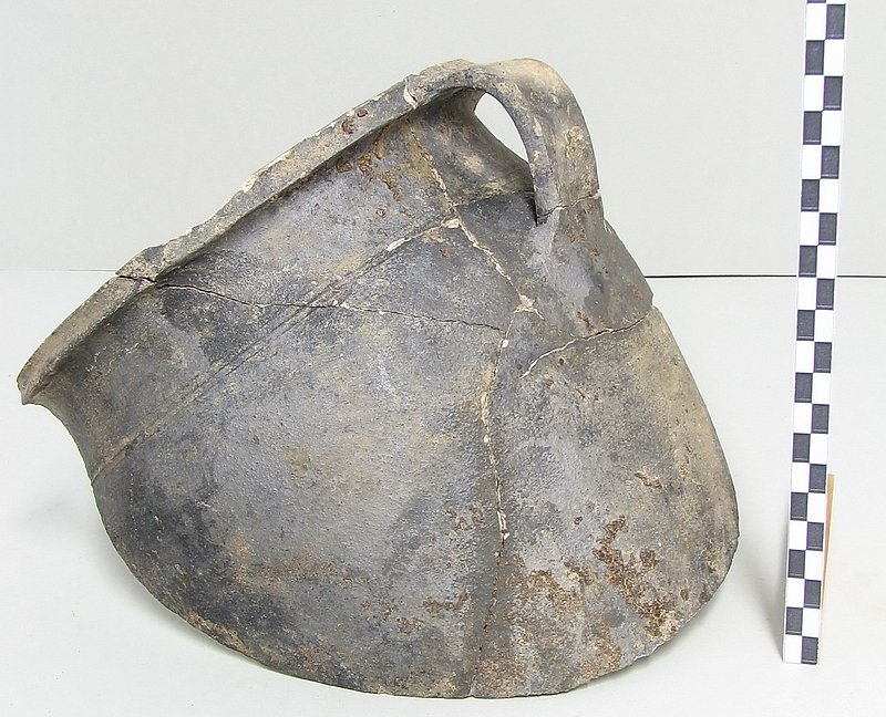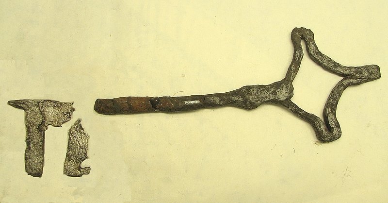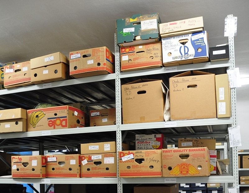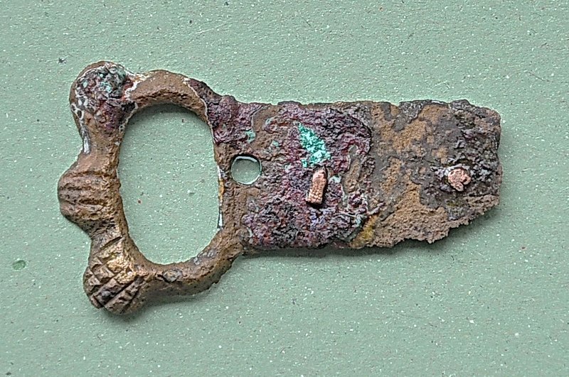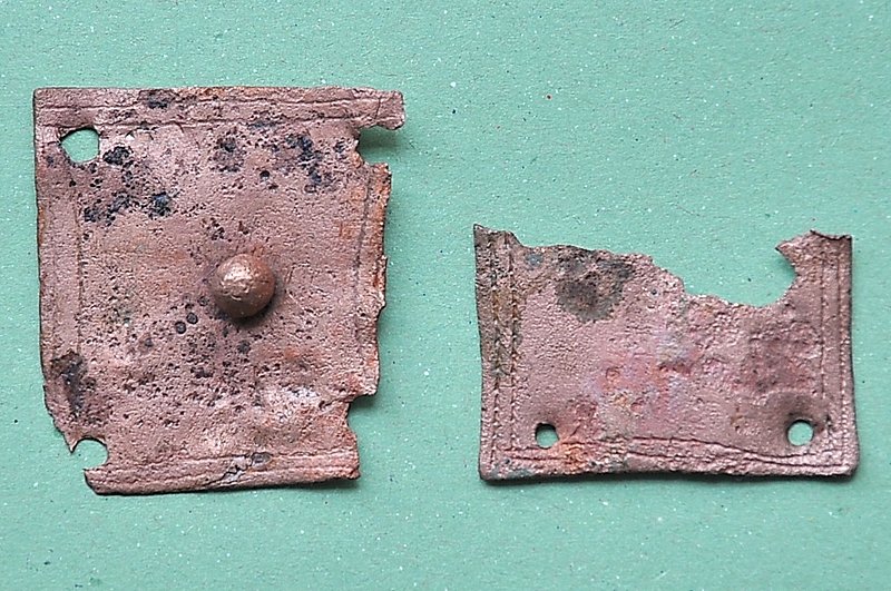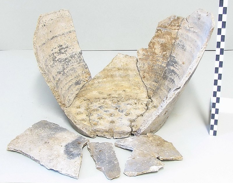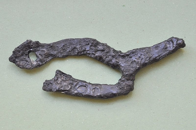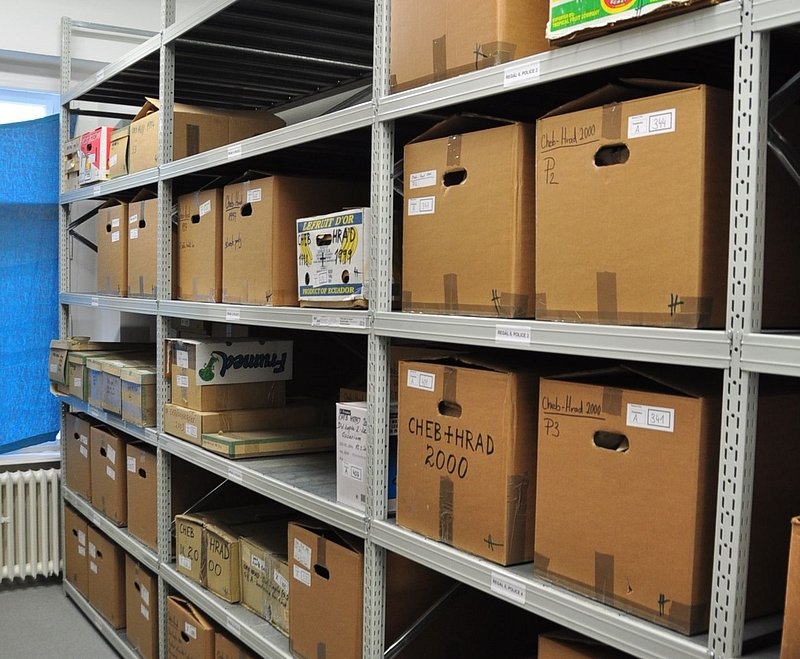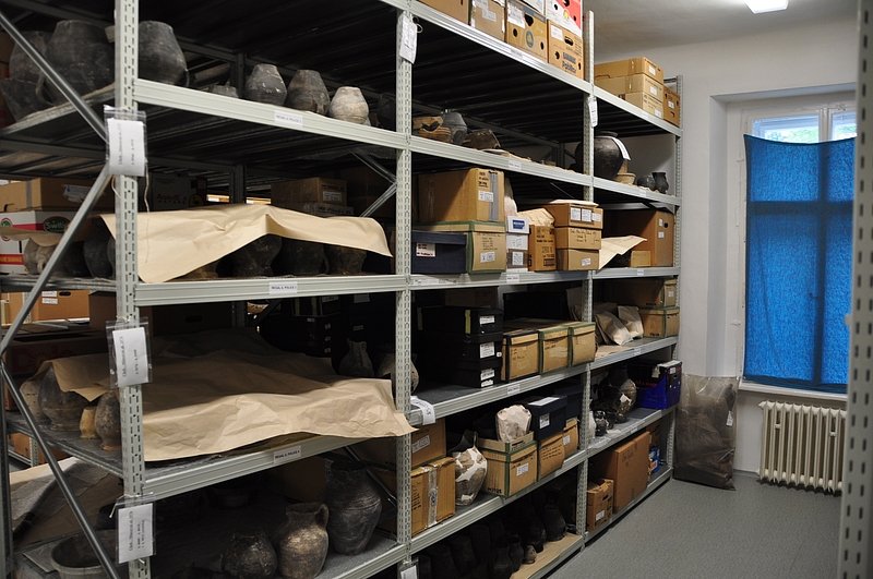 A1719 - Bronzová přezka s rytou výzdobou po celém obvodu šrafy, na štítku dvojhlavý orel - zdobení niellem. A6559 - V celku dochovaná silná stříbrná záušnice. A6569 - Závorová nezdobená kruhová přezka s dochovaným trnem. A6581 - V celku dochovaný tordovaný prsten neuzavřený. A6639 - Mosazná přezka závorová s příčně oválným rámečkem, pevně spojeným s příchytnou destičkou, rámeček na vnější straně opatřen třemi oválnými výčnělky, zdobenými rýhami. A6645 - Dřevěná destička obdélníkového tvaru, na jednom konci zúžená. A6647 - Dřevěná destička ve tvaru jehlanu s čtvercovou základnou o straně 30 mm s plochou špičkou, rub i povrch hladký, narušen pouze přirozenou strukturou dřeva. A6666 - Část obloukové ostruhy s ploténkami; dlouhý bodec dochovaný jen zčásti, jedna ploténka odlomena, jedno rameno ohnuté dovnitř.                                                                   A6668 - Část rámu závorové přezky ve tvaru podkovy, oblouk zdobený sedmi žlábky; původně postříbřená.                                                                                                   A6682 - Ozdoba kruhového tvaru z pozlaceného měděného plíšku, plastický ornament ve tvaru čtyřlístku s výčnělky.                                                                                        A7019 - Keramický nočník, po lepení dochovaný z části, okraj je vodorovně vytažený obloukovitý.                                                                                                         A7037 - Keramický nočník, po lepení téměř dochovaný, okraj je vodorovně vytažený obloukovitý.                                                                                                           A7051 - Zlomek z těla silnostěnné nádoby, patrně zásobnice.                                                                                                                                             A7072 - Zlomek okraje kónické mísy s v malé míře dochovanými stěnami, okraj je vodorovně vyložený, mírně obloukovitě klenutý.                                                                           A7092 - Téměř zcela dochovaný keramický nočník, okraj je vodorovně vytažený plochý.                                                                                                                     A7096 - Spodní část většího silnostěnného hrncovitého cedníku.                                                                                                                                          A7119 - Zlomek horní okrajové části jednouchého hrnce, okraj je okruží s vnitřním prožlabením.                                                                                                          A7242 - Torzo rohového komorového renesančního kachle.                                                                                                                                                  A7246 - Zlomky z přední vyhřívací stěny komorového renesančního kachle.                                                                                                                                 A7273 - Železný středověký klíč, očko kosočtverečného tvaru se stranami dovnitř obloukovitě prolamovanými.                                                                                              Depozitář Archeologie - uložení předmětů v regálech a papírových bednách.                                                                                                                            A6556 - Stříbrná záušnice s esovitým zakončením z roztepaného drátu. A6563 - Bronzová sekerka s tulejkou a očkem. Pod okrajem tulejky plastická lišta, od ní vedou dolů plastická žebra. A6564 - Železný klíč se třemi zuby na čelní straně. Kroužek z roztepaného plechu, dutý dřík svinutý z plechu. A6571 - Část spony pravděpodobně z knižní vazby, zdobený výčnělek. A6640 - 2 ks měděných destičkovitých kování knihy, obdélníkový tvar, po obvodu zdobené dvojitou rýhou, jedna z nich je na vrchní straně opatřena kulovitým výčnělkem, v rozích otvory pro nýty. A6641 - Podlouhlé úzké kostěné obložení, lehce prohnuté, na jednom konci zúžené, na lícní straně středový žlábek, na rubu mnoho příčných rýh. A6646 - Kostěná destička ve tvaru jehlanu se čtvercovou základnou a plochým vrškem, základna destičky je vysoká 2 mm a lemovaná úzkým žlábkem, spodní strana a povrch destičky jsou hladké. A6665 - Čepel železného nože s řapem, zkorodovaná.                                                                                                                                                      A6667 - Železná čepel s řapem, břitva, řap přelomen.                                                                                                                                                    A6674 - Malý kamenný přeslen, vrtaný. Tvar komolého kužele, po obvodu zdobený třemi rýhami.                                                                                                             A6675 - Část kostěného obložení podlouhlého tvaru, mírně zahnuté, 12 malých vrtaných otvorů v podélné řadě s pravidelnými rozestupy cca. 2,5 cm na lícní straně množství úhlopříčných rýh.          A6677 - Čepel železné břitvy s řapem, zachovalá, lehce zkorodovaná.                                                                                                                                     A6692 - Hnojné vidle - kovová část, sestávající ze 3 hrotů, i násada ve velmi zachovalém stavu, násada a tulej kovové části v horní části lehce poškozeny.                                              A6733 - Úštěpový hrot