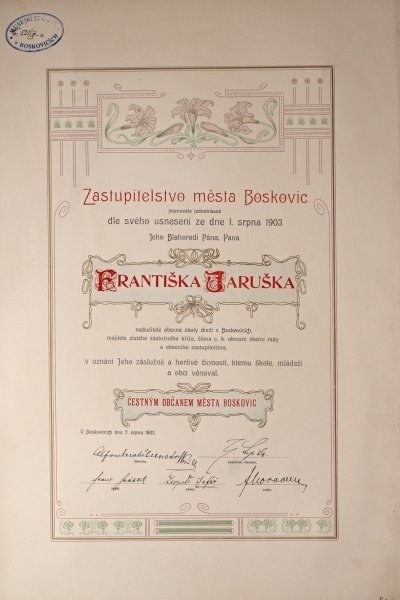 depozitář historický depozitář historický - obrazy depozitář historický depozitář historický depozitář historický - obrazy Ferule, boskovické rychtářské právo Cechovní korouhev obuvnického cechu, 19. stol. Plakát ONV v Boskovicích s výzvou občanům k zachování klidu, květen 1945 František Řehořek: Debatující muži, olej, plátno Otakar Kubín: Zátiší s ovocem, olej, plátno, 50. léta 20. stol. Prapor čtenářsko-zpěváckého spolku Velen, založeného roku 1863 Zámek s ozdobným kováním Štít hrnčířského cechu, olej, plátno, 1834 Jakob Alt: Vstup do Sloupské jeskyně, kolorovaná litografie, kol. 1850 Pohlednice zámku v Boskovicích, kol. 1910 Fotografie Otakara Kubína při práci, 50. léta 20. stol. Fotografie společenstva obuvníků, 1893 List s nebe, 19. století, nalezen v obecní truhlici ve Vratíkově Boskovická pravda, tiskovina vydávaná městským výborem KSČ v Boskovicích v roce 1968 a 1969 Faktura firmy Nathan Ultmann, Boskovice Album fotografií moravských učitelů věnované Petru Bílkovi, desky, 1870 „Za novou vesnici“, okresní zemědělské noviny Boskovicka vydávané ONV v Boskovicích, 1956 Pohlednice vydaná ke krajinské výstavě v Boskovicích 1912 Pavel Bačovský: Návštěva prezidenta Masaryka v Boskovicích, 16. 6. 1929, olej, plátno Portrét Františka Lipky, zakladatele Musejního spolku v Boskovicích a konzervátora Moravského musea, fotografie, atelier O. Čermák Založení dominikánského kláštera v Boskovicích posledními Zástřizlovci, olej plátno, konec 17. stol. Sv. Cyril a Metoděj, olej, plátno, J. Zelený, 1861, obraz na poutní prapor namalovaný „cyrilometodějským malířem“ na žádost boskovického kaplana L. Scholze při přípravách na cyrilometodějské miléniové Antonín Ferencz: Sv. Jakub, olej, plátno, 19. stol., sv. Jakub je patronem boskovického farního kostela Fotografie náměstí v Boskovicích, 1901 Jmenovací dekret pro Františka Jaruška čestným občanem města Boskovic, 1903 Cyklostylový leták z roku 1968