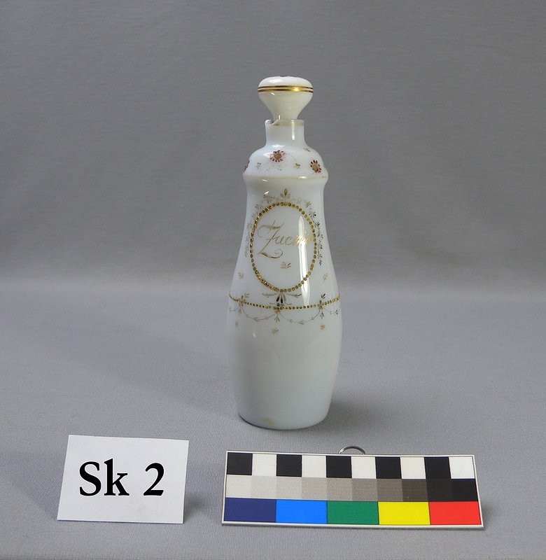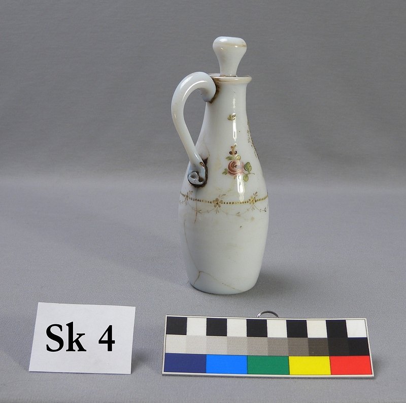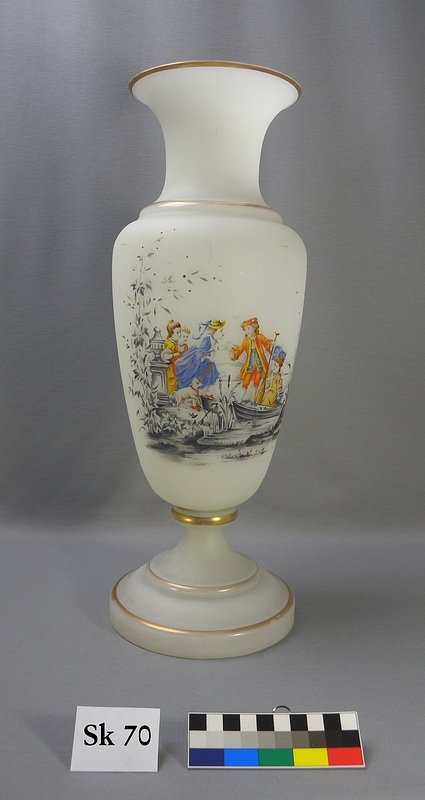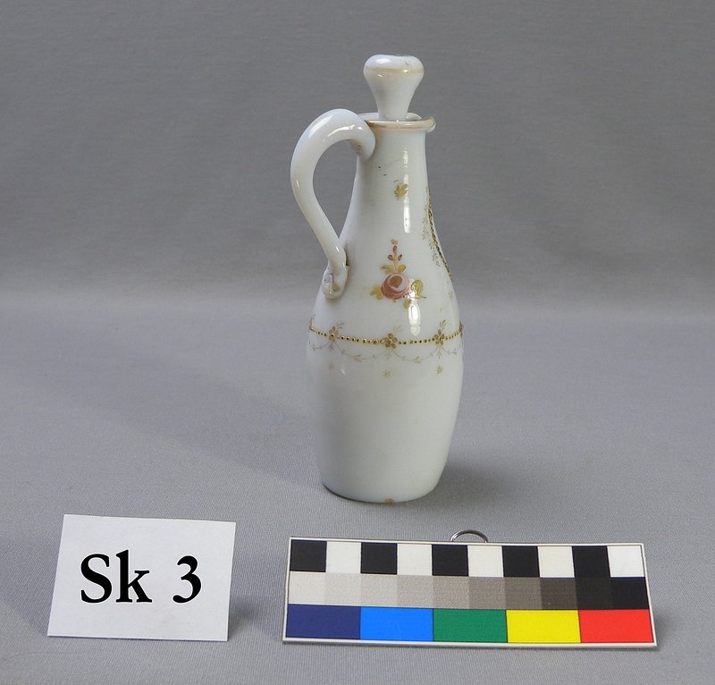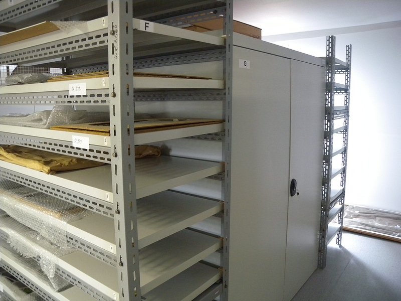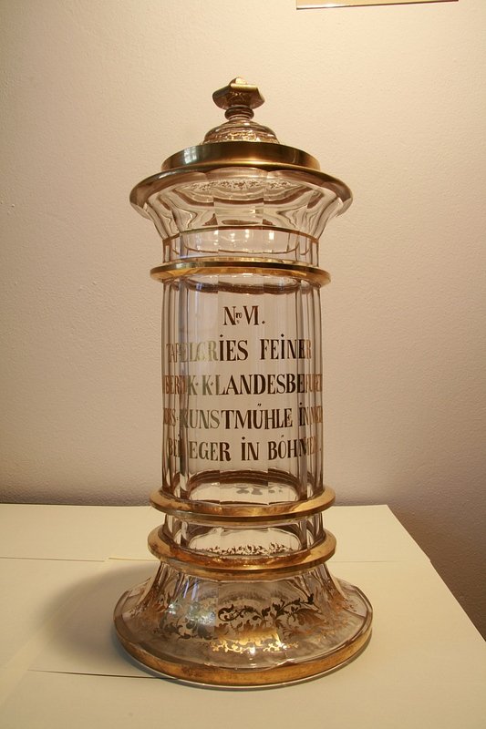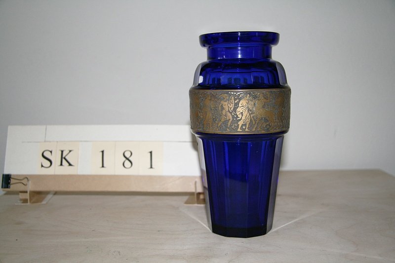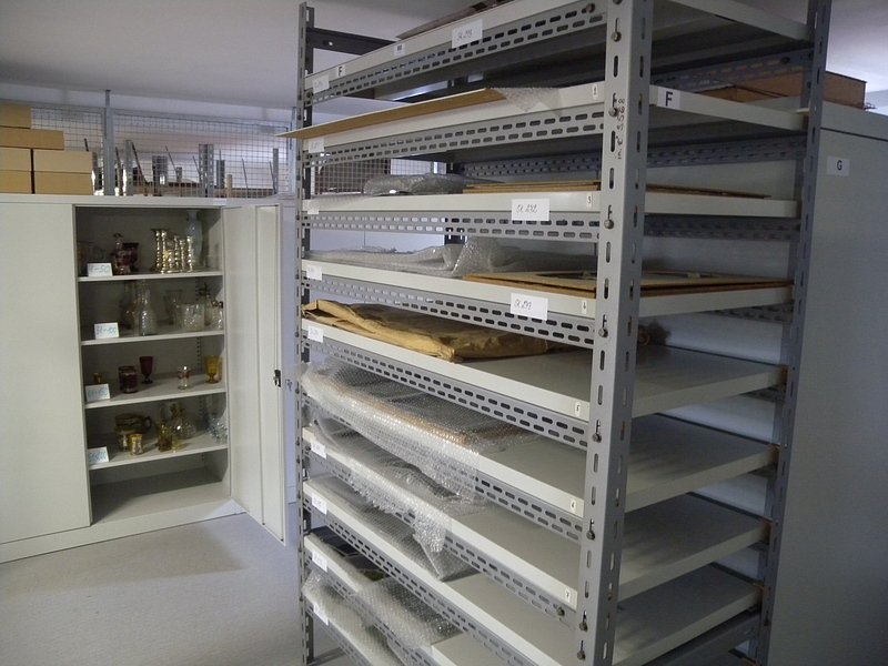 Uložení sbírkových předmětů v depozitáři. Uložení sbírkových předmětů v depozitáři. SK1 - Kořenka na pepř. Mléčné sklo, malba a zlacení, text: Pfeffer. Počátek 19. stol. Rozměr: v. 15,5 cm. SK 1 až SK 5 tvoří komplet. SK2 - Cukřenka z mléčného skla, malba a zlacení, text: Zucker. Počátek 19. stol., Rozměr:v. 17 cm. SK 1 až SK 5 tvoří komplet. SK3 - Kořenka - nádobka na ocet. Mléčné sklo, malba a zlacení, text: Essig. Počátek 19. stol. Rozměr: v. 16 cm. SK 1 až SK 5 tvoří komplet. SK4 - Kořenka - nádobka na olej. Mléčné sklo, malba a zlacení, text: Oel. Počátek 19. stol. Rozměr: v. 16,5 cm. SK 1 až SK 5 tvoří komplet. SK5 - Kořenka - nádobka na hořčici. Mléčné sklo, malba a zlacení, text: Senft. Počátek 19. stol. Rozměr: v. 16,5 cm. SK 1 až SK 5 tvoří komplet. SK20 - Holba z olovnatého skla se stříbrnou montáží. Víko zdobeno rytým ornamentem s iniciálou MJ a daty 22.11.1847 a 1897. Chebsko, 19. stol. Rozměr: v. 18 cm. SK49 - Svícen z dublovaného foukaného stíbřeného skla. Kolem 1850. Rozměr: v. 17,5 cm. SK56 - Secesní váza z nazelenalého ledového skla, leptaný domalovaný a zlacený florální dekor. Legras & Cie., Verreries de Saint-Denis, Le-Plaine-Saint-Denis, po 1900. Rozměr: v. 68 cm. SK58 - Výstavní pohár s víkem na kroupy z produkce C.k. zemského zámeckého parního mlýna v Mostově. Čiré foukané a broušené sklo malované zlatem. Čechy, 3. čtvrtina 19. stol.Rozměr: v. 36 cm. SK59 - Dekorativní pohár s víkem. Foukané lesní sklo, hutní nálepy, malba smaltem, zlacení. Sklárna hraběte Harracha, Nový Svět, po r. 1870. Rozměr: v. 59 cm. SK60 - Dekorativní pohár s víkem. Foukané lesní sklo, hutní nálepy, malba smaltem, zlacení. Sklárna hraběte Harracha, Nový Svět, po r. 1870. Rozměr: v. 59 cm. SK63 - Secesní váza z bezbarvého ledového skla, leptaný domalovaný a zlacený florální dekor. Legras & Cie., Verreries de Saint-Denis, Le-Plaine-Saint-Denis, po 1900. Značeno. Rozměr: v. 36 cm. SK69 - Váza antického tvaru, mléčné sklo, zdobeno malbou: rokokově laděná galantní scéna s míčovou hrou. Polevsko? Kolem r. 1815. Rozměr: v. 43 cm. SK70 - Váza antického tvaru, mléčné sklo, zdobeno malbou: rokokově laděná galantní scéna s loďkou na jezeře. Polevsko? Kolem r. 1815. Rozměr: v. 43 cm. SK81 - Secesní váze. Čiré sklo, hutně formováno, dekor candia, stříbrný iris.J. Lötz Wwe., Klášterský Mlýn, 1902. Rozměr: v. 43 cm. SK128 - Pohárek z dutého foukaného stříbřeného skla, na vnějším plášti bílá malba florálního dekoru. Vnitřní plášť zlacený. Rozměr: v. 13 cm. SK180 - Váza s volavkami a rajkami. Kobaltové sklo, Saphir. Fa Moser, návrh Rudolf Wels, Značeno: Czecho Slovakia Moser Karlsbad, 1922. SK181 - Váza s oroplastickým dekorem, kobaltové sklo, Saphir. Fa Moser, Karlovy Vary, kolem 1920. Rozměr: v. 21 cm. SK223 - Talíř z dublovaného skla, uprostřed vybrušovaná růžice. Konec 19. stol. Rozměr: průměr 17 cm. SK235 - Karafa z čirého skla, leptaný a řezaný florální ornament. 1. pol. 19. stol.? Rozměr: v. 35 cm. SK240 - Pohárek z dublovaného skla, na nožce, zdobeno zlaceným ornamentem. Karlovy Vary?, před 1850? Rozměr: v. 13 cm. SK280 - Vitraj. Barevné tabulové sklo, olovo. Christogram IHS. Cheb, kolem 1880? Rozměr: 81 x 56 cm. SK286 - Secesní vitraj s florálním motivem, z výzdoby obytné vily. Cheb, kol. 1905. Rozměr: 52 x 38 cm. SK318 - Váza s oroplastickým dekorem, kouřové sklo. Fa Moser, Karlovy Vary. Sign. Moser, 1982. Rozměr: v. 25 cm. SK326 - Pivní láhev s firemním značením R. GRILLMAYERS BRAUEREI EGER. Obsah 1 litr. Hnědé sklo. 1. pol. 20. stol. Rozměr: v. 32 cm. SK332 - Firemní půllitr 1. akciového pivovaru v Chebu. Čiré sklo, malba emailem: městský znak a text: Urbräu aus ersten Aktien der Brauerei Eger. 30. léta 20. stol. Rozměr: v. 14 cm. Uložení sbírkových předmětů v depozitáři. Uložení sbírkových předmětů v depozitáři.