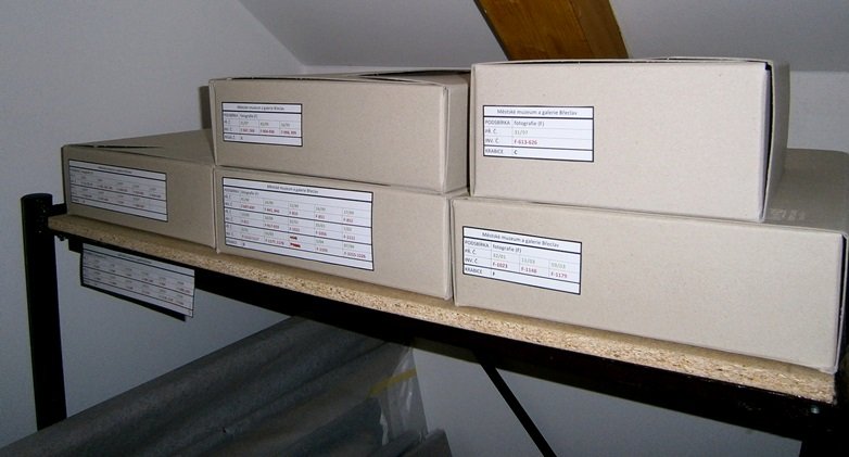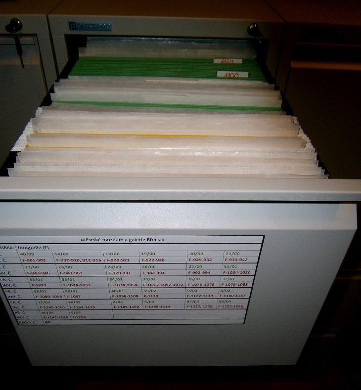Asanační práce po demoličním odstřelu částí Leninovy třídy (dnes ulice Jana Palacha), pohled od parku, fotograf Ladislav Dostál, Břeclav (fotografie, 15. června 1974) Odklízení trosek z věže kostela sv. Václava, který byl zničen náletem 20. listopadu 1944, náměstí v Břeclavi, v popředí věžní hodiny (fotografie, 1945) Povodně v Břeclavi, u podjezdu na Bratislavské ulici, pohled do ulice Mládežnická (fotografie, březen 1941) Pohled na břeclavský zámek, Vranův mlýn a dnes již neexistující Mariánský most, na pohlednici nápis: -Lundenburg - Marienbrücke-, prošlá poštou 20. 4. 1912 (pohlednice, 1912) Náměstí v Břeclavi, návštěva prezidenta ČSSR gen. Ludvíka Svobody, nastoupena čestná jednotka vojska, od dítěte dostává kytici (fotografie, 20. století: konec 60. let) Skupina vojáků C. a K. armády s puškami v kozlu (pohlednice, 1914) Kabinetní fotografie paní Haladyové (narozená 1906) ve slavnostním kroji, starobřeclavská varianta kroje (fotografie, 20. léta. století) Reprodukce obrazu Joži Úprky; Pohádka; (pohlednice, 30. - 40. léta 20. století) Foto zemského vojenského velitele pro Podkarpatskou Rus generála Josefa Šnejdárka (nar. 2. 4. 1875 v Napajedlech; zemřel 13. 5. 1945 v Casablance), pohlednice Systém uložení maloformátových pohlednic a fotografií. Složkový systém uložení podsbírky fotografií, filmů, videozáznamů a jiných médií. Dívka ve slavnostním kroji s názvem Boží muka za Starou Břeclavou, šohajka, krojovaný pár z Poštorné, dívka v lanžhotském kroji, krojová výšivka z Břeclavi. Autor Jan Halady, nakl. ABC Mikulov (pohlednice, 1997).  Způsob uložení větších fotografií do odkyselených krabic. Masarykova kasárna v Břeclavi. Nakl. firma B. Klos, Břeclav (pohlednice, 30. léta 20. století). Zámecká kaple, zámku, pohled přes Zámecký rybník a radnice na náměstí. Lednice. Autor František Vrbovský, Pravda Bratislava (pohlednice, 70. léta 20. století). Místa a obce na Břeclavsku. Kol. autorů, Press Foto ČTK Praha (pohlednice, 70. léta 20. století).  Kostel sv. Mikuláše v Tvrdonicích s detailem lunety nad vchodem kostela. Autor Petr Hříbňák, Proton design (pohlednice, 90. léta 20. století).  Novogotický kostel Nanebevzetí Panny Marie v Poštorné. Nakl. Hubert Cehák z Břeclavi (pohlednice, barvotisk, počátek 20. století). Kaple před břeclavským nádražím. Autor neznámý, (pohlednice, 40. léta 20. století). Břeclavský cukrovar, pohled z ulice Na Řádku. Nakl. Jan Hrdina (pohlednice, 30. léta 20. století). Břeclavský zámek, podle předlohy obrazu E. Kosy. Nakl. Krajinářské velkonakl. uměl. pohl. F. Kocman, Jedovnice, Moravský Kras (pohlednice, barvotisk, 30. léta 20. století).  Břeclavský zámek, pohled na zámek směrem od zimního stadionu. Nakl. Orbis (pohlednice, asi 30. léta 20. století).  Chlapec z Břeclavi v lidovém kroji. K. Hlobil, knihkupectví v Břeclavi (pohlednice). Lednice (minaret, zámek směrem od parku, zámek směrem od náměstí, park, zámecká kaple). B. Klos, obchod papírem Břeclav, nakl. Fototypia Vyškov (pohlednice, 20. léta 20. století).  Janův hrad u Lednice, pohled přes Černou Dyji. Nakl. Gustav Linhart, Knihkupectví Valtice (pohlednice, barvotisk, počátek 20. století).  50 let českého gymnázia v Břeclavi 1919-1969, archiv F. Hasila (pohlednice, 1969).  Kostel sv. Václava, kostel Nanebevzetí Panny Marie v Poštorné a ZŠ Dukelská, znak města Břeclavi. Autor neznámý, nakl. LH Veselí nad Moravou (pohlednice, 90. léta 20. století).  Moravské národní kroje Lanžhot, dvě dívky ve slavnostních krojích s rožky a šatkou (pohlednice, 30. léta 20. století)