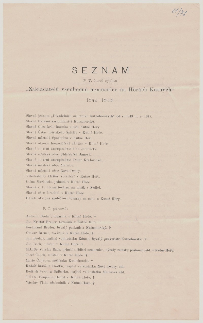 AR 73 - Diplom: Královská severská archeologická společnost přijala p. Jana Erasma Wocela, profesora na universitě v Praze, za svého řádného člena. Dáno v Kodani 18. prosince 1855. AR 92 - Diplom: Spolek vojenských vysloužilců pol. maršálka arcivévody Albrechta v Kutné Hoře jmenoval pana JUDr. Bedřicha Pacáka, zemského advokáta čestným členem. V Kutné Hoře, dne 13. března 1887 AR 106 - Čestné občanství: Slovutnému Pánu, panu JuDr. Bedřichu Pacákovi! Obecní zastupitelstvo ve svém zasedání dne 31. srpna 1894 jmenovalo Vás jednomyslně čestným občanem městečka Malešova. AR 258 - Seznam P. T. členů spolku AR 262 - Akcie Čáslavsko-Močovického cukrovaru v Močovicích na 200 zlatých Rak. měny pro Kristiana rytíře ze Schäfferů, číslo 104. V Močovicích, dne 1. května 1872. AR 395 - Typář církevního hodnostáře (biskupa) s otáčecí trojstrannou pečetní plochou.Patrně se jedná o 2. biskupa litoměřického Jaroslava Františka Ignáce Šternberka (1676-1709). AR 418 - Dopis Josefa Kajetána Tyla adresovaný Josefu Jaromíru Štětkovi, ve kterém se přimlouvá za Petra Miloslava Veselského na místo ředitele kůru v Kutné Hoře. Praha 9. 9. 1841 AR 431 - Divadelní řád ochotnického spolku AR 460 - Přistoupení Politické organizace KSČ v Kutné Hoře do Pěveckého spolku Tyl. Kutná Hora 5. 12. 1945 AR 513 - List domovský v obci Bratčice - Jiří Sklenář, nar. 3. 3. 1910 v Adamově. Bratčice, dne 11. ledna 1940 Depozitář podsbírky Písemnosti a tisky (sign. AR) - uložení písemností v archivních kartonech Depozitář podsbírky Písemnosti a tisky (sign. AR) - uložení velkých formátů, především diplomů AR 152 - Vysvědčení o mravech. Obecní úřad města Hory Kutné tímto dosvědčuje, že Vilém Krankl roku 1885 narozený, dílovedoucí v továrně na obuv Arthura Grünwalda v Hoře Kutné, vede život bezúhonný. AR 261 - Konsekrační listina kaple sv. Václava, sv. Vojtěcha, sv. Jiří a Nejsvětější Trojicena Hrádku v Kutné Hoře, pergamen. Kapli vysvětil 12. září 1504 biskup Filip Villanova. AR 273 - Oznámení o konstituci (ústavě) - vysvětlení pojmu konstituce a výzva k zachování pokoje v zemi. Od českého cís. král. zemského Presidium. W Praze dne 18. března 1848. AR 284 - Výhostní list Marie Kateřiny Lohinové udělený Juliem Frantzem, vévodou saským, engernským a westfálským u příležitosti sňatku s Janem Böhmem. Dáno v Ostrově 4. 10. 1683 (okr. Karlovy Vary). AR 327 - Dopis Karla Havlíčka Borovského kutnohorskému krejčímu J. Fialovi se žádostí o zaslání tří kožešin arabských králíků pro manželku. V Německém Brodě 5. 12. 1851 AR 332 - Průkaz poslance Jana Erazima Wocela, coby poslance říšského sněmu za soudní okres Polička.Vídeň-Kroměříž, 1848 AR 390 - Pamětní zápis o ohni v Kutné Hoře z roku 1823: Dne 9. Mage W hoře Kuttny stal se wohen. AR 793 - Portrét Emanuela Viktora Vosky - lept od Romana Joži z roku 1919. AR 1024 - Knížka gruntowní daně pro kontrybuenta Jana Shulcze w obcy Kuttnohorske z let 1790 až 1794. AR 1028 - Kniha cti školy v Jindicích z let 1834 až 1869. Do Knihy cti byly na konci každého školního roku zapisování žáci vynikající chováním a prospěchem. AR 1029 - Marktordnung … / Tržní pořádek pro k. horní město Horu Kuttnou podle tržního pořádku pro hlawní město Prahu od 20. čerwence 1822. Kutná Hora 14. ledna 1823 AR 1030 - Leták pro legionáře: Sibiř = Terst = Praha. Letáky pro československé vojáky vracející se ze Sibiře. Č 6. - vydává čs. generální konzulát v Terstu, 8. 8. 1920 AR 1087 - Letáky s pamětihodnými událostmi z dějin Kutné Hory a okolí, Antonín Kmínek: Vypovězení Jezovitů münzmistrem Jeřabinou 1786. AR 1091 - Přehled příjmů a vydání při národní slavnosti Tylově dne 22. dubna 1862 na Horách Kutných. Depozitář podsbírky Písemnosti a tisky (sign. AR)