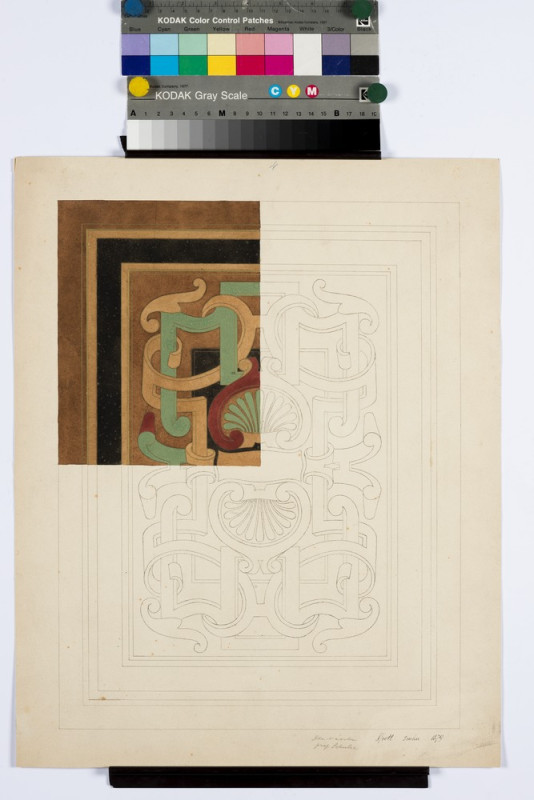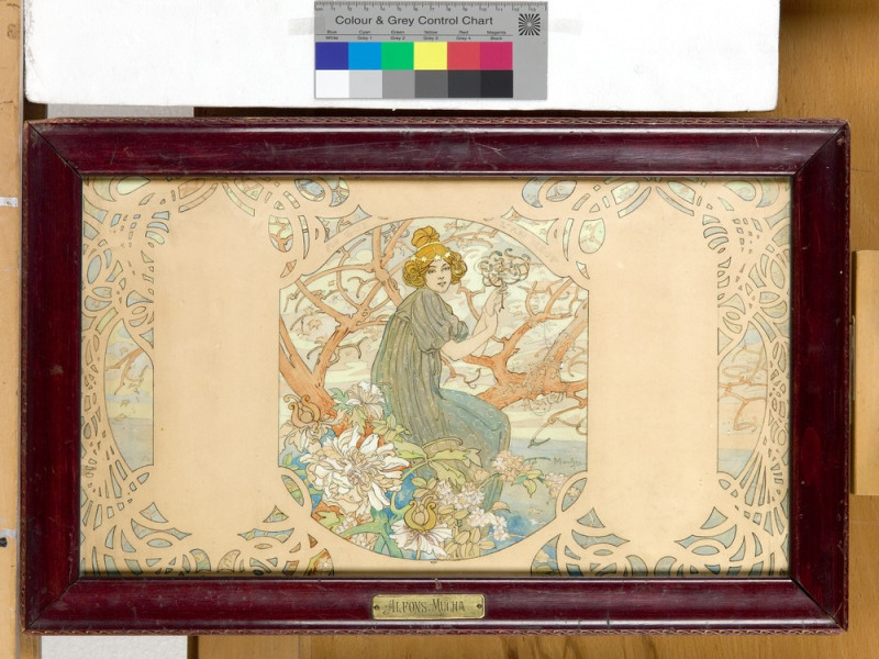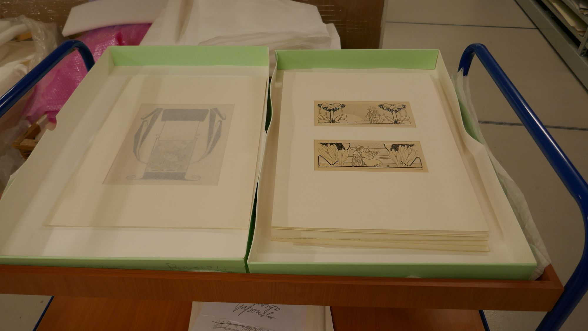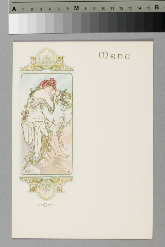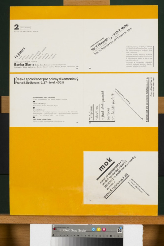 mědiryt, inv.č. G4493/1 František Kysela, List ze souboru předsádkových papírů, 1915, litografie, inv.č. 27416/6 J. Pachmayer (tisk), Novoročenka, Novoroční přání hojnosti, 1820-1830, lept, kolorování, inv.č.GS12903 Franz Hogenberg, Joris Hoefnagel, Dva pohledy na Prahu ze série Civitates orbis terrarum, 1598, lept, mědiryt, inv.č. 47790 Taneční pořádek, 1890, papír, kov, textil, lept, inv.č. 21428/6 neznámý autor, grafický list, ornament, 1860, Amsterdam, mědiryt, inv.č. GS960 Návrh lustru No.4, kolem 1830, kresba, kresba perem, kolorování, inv.č. GS20377 Alfons Mucha, Menu, po 1900, barevný tisk , inv.č. GS18826 Návrh na koberec Detvy do soutěže SČSD, před 1925, kvaš, tužka, tempera, akvarel, inv.č. GS6438 L. Sutnar, panel výstavy, publikace, Reklamní letáky MOK stavební společnost, 1932 - 1934, inv.č. GS19213/43 Alfons Mucha, Návrh na kalendář, 1900, tužka, kolorování, inv.č. GS4962 Jan Solpera (návrh), Jaroslav Štursa (sklář), skleněný terč, Informační systém Hotel Praha. Kadeřnictví, asi 1980, inv.č. GS23532 J. Wenig, Obálka časopisu, Divadelní oznamovatel, kol.1910, inv.č. GS17706 Ladislav Sutnar, Leták, Krásná jizba dp nabízí..., 1937, tisk z hloubky, inv.č. GS21279 Antifonář zlomek. sv. Bartoloměj v iniciále A, 2. pol. 16. stol., kresba na pergamenu, iluminace, inv.č. 1171 Heinrich Aldegrever,Ornamentální předloha, 1535, grafický list,  mědiryt, inv.č. G4468/g grafický list, Cahier de Sujets Arabesques, kol.1700, mědiryt, inv.č. GS1229/2 Zpěvník liturgický. zlomek. Iniciála S zdobená fleuronnée, 2. pol. 15. stol., malba a zlacení na pergamenu, iluminace, inv.č. 11908/13 Josef Matěj Navrátil, Návrh pokojové výmalby, kol. 1850, kvaš, inv.č. GS3726 Vojtěch Preissig, návrh obálky Jugend, ročník I., 1896, tuš, běloba, inv.č. GS15200 J. Šváb, Knižní obálka, 1964, inv.č. GS11169/736 Interiér, Salón na zámku v Ermannsdorfu, kol. 1830, litografie, inv.č. 28488 J. Zumsande, Portrét, Mladá dívka, 1849, akvarel, inv.č. 70327 Franz Leopold Schmitner, Svatý obrázek Pražské Jezulátko, pol.18. stol., rytina, inv.č. GS5057/5/35 Method Kaláb, knižní obálka, Jan Neruda. Jeho spisy a životopis, 1908, knihtisk, inv.č. GS697 Koloman Moser, obálka časopisu, Die Kunst für Alle, ročník 14, číslo 1, 1898, litografie, inv.č. GS752 Vzorníky nábytku, empírový nábytek, interier, napoleonský, 1770 - 1800, lept, inv.č. GS11446 Příležitostný tisk, Chromolithografie císaře Františka Josefa II., chromolitografie na oboustranně natírané lepence,1900, inv.č. 40527 Petr Bohmann, Novoroční gratulační lístek pohybový, kol. 1810, lept, kolorování, inv.č. 27278 Belgičanka a belgický šlechtic, 1585 - 1619, kolorovaný mědiryt, inv.č. 40270 J. Gočár, Návrhy nábytku II, originální návrh, 1913, pastel, tuš, inv.č. 96238 depozitář, uložení, rámovaná grafika depozitář, uložení, užitá grafika depozitář, uložení, užitá grafika