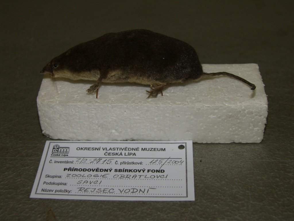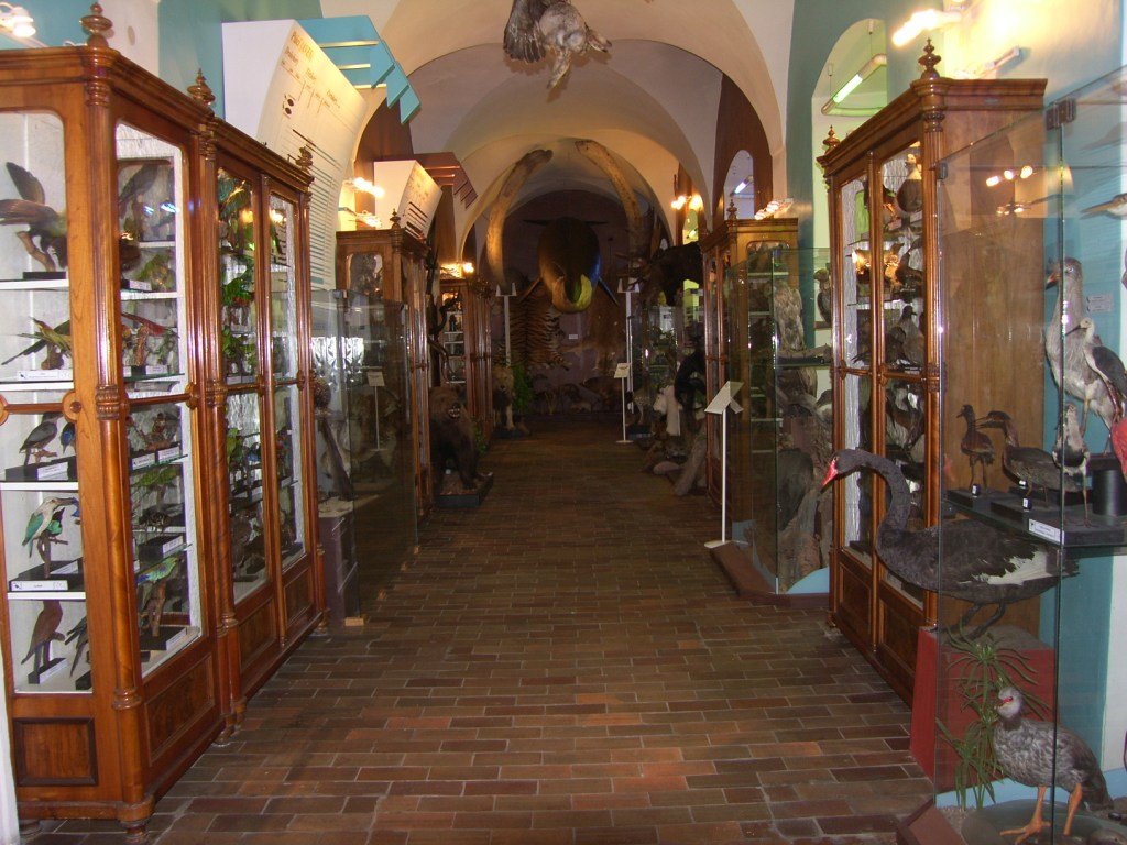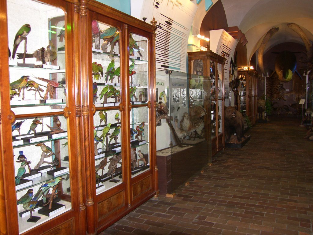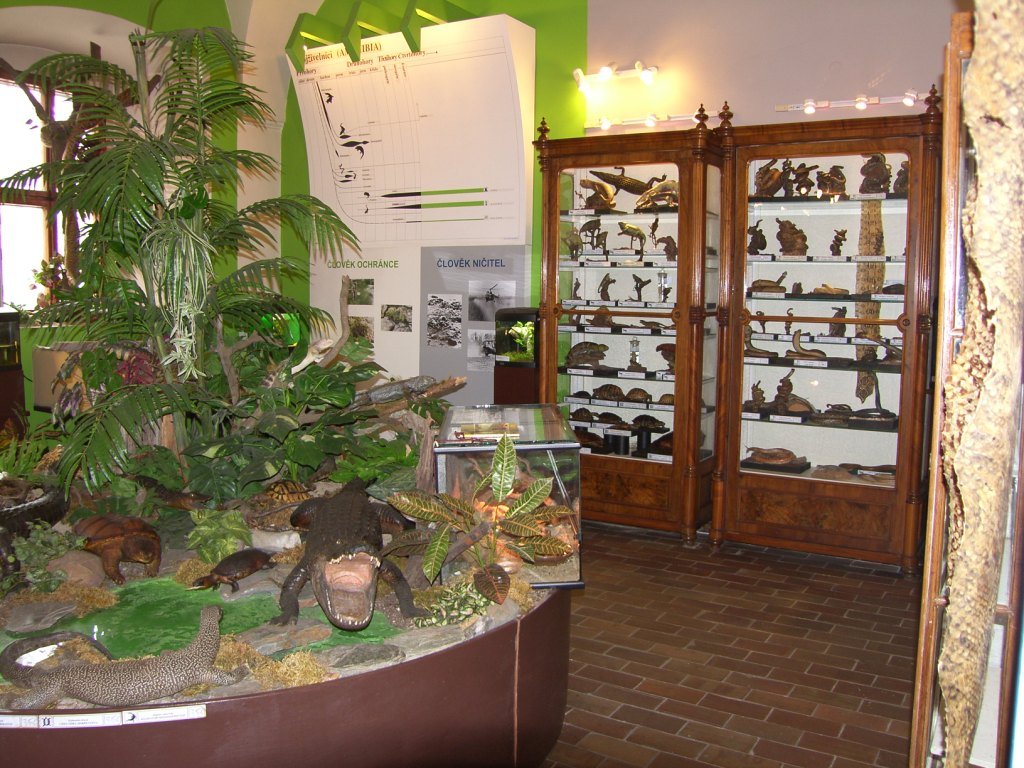 Sova pálená (Tyto alba) Tetřívek obecný, samec (Lyrurus tetrix) Mořský koník (Hippocampus hippocampus) Ostrobok  (Selene vomer) Pilobřich ostnitý (Zeus faber) Žralok kladivoun, mladý jedinec (Sphyrna zygaena) Rejnok ostnatý (Raja clavata) Chřestýš brazilský (Crotalus durissus) Rohatka ozdobná (Ceratophrys ornata) Žábronoš skvrnitý (Necturus maculosus) Hrabatka kropenatá, samice (Pyxicephalus adspersus) Skokan volský (Rana catesbeiana) Heterodon americký (Heterodon nasicus) Mlok černý (Salamandra atra) Korovec jedovatý (Heloderma suspectum) Ropušník trnohlavý (Phrynosoma cornutum) Scink uťatý (Tiliqua rugosa) Tereka africká (Pelomedusa subrufa) Klapavka americká (Kinosternos subrubrum) Štíhlovka podkovní (Coluber hippocrepis) Drozd kvíčala (Turdus pilaris) Havran polní (Corvus frugilegus ) Holub doupňák (Columba oenas) Husa běločelá (Anser albifrons) Chřástal polní, nedospělý samec (Crex crex) Mandelík hajní (Coracias garrulus) Orebice horská, samice (Alectoris graeca) Orel skalní (Aquila chrysaetos) Papoušek vlnkovaný andulka, samice (Melopsittacus undulatus) Polák velký, dospělý samec (Aythya ferina) Potápka rudokrká, samec (Podiceps griseigena) Potáplice severní, samec (Gavia arctica) Rybák obecný (Sterna hirundo) Volavka popelavá, nedospělý samec (Ardea cinerea) Zvonohlík zahradní, samec (Serinus serinus) Žluna šedá, samec (Picus canus) Rejsec vodní (Neomys fodiens) Veverka obecná (Sciurus vulgaris) Ondatra pižmová (Ondatra zibethicus) Jelení trofej uložená v depozitáři Koza bezoárová, kůzle (Capra aegagrus) Srnec obecný, srnče (Capreolus capreolus) Jelení trofej uložená v depozitáři Uložení nevystavené části sbírky Uložení nevystavené části sbírky Uložení nevystavené části sbírky Pohled do expozice Pohled do expozice Pohled do expozice Psík mývalovitý (Nyctereutes procyonoides) Pohled do expozice Jelení trofej uložená v depozitáři