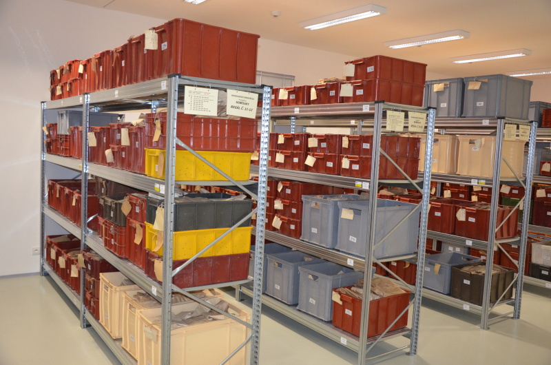 | Předměty | Sbírka je tvořena různorodým archeologickým materiálem většinou fragmentárního charakteru, ale i jednotlivými ojedinělými nálezy z různých materiálů. Většinou jde o zlomky keramiky a keramiku, kosti zvířecí, antropologický materiál, mazanici a technickou keramiku (tyglík, dyzna, vodovodní trubka, kadlub), přesleny, závaží, štípaná industrie, broušená industrie, vývrtky, brousky, opracované kameny, drtidla a mlýny, závaží, měděné předměty, bronzové předměty (nástroje, zbraně, šperky a součásti oděvu, součásti koňských postrojů), železné předměty (nástroje, zbraně, šperky, součásti oděvu, stavební železo, zemědělské nástroje a součásti postrojů), skleněné předměty (korálky, nádobky, zlomky náramků), uhlíky a dřevěné předměty, malakologický materiál (mušle, škeble, ulity), švartnové předměty, struska, mince, hřivny, střešní krytina, pseudoartefakty.MATERIÁLY:keramika, kost, paroh, zuby, kámen, jantar, měď, železo, slitiny kovů (převážně bronz), zlato, stříbro, sklo, dřevo, švartna, struska,