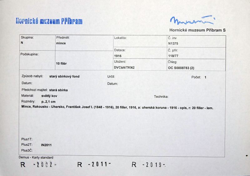 uložení sbírkových předmětů uložení sbírkových předmětů uložení sbírkových předmětů uložení sbírkových předmětů uložení sbírkových předmětů ukázka dokumentace sbírkových předmětů odznak, Slet sokolské župy Jeronýmovy v Příbrami, 1938, kov odznak, SVAZ NÁRODNÍ REVOLUCE, kov medaile, Za chrabrost, kov, textil, 1939 medaile, Čestná cena výst. výboru Příbram, 1923 pamětní plaketa, Krajinská výstava v Březnici, 1828 medaile, Uranové doly Příbram 1949-1989 medaile, Průmysl. hospod. výstava Příbram, sign. Abraham, 1894 medaile, Na paměť založení  měst. muzea v Příbrami, 1886, 1936, světlý kov medaile, ČESKOSLOVENSKÁ ARMÁDA V ZAHRANIČÍ, 1939-1945, 1945, kov, textil vyznamenání, Karlův železný kříž, 1916, kov, textil medaile, Záslužný kříž Franz Josef I., kov, textil pamětní medaile, P. Maria Svatohorská s havíři, 1832, kov mince, Památka zasvěcení 1000 m. dolů Albrechtových v Příbrami, 1875, kov medaile, Upomínka na slavnost svěcení praporu spolku DOMOBRANA v Příbrami, 1913, kov odznak, Krajinská výstava v Březnici, 1928, kov plaketa, Arnošt z Pardubic, soška P. M. Svatohorské, 1948, kov medaile, Průmyslová výstava v Mnichově 1854, 1854, kov medaile, Průmyslová výstava Paříž, 1855, stříbro plaketa, IV. Hor. výstava Příbram, hliník medaile, Důl Císaře Františka Josefa I, bankovka židovská, 20 Kronen, papír los, KAISERIN ZITA KINDERTAG, r. 1917, Serie 1378, No 000706 papírové platidlo pro potřeby chozrazčotu Uran. průmyslu, záv. Konětopy, hodnota 50 bankovka, 20 Kč, ser. Cg č. 619788, v Praze 1.10.1926, papír bankovka, 1 Kč, SD546840, papír bankovka, 10 Kč, protektorát, S. 43N 636701, Praha 8.7.1942, papír bankovka, 5 korun slovenských, D 026, papír poukázka, sto korun ČSR, modrý kolek T.G.M., OC 456092, rok 1944, papír bankovka, 10 korun slovenských, Mn25 329518, Bratislava 15.9.1939, papír bankovka, Rakousko - Uherské 2 koruny, 1617  No 967118, Wien 1.3.1917 + nápis Deutschöstereich, papír bankovka, 100 marek, E. 14624802, Berlin 1.11.1920, Německo, papír chlební známka, Vodolka, kov fárací známka?, plech s otvorem, jednostranná ražba, vyražena rakouská orlice s korunou a číslice 8, kov mince, Rakousko - Uhersko, František Josef I. (1848 - 1916), 2 krejcary, 1912, a: orlice, r: 2 v kartuši, mincovna neznačena známka, PRÄSIDIUM DES K.K. BERGOBERANTES IN PŘÍBRAM, ovál, světlý kov mince, 1 Kč, protektorát Čechy a Morava 1942, kov mince, Pamětní příbramský zlatník, 1000 M. Albertschachts in Příbram, 1875, olovo