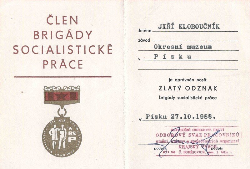 Rudý prapor Pionýrské skupiny SSM při ZŠ v Čimelicích, 1970-1989. Depozitář K+S, náhled uložení. Depozitář K+S, náhled uložení. Depozitář K+S, náhled uložení. Igelitová taška vyrobená k výročí 750 let města Písku, 1993. Snímek plaveckého stadionu pod Putimskou branou v Písku, venkovní bazén 50 m, stav po otevření v srpnu 1985, foto OM Písek. Snímek příjezdu Rudé armády na náměstí v Písku, 10. 5. 1945, foto neznámý autor. Snímek slavnostního přípitku představitelů americké a sovětské armády na náměstí v Písku, 10. 5. 1945, foto neznámý autor. Snímek hlídkujících tanků americké armády u Podolského mostu, 6. 5. 1945, foto neznámý autor. Snímek dokumentace zemědělské malovýroby: travní a obilní sekačka v přepravní poloze, Horosedly, 1982, foto OM Písek. Snímek vojenských bytovek v Písku v lokalitě Na Stínadlech, stav r. 1983, foto OM Písek. Snímek komplexní dokumentace – JZD Chyšky, farma Květuš: celkový pohled na areál teletníku, sklady píce a kravína (od Kvaštova), stav 2. 6. 1983, foto Alena Havránková, Oblastní muzeum Snímek komplexní dokumentace – MNV a JZD Chyšky, osada Květuš: kulturní dům vybudovaný svépomocí v 70. letech, stav 2. 6. 1983, foto Alena Havránková, OM Písek. Snímek E. M. Londona, důstojníka a reportéra Rudé armády, „osvoboditele města Protivína“, při družební návštěvě na MNV v Protivíně v roce 1970, foto neznámý autor. Snímek z regulace řeky Blanice: stavba jezu u vodňanské silnice v roce 1933, foto neznámý autor. Snímek výstavby inženýrských sítí pro sídliště Dukla, lokalita Jablonského ulice, stav srpen 1985, foto OM Písek. Snímek komplexní dokumentace – JZD Hrazany, farma Klisinec: pohled na areál kravína, stav červen 1987, foto OM Písek. Snímek komplexní dokumentace – Vlastec, železniční stanice na trati Písek – Tábor: rekonstruovaná hlavní budova a kolejiště, stav srpen 1987, foto OM Písek. Kovový jubilejní odznak s nápisem „Otavan Gregora“ a „Písek 1860“ s plastickým motivem varyta a lipové ratolesti, po roce 1909. Souprava šesti barevných popisovačů v měkkém umělohmotném pouzdře, výrobek zn. Sunpearl 5443 Koh-i-noor, závod 08 – Milevsko, 70. léta 20. století. Šicí stroj Textima 8332/003, rok výroby 1971: typ používaný v oddělení konfekce závodu Jitex Písek. Zapichovací odznak Den stavbařů, vodní dílo ORLÍK, 1961. Kovová píšťalka, v letech 1945-1946 používaná v píseckém dívčím skautském oddíle. Kožený talisman, bez obsahu, v letech 1945-1948 vyrobený v píseckém dívčím skautském oddíle. Deník písecké skautky Dagmar Pirchanové z Oblastní lesní školy ve Rtyni v Podkrkonoší, 1947. Informační tabule Městský národní výbor, sloužila k označení sídla MNV v Písku v 70. a 80. letech 20. století. Kronika kolektivu Brigády socialistické práce Okresního muzea v Písku, 1976-1989. Tablo protivínské jednoty Československé obce legionářské, 1931. Dorostenecký průkaz členky Tělocvičné jednoty Sokol v Protivíně Marie Štrérové, 1932. Diplom za I. místo v krajském kole lidových manipulátorů pro kolektiv ZK ROH Jitex Písek, zasklený v dřevěném rámu, 1955. Snímek ze slavnostního odhalení pomníku Klementa Gottwalda v Písku, květen 1975, foto neznámý autor. Los 170. Československé státní loterie v ceně 10 Kčs, s motivem n. p. Jitex Písek, 1975. Pracovní knížka vydaná na jméno Vojtěch Šimek v Písku dne 29. 12. 1942. Analogový pedometr, používaný v turistickém oddíle TJ Spartak Písek v 80. letech 20. století. Pamětní medaile závodu Elektropřístroj v Písku (75 let závodu v Písku) udělená Marii Daňkové, v červené etuji, 1977. Čestné uznání udělené Národním podnikem Jitex Písek Dezideru Hájkovi (mistru snovárny) za zdárné plnění pracovních úkolů ve druhém a třetím čtvrtletí 1955. Soubor 9ks skleněných diapozitivů z Tělovýchovné komise učitelstva v Písku, propagace v píseckých kinech v letech 1941-1948. Snímek píseckého domu U Koulí v ulici Fráni Šrámka, stav 1965, foto Justýnová, Písek. Snímek z pohřbu Marie Šťastné († 31. 10. 1944), ženy starosty města Písku Václava Šťastného, foto Petřík, Písek. Průkaz člena Brigády socialistické práce Jiřího Kloboučníka, závod Okresní muzeum v Písku, oprávnění nosit odznak I. stupně BSP (zlatý), 1988. Album z pozůstalosti známého píseckého turisty Josefa Vokatého, Zájezd Slovensko turisticky, 1951. Kovový odznak Klubu velocipedistů v Písku, pochází z písecké rodiny učitelek Baudysových, kolem 1898. Skleněná plaketa Velká cena města Písku, s modrožlutou stuhou s nápisem „ČASK Písek, 8. srpen 1944“, v modré etuji, 1944. Snímek ze stavby Podolského mostu, datovaný 12.-13. 5. 1940, foto neznámý autor. Všeobecná občanská legitimace Boženy Litvanové, vydaná Okresním úřadem v Písku dne 21. 10. 1942. Propustka přes demarkační čáru, vydaná na jméno Otto František Strnad Velitelstvím uniformované obecní výkonné policie v Písku dne 3. 8. 1945. Pamětní plaketa Kovosvit Písek 30 let, v červené etuji, 1980. Kovový odznak vyrobený k výročí 20 let píseckého podniku Jitex, 1969. Plátěný pytel poválečné potravinové pomoci uchovaný v Písku, UNRA 1945-1947. Brigádnický průkaz akce Za krásný Písek 1962, nevyplněný. Legitimace poslance Městského národního výboru v Písku č. 46 vystavená na jméno Jiří Košťál, 1964. Snímek příjezdu předsunutých jednotek americké armády na náměstí v Miroticích, 7. 5. 1945, foto neznámý autor. Trojdílná hliníková jídelní souprava (tzv. ešus), složená ze dvou misek s držáky a z víčka, KČT Turista Písek, kolem roku 1990.