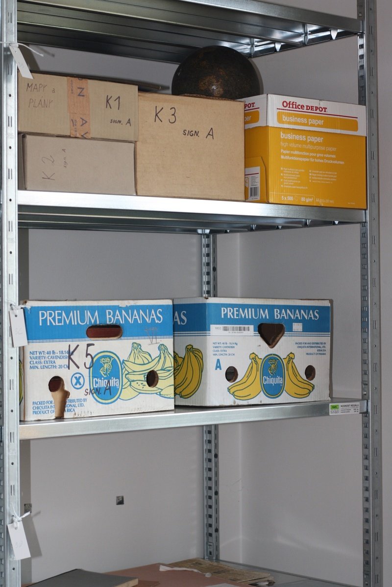 64/2012 – Plán lesu Sidonie Chotkové u Radvančic, Vídeň, počátek 20. století. 66/2012 – Půdorys kostela sv. Máří Magdalény ve Vlastějovicích, 1938. A 64 – Kuttenberg und seine Umgebung (geologicko-hornická mapa), Praha, 2. polovina 19. století, litografie. A 66 – Vojenské čtvrti města Kutné Hory v 16. století, Josef Šimek, Kutná Hora, 1895 (?), lavírovaná kresba. A 70 – Archaeologická Mappa Království Českého, Anton Schmitt, Praha, 1856, kolorovaná litografie. A 79 – Mapa území kolem Labe u obce Veletova, 1712, malba na papíře. A 89 – Nákres vycházky obecního zastupitelstva kutnohorského k prohlídce obecních lesů a rybníků velkostatku Červenojanovického, přelom 19. a 20. století, tisk. A 90 – Plán Vlašského dvora z r. 1852 před úpravou z l. 1892-8 (plán mincovny pro expoziční účely), František Hubert, Kutná Hora, 1949, rys. A 143 – Orientační plán králov. horního města Hory Kutné, Antonín Josef Zavadil, Kutná Hora, přelom 20. a 30. let 20. století, tisk. A 231 – Situační plán královského horního města Hory Kutné, Antonín Josef Zavadil, Kutná Hora, 1892 (?), tisk. A 232 – Návrh na úpravu městské spořitelny v Kutné Hoře, 1932, malba. A 236 – Návrh nového kostela v Červených Janovicích (půdorys nového a starého kostela), Kutná Hora, 1901, rys. A 262 – Návrh obecné školy chlapecké a dívčí v Kutné Hoře (hlavní průčelí), Kutná Hora, 1926, kolorovaný rys. A 304 – Podrobná mapa okolí Rataj Hrazených (Rataje nad Sázavou), 1930, tisk. Depozitář podsbírky Mapy a plány (sign. A) – uložení menších předmětů. 143/2010 – Historicko – zeměpisný atlas školní starého, středního a nového věku. Praha, 30. léta 20. století. A 21 – Plán města Terstu, Augburg, 50. léta 18. století, kolorovaný mědiryt. A 39 – Mappa geographica Regni Bohemiae …, Johann Christoph Müller, Augsburg, 1722, mědiryt. A 74 – Charte vom Czaslauer Kreise des Königreiches Böheim ..., František Jakub Jindřich Kreibich, Praha, 1833, mědiryt. A 97 – Hornická mapa turkaňského pásma, O. Lackner, 1665, malba na papíře. A 121 – Radnice města Hory Kutné před rokem 1770, kteréhož roku popelem lehla, Matěj Zaenger, Kutná Hora, konec 19. století, kresba ryskou, červený akvarel. A 144 – Karte des Kuttenberger Erzrevieres (Mapa kutnohorského rudního revíru), W. Göbl, Videň, 1887, tisk. A 204 – Plan des Graf Chotekischen Schlosses und Städtchens Neuhof (plán novodovrského zámku), Jacques de Jesigny, 1787, kresba, akvarel. A 211 – Hotel v Kutné Hoře (původní návrh adaptace domů na Palackého náměstí na hotel kategorie A – dnes hotel Mědínek), Praha, 1955, kolorovaný rys. A 244 – Plány obecné školy chlapecké v Kutné Hoře Na Náměti (půdorys přízemí), Netolice, 1891 a 1892, kolorovaný rys. A 333 – Atlas Novum ad Usum Serenissim Burgundiae Ducis, Sanson, Amsterdam, počátek 18. století, kolorované mědiryty. Depozitář podsbírky Mapy a plány (sign. A) – uložení menších předmětů. Depozitář podsbírky Mapy a plány (sign. A) – uložení předmětů velkých formátů.