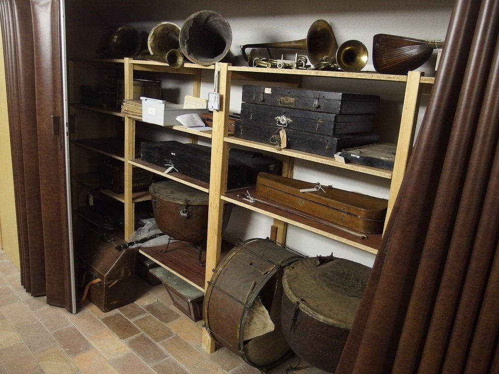 Mosazný bubínek obecního strážníka Tahací dvouřadá heligonka Dvanáctistrunná mandolína Flétna z hnědého dřeva Flétna z hnědého dřeva Jihoslovanské dřevěné gusle s vyřezávaným hmatníkem Jihoslovanská brača se smyčcem Mosazný lesní roh, O 26 cm Kovový bubínek obecního strážníka Mosazná pastýřská trouba Mosazná trubka - křídlovka Papírové desky do aristonu Mosazná poštovní trubka Čtyřstrunná dřevěná balalajka Černá zobcová flétna Housle a smyčec v černém pouzdře Americká čtyřicetistrunná citera Plechové hrací desky do polyfonu Klarinet s devíti mosaznými klapkami Housle se smyčcem v černém pouzdře Pozůstalost po houslaři - polotovar houslí  Mosazný pozoun, vyroben v Chomutově Příčná flétna v podomácku zhotoveném pouzdře Citera zn. “Wellecord“, devadesátidvoustrunná Mosazná tuba – bas, výrobce J. Maňhal, Písek Pohled do depozitáře Podsbírky historických hudebních nástrojů Pohled do depozitáře Podsbírky historických hudebních nástrojů Pohled do depozitáře Podsbírky historických hudebních nástrojů