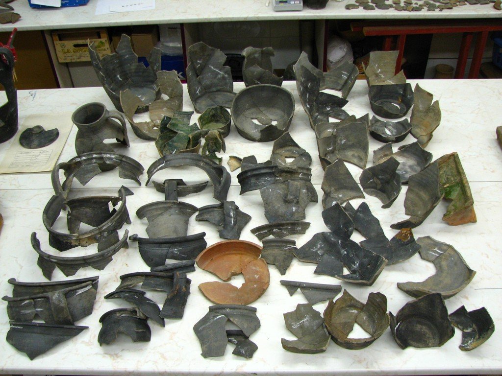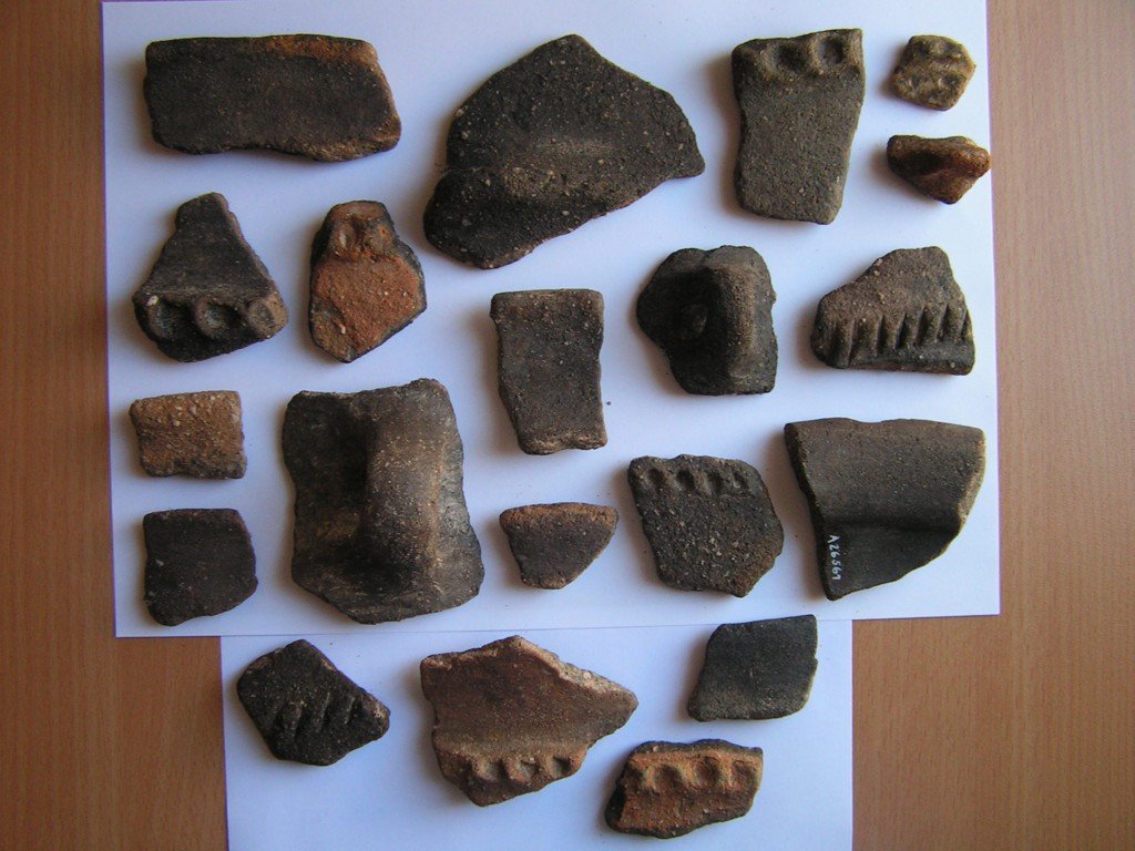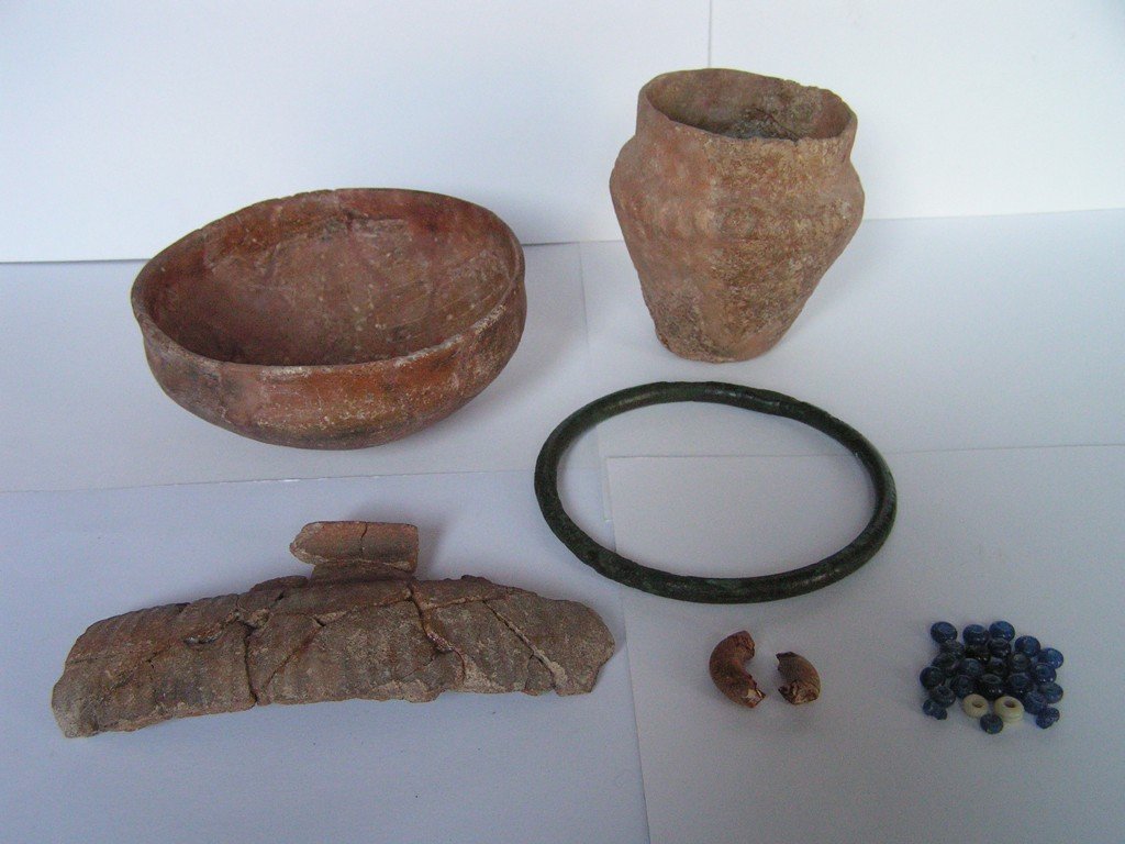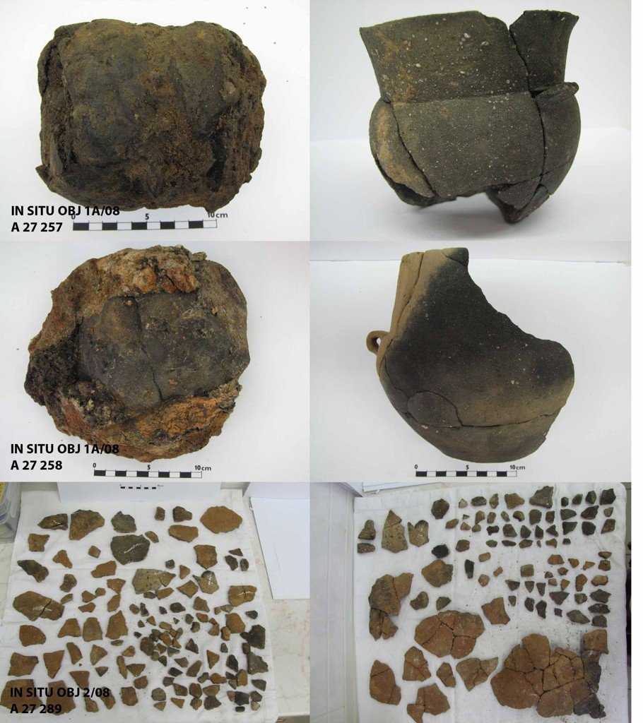 | Předměty | zvířecí kosti, lidské kosti, kostěné předměty, kamenné předměty, tuhalignitové předměty, jantarové předměty, dřevěné zlomky, dřevěné předměty, uhlíky, zlomky keramiky, keramické předměty, keramické nádoby, kožené zlomky, kožené předměty, bronzové zlomky, bronzové předměty, železné zlomky, železné předměty, železná struska, skleněné zlomky, skleněné předměty, skleněná struska, mazanice, stavební keramika, kachle, textil