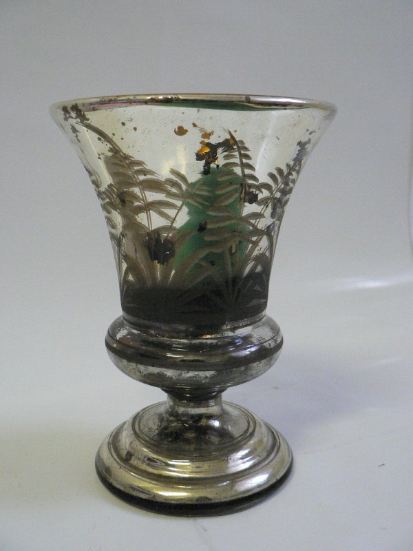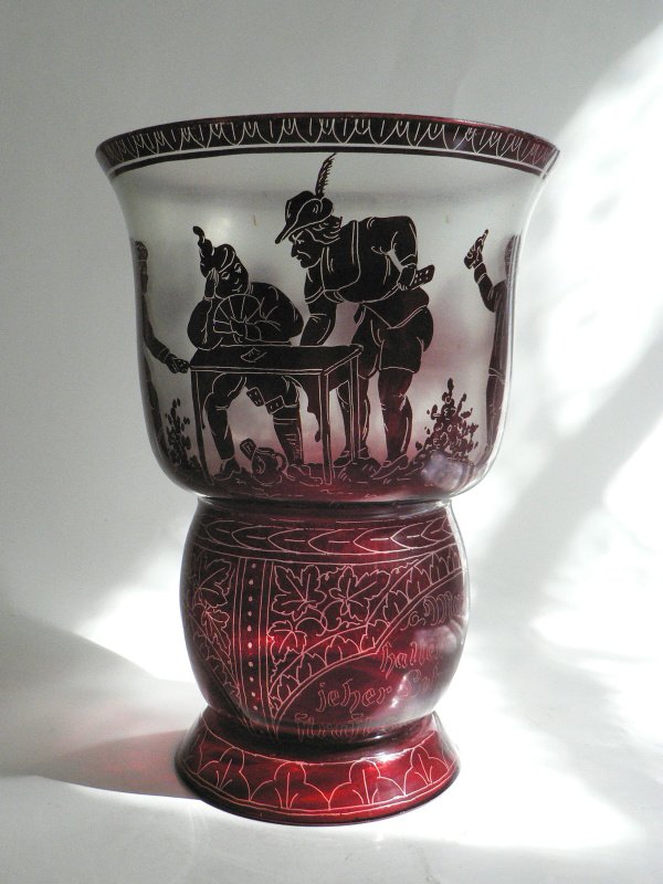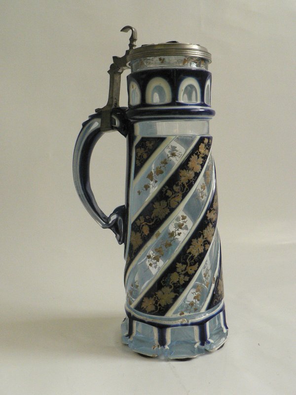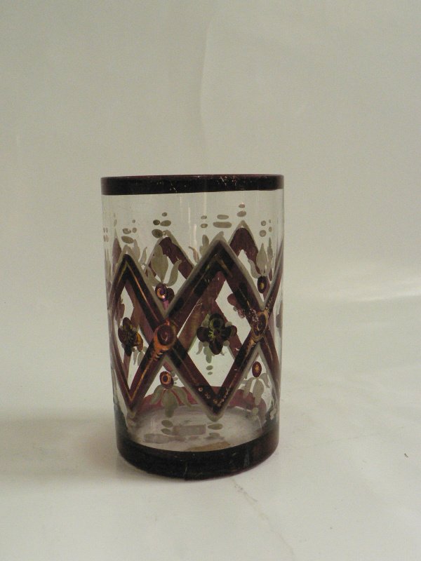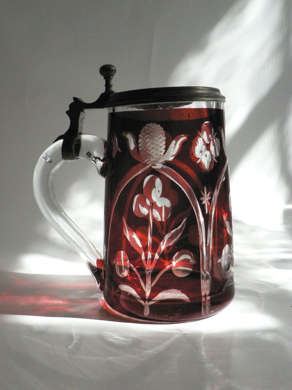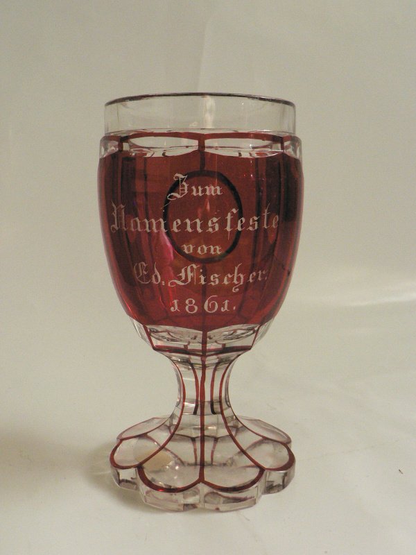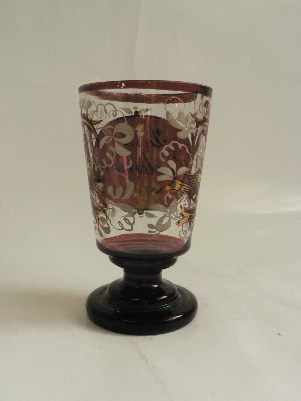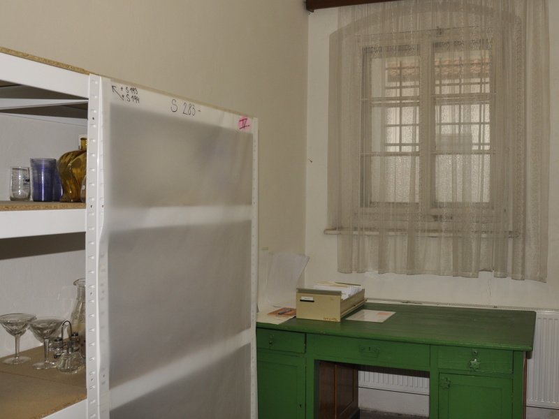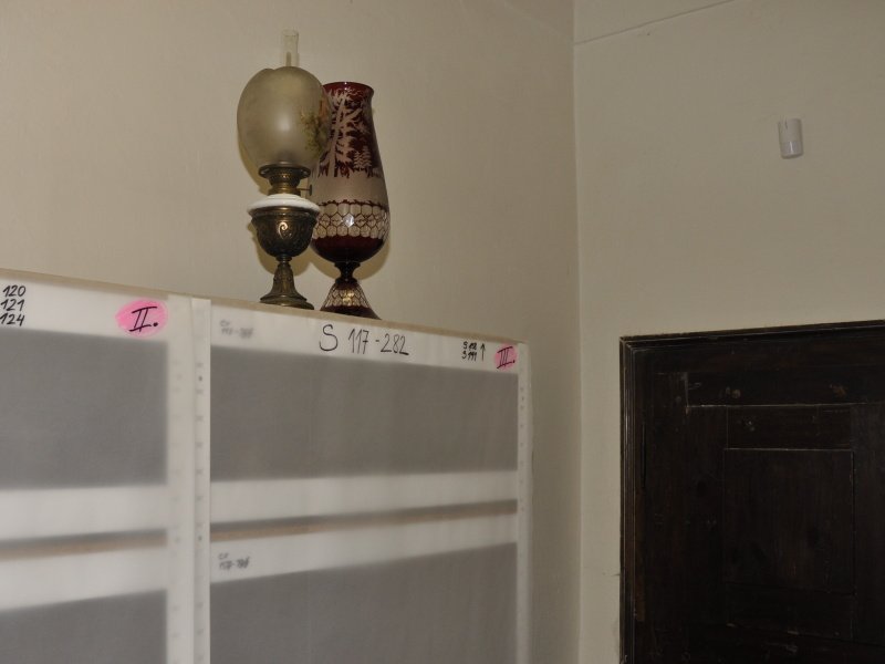 Pohled do depozitáře podsbírky Sklo Pohled do depozitáře podsbírky Sklo Pohled do depozitáře podsbírky Sklo S 19  Holba z čirého skla pokrytá rubínovou lazurou. Kolem 1870. Starý fond S 27 Pohár z čirého dvojplášťového skla. Kolem 1880. Starý fond S 43 Láhev z rubínově lazurovaného skla. Kolem 1840. Starý fond S 48 Pohár lázeňský  z čirého skla. Kolem 1860. Starý fond S 49 Pohár na nožce z čirého skla. Nožka, patka a pásek kolem hrdla rubínově lazurován. Kolem 1860. Starý fond S-K 33 Dekorativní košík z přejímaného skla. Kadaňský fond S-K 76 Váza ze zeleného čirého skla s ozdobně tvarovaným rokajovým hrdlem a patkou. Kadaňský fond S 24 Talířek rubínově lazurovaný. Kolem 1840. Starý fond S 29 Holba z čirého skla s cínovým víkem s montáží. Na plášti holby vyleptaný a vybroušený motiv z dubového listí. Kolem 1850. Starý fond S 31 Miska ve tvaru labutě z čirého skla. Kolem 1880. Starý fond S 40 Váza z čirého skla rubínově lazurovaná. Ponechány plochy čirého skla na plášti, které jsou zdobeny emailem. Kolem 1860. Starý fond S 41 Holba z přejímaného skla s uchem a víčkem na cínové montáži. Kolem 1850. Starý fond S 52 Pohár na nožce z čirého skla. Široký korpus rozčleněn pruhy do deseti ploch, ty jsou střídavě pískovány s kruhovým dekorem a rubínově lazurovány s emailovým malovaným ornamentem. Kolem r. 1860. S S 82 Váza z modrého (ultramarinovaného) skla. 19. stol. Starý fond S 58 Pohár na nožce z čirého skla. Pohár broušen do fazet a ploch medailonů. 1861. Starý fond S 85 Pohár z čirého, modře přejímaného skla na nožce s patkou. Celý pohár broušen. 19. stol. Starý fond S 71 Holba z čirého skla se skleněným víčkem v cínové montáži. 19. stol. Starý fond S 74 Miska na noze z čirého skla rubínově lazurovaného. 19. stol. Starý fond S 76 Váza z čirého skla s leptaným pláštěm. Rubínovou lazurou provedena figurální malba. Konec 19. stol. Starý fond S 89 Váza z čirého skla, bíle a modře přejímaná. Broušený povrch. 19. stol. Starý fond S 141 Váza z čirého skla uvnitř přejímaná růžovým sklem tvarovaná do podoby ryby. 19. stol. Starý fond S 169 Poháry na víno. Kompozice rosalinového skla s optickým dekorem a historizujícími motivy bohatě zdobeného kovu. 19. stol. Starý fond S 220 Karafa z modrého skla se zátkou. Na plášti viditelné fazetování. Převod z ONV Chomutov S 254 Figurka krasobruslařky na podstavci. 2. pol. 20. stol. Koupě S 221 Pohár z modrého skla na široké duté nožce ozdobené horizontálními pruhy.  Převod z ONV Chomutov