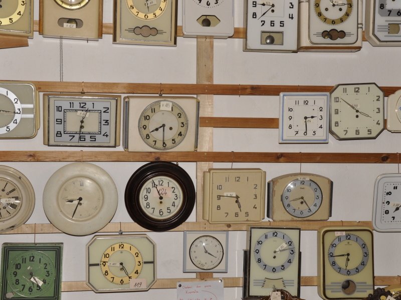 H 93, Závěsné dřevěné hodiny – pendlovky zn. Kienzle, Chomutov, počátek 20. století, koupě duben 1987 Depozitář Hodiny - pohled 1 (místnost č.20) H 12, Sloupkové hrací hodiny pod skleněným zvonem, C. Suchý et Söhne, Praha, 2.polovina 19. století, starý fond muzea Chomutov H 27, Skříňkové hodiny, značka Anton Hoffman, Duchcov, 1.polovina 18.století, starý fond muzea Chomutov H 85, Empírové sloupkové stolní hodiny, J.Straub, Vídeň, 30.léta 19.století, starý fond muzea Chomutov H 117, Nástěnné kuchyňské hodiny zn. Kienzle, Chomutov,  s nápisem MADE IN CZECHOSLOVAKIA, dřevo, 20. století, koupě únor 1998 H 192, Letecký palubní 8denní chronometr, zn. Kienzle, Chomutov,  ze sestřeleného letadla Junkers Ju 52, 30. léta 20. století, koupě 6.9. 2012 H 98, Mosazné sluneční hodiny, Kadaňsko, r. 1799, starý kadaňský fond H 105, Klasicistní sloupkové hodiny, 1.polovina 19. století, starý kadaňský fond H 99, Dřevěný secesní budík zn. Kienzle, Chomutov, počátek 20. století, koupě 1989 H 95, Kovový budík zn. Kienzle, Chomutov, po r. 1945, koupě září 1988 H 158, Pokojové stolní hodiny, zn. Kienzle, Chomutov, 30. léta 20. století, koupě v r. 2004 H 166, Nástěnné hodiny, zn. Kienzle, Chomutov, 50. léta 20. století, koupě 9.6. 2005 H 101, Obrazové nástěnné hodiny s obrazem alpské krajiny, kolem roku 1850, starý kadaňský fond H 61, Mosazné stojací hodiny, ve spodní části maskaron jako chrlič vody, značka „Collin Palais Royal“, kolem r. 1820, starý fond muzea Chomutov H 111, Obrazové nástěnné hodiny s portrétem mladé dívky v medailonu, kolem r. 1850 H 97, Kovový budík zn. Kienzle, 20.léta 20. století, koupě listopad 1988 H 104, Biedermeierové sloupkové hodiny, 30. léta 19. století, starý kadaňský fond Depozitář Hodiny - pohled 2 (místnost č.22) Depozitář Hodiny - pohled 3 (místnost č.17) H 41, Pokojové hodiny pod skleněným zvonem, 1850-1860, starý fond muzea Chomutov H 60, Obrazové hodiny - krajina s věží, olej na dřevě, kolem r. 1850, starý fond muzea Chomutov H 173, Velké nástěnné hodiny, zn. Kienzle, Chomutov, 1.polovina 20. století, starý kadaňský fond H 64, Skříňkové hodiny, v mramorové skříňce, nahoře hluboká mísa, sign. L. Doring, počátek 19. století, starý fond muzea Chomutov H 87, Obrazové závěsné hodiny, bohatá zlacená plastická výzdoba, kolem r. 1850, starý fond muzea Chomutov H 144, Nástěnné kuchyňské hodiny zn. Kienzle, dřevo a porcelán, Chomutov, 20.století, koupě srpen 1998 H 70, Empírové sloupkové hodiny, první třetina 18. století, starý fond muzea Chomutov H 189, Podlahové hodiny, zn. Kienzle, Chomutov, počínající Art Deco (1920-1930), koupě 13.4.2012