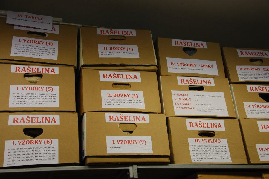 Pohled na uložení sbírkového fondu v depozitáři Pohled na uložení sbírkového fondu v krabicích Pohled na uložení sbírkových předmětů v krabici
