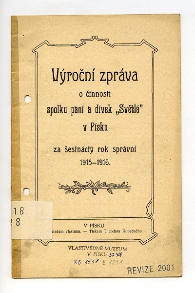 Knihovna  Ivo Beneše - Josef Holeček Černohorští Junáci Knihovna  Ivo Beneše - M.Jan Hus Obrany v Praze Knihovna  Ivo Beneše - Nový Písek Knihovna Ivo Beneše Ivo Beneš Práchenské divadlo Knihovna Ivo Beneše - In Memoriam Richarda Weinera Knihovna  Ivo Beneše - Karel Pletzer Dvojí zastavení Josefa Kajetána Tyla ve Vodňanech Knihovna  Ivo Beneše - Ladislav Stroupežnický  Po trnitých stezkách Knihovna  Ivo Beneše - Zdeněk Nejedlý  Aleš Knihovna Ivo Beneše - Lueger Lexikon der Gesamten technik VIII Knihovna Ivo Beneše  Meyers Konvertations lexikon Knihovna Ivo Beneše - Rozpočet příjmů a vydání města Písku na rok 1929 Knihovna Ivo Beneše Ant. Podlaha Posvátná místa král. Českého Knihovna Ivo Beneše Autobusové spoje Prahy s okolím Knihovna Ivo Beneše Das Buch der Erfindungen und Gewerbe. Knihovna Ivo Beneše Das Buch Erfindungen und Gewerbe. Knihovna Ivo Beneše Encyklopédie autodidactique quillet Knihovna Ivo Beneše Geschichte der Erfindungen Knihovna Ivo Beneše Jiří Chytrý- Milan Skalník Základy turistiky Knihovna Ivo Beneše Kafkův ilustrovaný průvodce po Čechách Knihovna Ivo Beneše Meyer Konvertations-lexikon Knihovna Ivo Beneše Monografie Hořovicka a Berounska 1918-1928 Knihovna Ivo Beneše Otavský elektrárenský svaz Výroční zpráva za rok 1928 Knihovna Ivo Beneše Písek a Prácheňsko Sbírka turistických a vlastivědných přiruček Knihovna Ivo Beneše Politická ekonomie Knihovna Ivo Beneše Průvodce značkovanými cestami v lesích král. m. Písku Knihovna Ivo Beneše - Konstrukce pozemního stavitelství Knihovna Ivo Beneše - Ročenka Občanské záložny 1927 Knihovna Ivo Beneše - Týn nad Vlt. a okolí Knihovna Ivo Beneše M. Hrdlička, Volání Klatovska Knihovna Ivo Beneše - V. Vlček, Polemika s Macharem Knihovna Ivo Beneše - 1910-1940 S.K. Písek Knihovna Ivo Beneše - František Lipš: Divadlo v Písku. Uložení knihovny Ivo Beneše Uložení knihovny Ivo Beneše Uložení knihovny Ivo Beneše Knihovna Ivo Beneše - Písek a Prácheňsko Knihovna Ivo Beneše - Lhenice a vesnice k nim příslušné Knihovna Ivo Beneše - Jubilejní turistický věstník župy Písecké Knihovna Ivo Beneše - Prvé čtvrtstoletí Odboru Kultury čsl. turistů v Písku Knihovna Ivo Beneše - Ročenka občanské záložny v Písku  1923. Knihovna Ivo Beneše - Ročenka Občanské záložny v Písku 1928. Knihovna Ivo Beneše - Ročenka občanské záložny v Písku 1925. Knihovna Ivo Beneše - Výroční zpráva Obchodní akademie v Písku. Knihovna Ivo Beneše - Záložna pro obchod a živnosti v Písku Knihovna Ivo Beneše - Výroční zpráva odborné školy pro ženská povolání v Písku za školní rok 1937-38. Knihovna Ivo Beneše - Výroční zpráva o činnosti spolku paní a dívek „Světlá“ v Písku Knihovna Ivo Beneše - Výroční zpráva o činnosti spolku paní a dívek „Světlá“ v Písku Knihovna Ivo Beneše - Výroční zpráva o činnosti spolku paní a dívek „Světlá“ v Písku Knihovna Ivo Beneše - Výroční zpráva o činnosti spolku paní a Dívek „Světlá“ v Písku Knihovna Ivo Beneše - Výroční zpráva o činnosti - spolku paní a dívek „Světlá“ v Písku za XXVII. Rok správní 1926- 1927. Knihovna Ivo Beneše - Výroční zpráva o činnosti spolku paní a dívek „Světlá“ v Písku za šestnáctý  rok správní 1915 -1916 Knihovna Ivo Beneše - Stanovy spolku paní a dívek Píseckých „Světlá“ Knihovna Ivo Beneše - Výroční zpráva o činnosti spolku paní a dívek „Světlá“ v Písku za XXXI. rok správní 1930 – 1931 Knihovna Ivo Beneše - Ročenka 1941 Spořitelny města Volyně Knihovna Ivo Beneše - Město v lesích Písek nad Otavou Knihovna Ivo Beneše - Písek nad Otavou bývalé krajské město