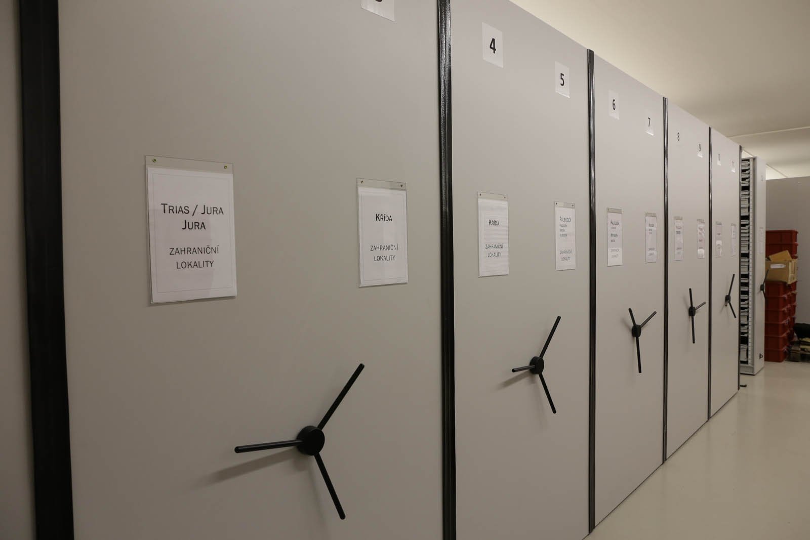 Zkamenělá kompletní kostra ježovky z cenomanských sedimentů české lokality Předboj u Prahy, holotyp. List krytosemenné rostliny Eotrigonobalanus furcinervis (ROSSM.) WALTHER & KVAČEK z čeledi Fagaceae, Bukovité, třetihory, eocén, (lokalita Žitenice). List na větévce krytosemenné rostliny Platanus neptuni z čeledi Platanovitých, třetihory, miocén,  (lokalita Kučlín). Primitivní paprskoploutvá ryba (Actinopterygii). Lokalita Olivětín. Stáří: spodní perm. Fosílie je uložena v jezerním vápenci, který se v 19. století používal k pálení vápna. Otisk vnitřního povrchu misky mlže Didymotis costatus (Frič). Svrchní křída - coniak, lokalita Černodoly. Světlezelenavě šedý slínovec, 33 x 37 mm, holotyp. Primitivní paprskoploutvá ryba (Actinopterygii). Lokalita Solnhofen. Stáří: svrchní jura. Fosílie je uložena v lagunním vápenci, který byl v 19. století těžen jako kámen pro litografii. Téměř úplné skulpturní jádro schránky amonita z německé svrchní křídy. Zkamenělina byla zakoupena roku 1904 od fy Krantz v Bonnu za prostředky z odkazu B. šlechtice Jiruše, výška 103 mm. Kostra ocasatého obojživelníka z vyhynulé podtřídy lepospondyli. Lokalita Nýřany. Stáří: svrchní karbon. Kostra je uložena v kenelovém uhlí, v 19. st. používaném na výrobu svítiplynu. Originál A.Friče Ploutevní trn primitivního rybovitého obratlovce z vymřelé třídy acanthodii. Lokalita Choteč. Stáří: spodní devon, spodní ems. Trn je zachován ve zlíchovském vápenci. Originál J. Barranda. Horní čelist mořského plaza z čeledi mosasauridae. Lokalita: Dolní Újezd. Stáří: svrchní křída. Kost je uložena ve vápenci a byla objevena náhodně v polovině 20. stol. Originál V. Zázvorky. Uložení originálů hlavonožců vyobrazených v díle Joachima Barranda Syst?me Silurien du Centre de la Boh?me. Exempláře jsou uloženy v moderním kompaktorovém systému. Uložení kenozoického paleobotanického materiálu zahraniční provenience v zásuvkách kompaktorového systému. Kompaktorový systém pro ukládání paleontologických sbírek v depozitářích Horní Počernice. Fosilie přední části těla mořského raka se zachovaným krunýřem, patrným rostrem a neúplně zachovanými končetinami, zaniklé lomy v oblasti Bílé Hory, Praha. Jádro schránky loděnky z vápnitých pískovců s výraznými příčnými žebry. Exemplář přes kýl doplněn sádrou. Výška: 131, šířka 105 mm. Exemplář je vyobrazen v práci A. Friče a U. Schloenbacha z roku 1872 Jádro misky mlže druhu Panenka speciosa Barrande, 1881. Graptoliti druhu Testograptus testis (Barrande, 1850). Kompletní jedinec trilobita druhu Odontochile hausmanni (Brongniart, 1822). Téměř kompletní gastropod druhu Polytropis dives Perner, 1903. Ventrální strana hyolita Ottomarites discors (Barrande, 1867) se zachovaným barevným vzorem. Část větve stromovité plavuňovité rostliny i s šišticí. Část olistěné větve přesličkovité rostliny stromovitého vzrůstu. Výtrusné šištice od stromovité přesličkovité rostliny. Průřez kmenem nahosemené rostliny inkrustované SiO2. Část olistěné větve předchůdce jehličnanů i s pavoukem. Plod krytosemenné rostliny Pseudoasterophyllites cretaceus O. Feistmantel ex Velenovský 1885, křída, lokalita Pecínov. Kmen stromovité kapradiny Protopteris punctata (Sternberg) Sternberg (holotyp Sternberg 1820), křída,  lokalita Kounice. Samiččí šištice konifery Fricia nobilis Velenovský 1885 z čeledi Cypřišovitých, křída, lokalita Nové Strašecí.