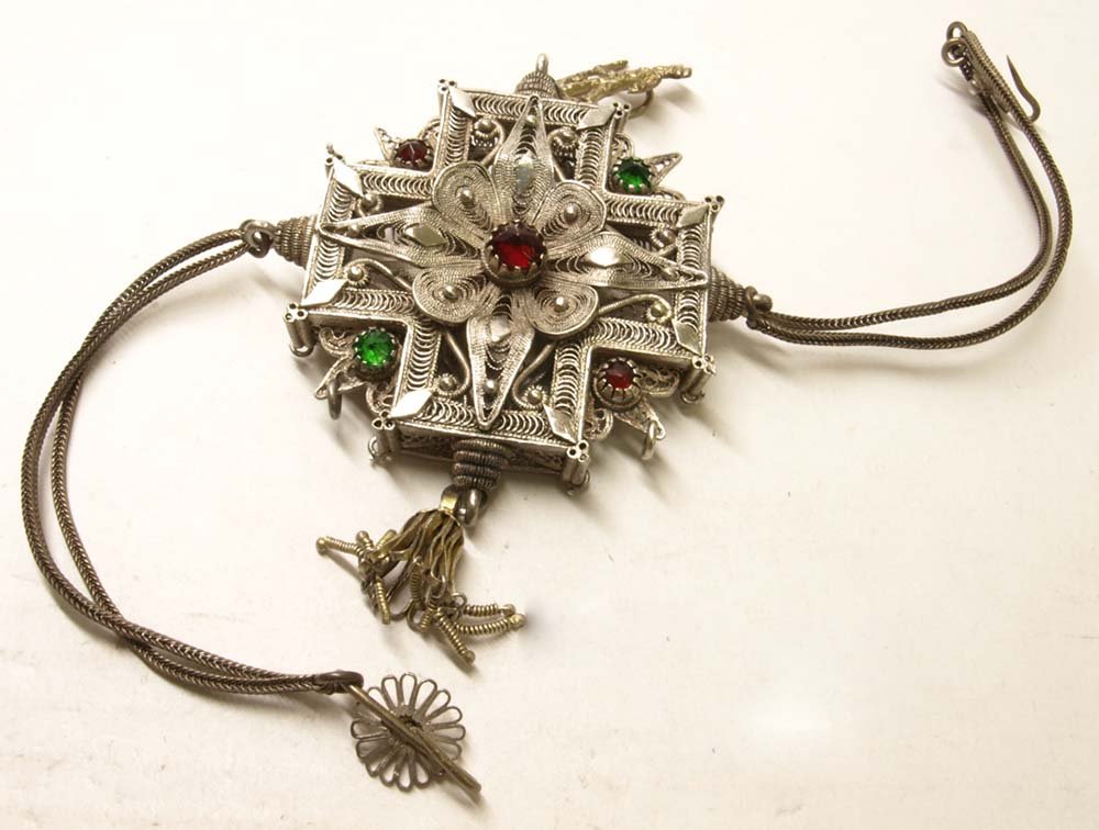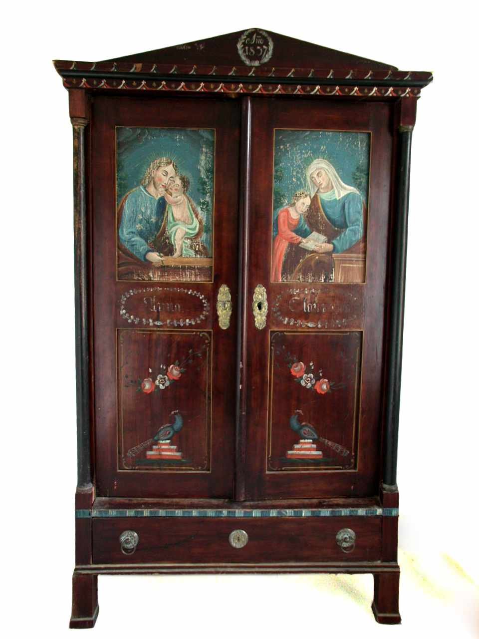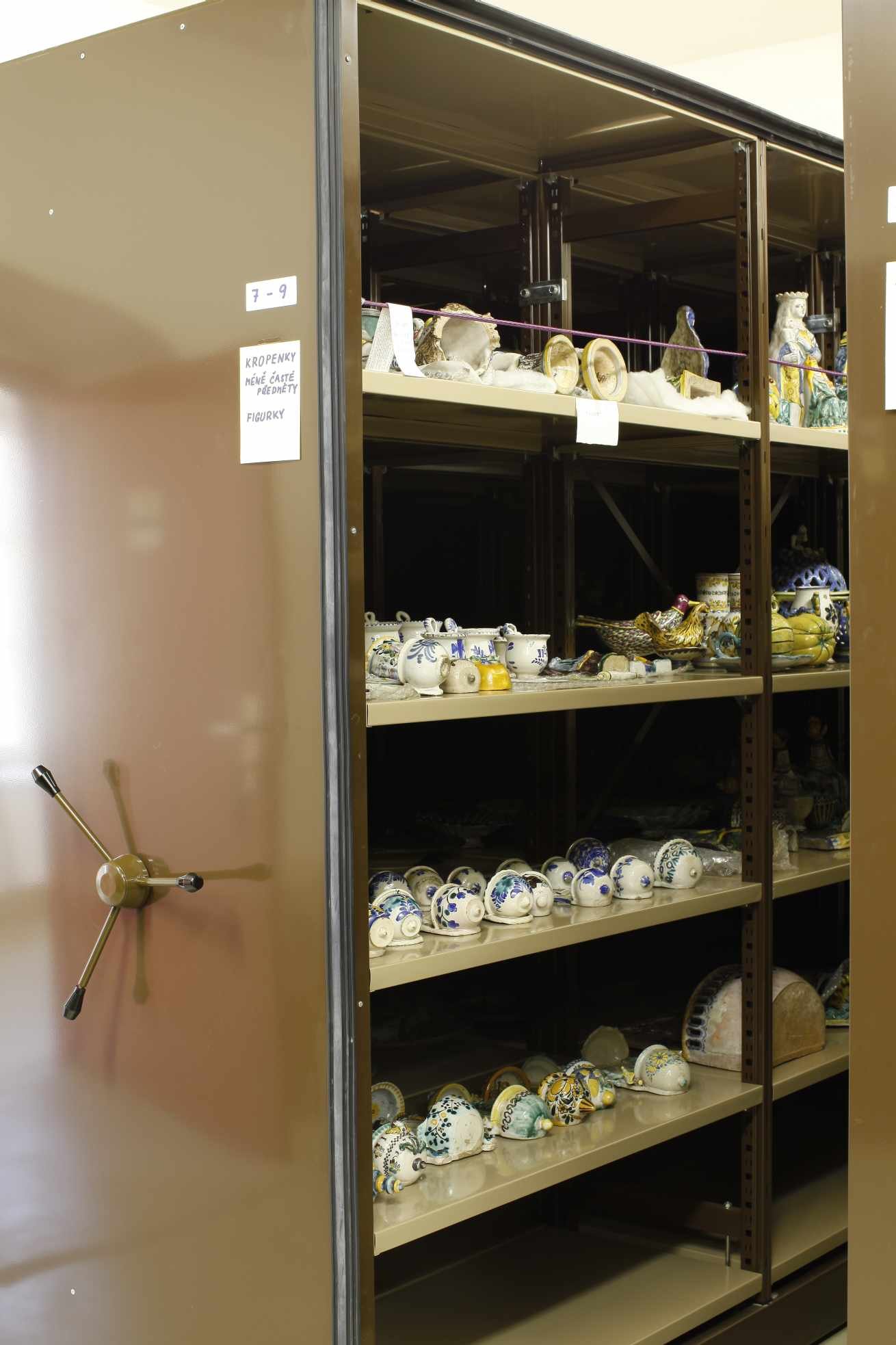 Spona s perletí, stříbrná, 2. polovina 19. století, tvoří ji dvě poloviny listovitého tvaru. Zapínání je kryto obdélným článkem ze dvou trojlistů. Na jedné polovině je na perleťové desce postava muže. Plena vyšívaná hedvábím a zlatými penízky, plátno, 80. léta 19. století. Vzor se skládá z  vrstevnatých květů růží, k okraji paličkovanou vložkou připojen vyšitý pruh s tylovými výplněmi a s krajkou. Vyobrazení selského svatebního průvodu z Chrudimského kraje. Namalován u příležitosti korunovace císaře Ferdinanda V. českým králem v roce 1836 v Praze. Malba ze čtyř částí, spojených v jeden pás. 1.č Vyobrazení selského svatebního průvodu z Chrudimského kraje. Namalován u příležitosti korunovace císaře Ferdinanda V. českým králem v roce 1836 v Praze. Malba ze čtyř částí, spojených v jeden pás. 2č Spona, 2. polovina 19. století, k ženskému pásu, zhotovená ze slitiny stříbra, bohatě zdobená na obou částech filigránem. Obě části zdobí perleťové destičky. Spona, 1854,  zhotovená ze stříbra, litá, v podobě ulity hřebenatky jakubské, zakončené jednotlivé paprsky s třásněmi a mezi nimi malá mušle. Vyobrazení selského svatebního průvodu z Chrudimského kraje. Namalován u příležitosti korunovace císaře Ferdinanda V. českým králem v roce 1836 v Praze. Malba ze čtyř částí, spojených v jeden pás. 3č Spona ve tvaru dvou ryb, stříbrná, 2. polovina 19. století. Ve tvaru dvou ryb. Ryba ražená, dodatečně ciselovaná. Rybky jsou obě stejné, co do tvaru i výzdoby, obrácené hlavami k sobě. Náhrdelník granátový, stříbrný, 1818,, řetízkový s granáty a granátovou rozetou, se stříbrnou mincí, s granátovým přívěšek a granátovým křížkem. Spona s perletí, stříbrná, 2. polovina 19. století, tvoří ji dvě poloviny listovitého tvaru. Zapínání je kryto obdélným článkem ze dvou trojlistů. Na jedné polovině je na perleťové desce postava muže. Louskáček, dřevo, 20. stol. Antropomorfní louskáček na ořechy, vzadu s pákou. Polychromně malovaný. Dětská spona k dívčímu pásu, stříbrná, 2. polovina 19. století, tepaná. S motivem okrasného ptáčka v rostlinném květinovém ornamentu  na obou částech. Ozdoba na šaty, stříbrná, 2. polovina 19. století, zdobená filigránovou prací, v podobě rovnoramenného kříže, s kameny. Na horním ramenu háček s postavou muže v klobouku s puškou. Náramek, stříbrný, 2. polovina 19. století, tepaný ručně, s perličkovou výzdobou, mezi jednotlivými motivy křížící se ramena ve středu s větší perlí a kolem do tvaru růžice. Skříň lidová empírová, dřevo, Sobotka, Pojizeří, 1837, z dílny Vincence Hořejšího. Zobrazeni Kristus, sv. Josef s Ježíškem a sv. Anna Učitelka, v poli ve věnečcích je jméno nevěsty Anna Slawykova. Křížek stříbrný,  80. léta 19. století, závěsný, zdobený rytím, stříbrným  kvítkem (rozetkou) s kamínky, uprostřed Kristus. Přeslice stojánková, dřevo, kov, Jindřichohradecko, 19.-20. stol. Přeslice z tvrdého dřeva bohatě zdobená vylévaným olovem a červenými sklíčky. Panna Maria, obrázek malovaný na skle. V Bavorsku došlo k  rozmachu malby na  skle v 18. a 19. století. Impuls k rozvoji podmaleb na skle  vyšel z vesnice  Raiumundsreutu. Tisk ze sbírky Ignáce Tabarky, papír. Tisk ze sbírky Ignáce Tabarky (český, kolorovaný, dolní část tisku nedochována, bez uvedení místa a data vydání). Masopustní maska z jižních Čech, látka. Panna Maria Zellská, obrázek malovaný na skle. Nejstarší obrázky  vznikaly od poloviny 18. století především činností hutnických zušlechťuvačů, kteří působili v oblasti České Kamenice. Panenka krojovaná, bakelit, 1932, oblečená v chodském dětském kroji. Na hlavičce tzv. Láhev fajánsová, habánská keramika. Láhev fajánsová, šestiboká, s cínovým šroubením, zdobená kobaltem, poutní madona korunovaná anděli, figurální a architektonické výjevy, 2. polovina 17. století. Část plachty koutní, konec 17. století, síťovaný pruh s prošívaným figurálním vzorem, s motivem: pán s dámou v renesančních kostýmech. K pruhu přišita paličkovaná krajka, s motivem: stromu života. Kamenný brousek na kosu, Lužná u Rakovníka, 20. stol. Zdoben nápisy – „Spomeň si častokrat na mně V. J. Neu. Vilhemína Drahníková. Sv. Veronika, obrázek malovaný na skle. Sklářská oblast severních Čech se považuje za kolébku výroby obrázků na skkle. Nejstarší obrázky  vznikaly od poloviny 18. století. Roucha vyšívaná barevným hedvábím, plátno, 80. léta 19. století,  s motivem kytice. Výšivka je doplněna zlatými kovovými penízky, s motivem blatských růží a tulipánů. Lemována bílou krajkou. Sponka stříbrná,  80. léta 19. století, uprostřed  srdce a kolem něho dírky, s květem (rozeta) skleněnými kamínky. Křeslo s figurkami, dřevo, Dolní Žandov (Amonsgrün), Chebsko, 1849. Sedací křeslo (Rundstöl) zdobené vyřeznávanými figurkami. Sponka stříbrná, 80. léta 19. století, dvoudílná, litá, se sklíčky, ve středu je větší kovový květ se vsazeným zeleným sklíčkem, po stranách kvítka se sklíčky, uprostřed visí krátký stříbrný řetízek. Ježíš s říšským jablkem, obrázek malovaný na skle. Sklářská oblast severních Čech se považuje za kolébku výroby obrázků na skle. Nejstarší obrázky  vznikaly od poloviny 18. století. Srostlík fajánsový, habánská keramika. Srostlík fajánsový (habánská keramika), pozůstávající ze tří džbánečků vzájemně propletených oušky, stylizované žluté tulipány, 2. polovina 17. století. Plachta koutní, lněné plátno, začátek 19. století,  červeně vyšívaná. Motiv: řada beránků s korouhvičkou, kalich, okřídlení draci, v
