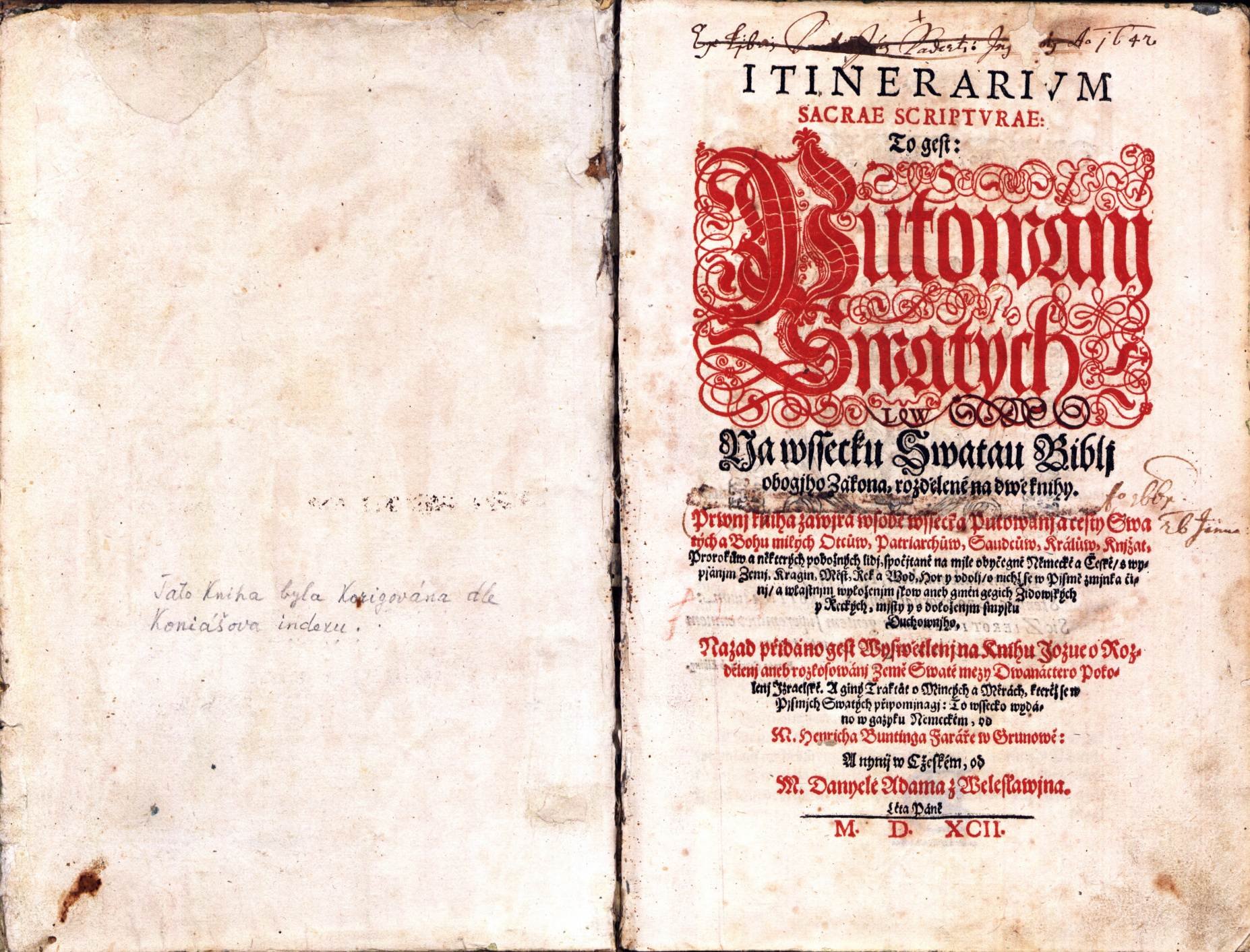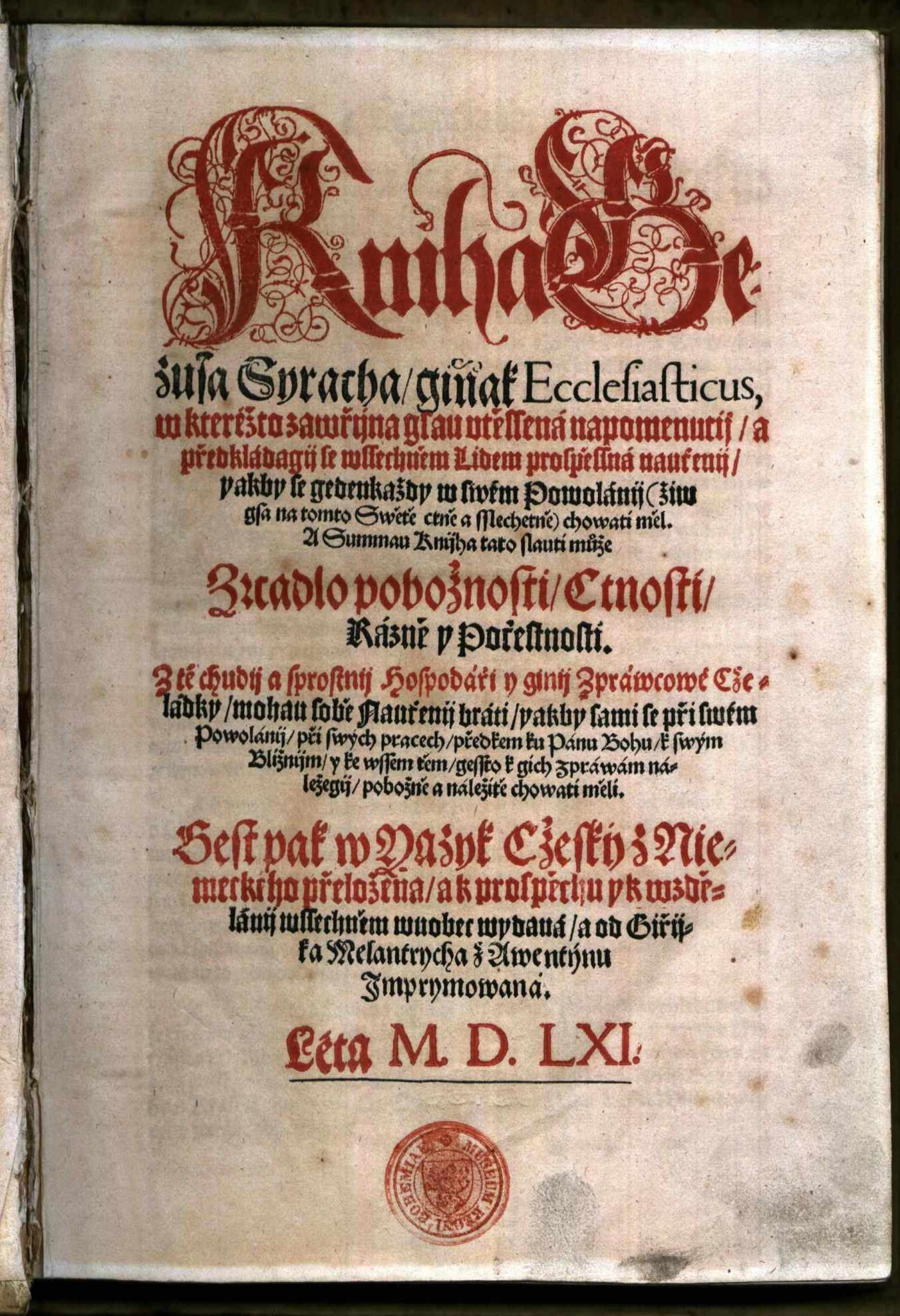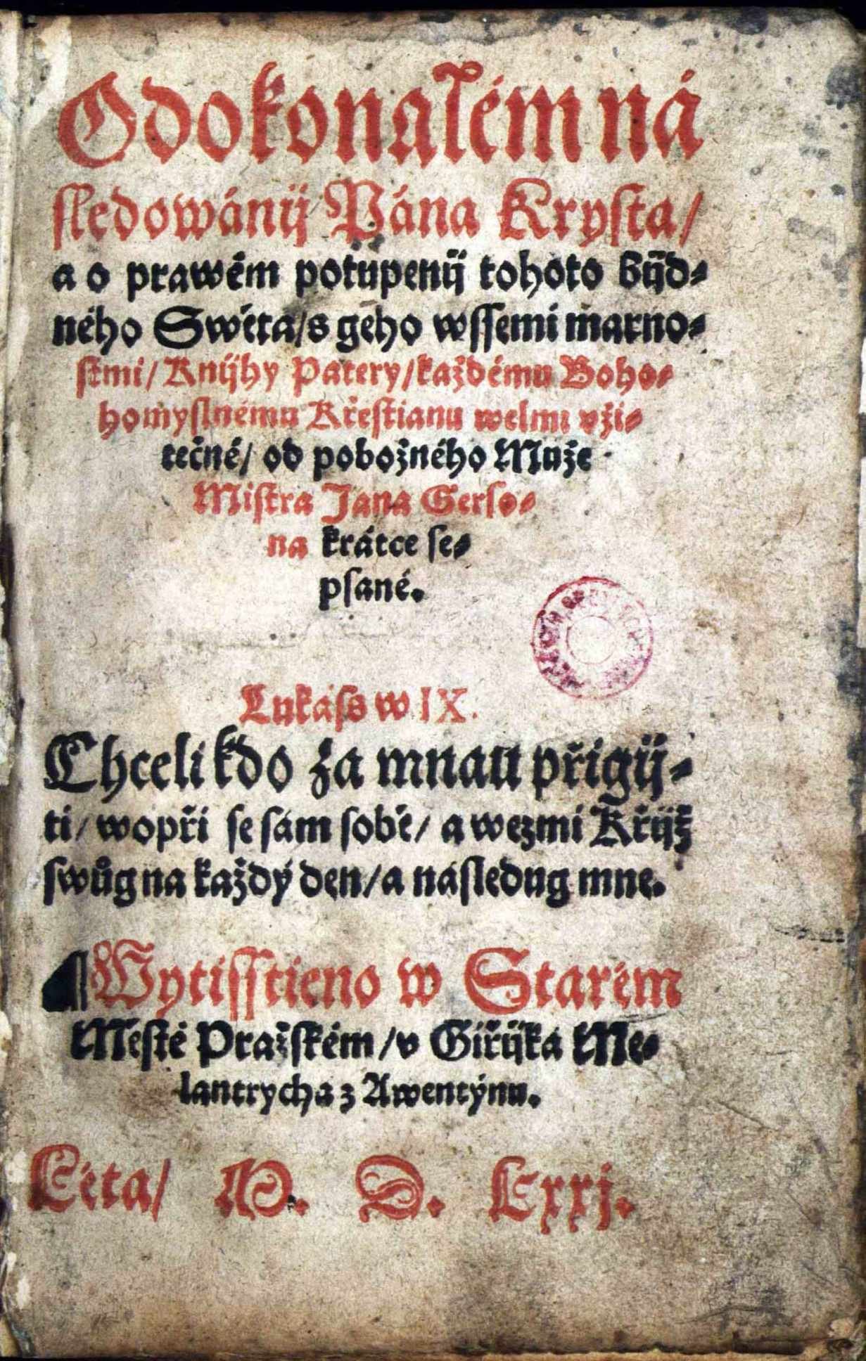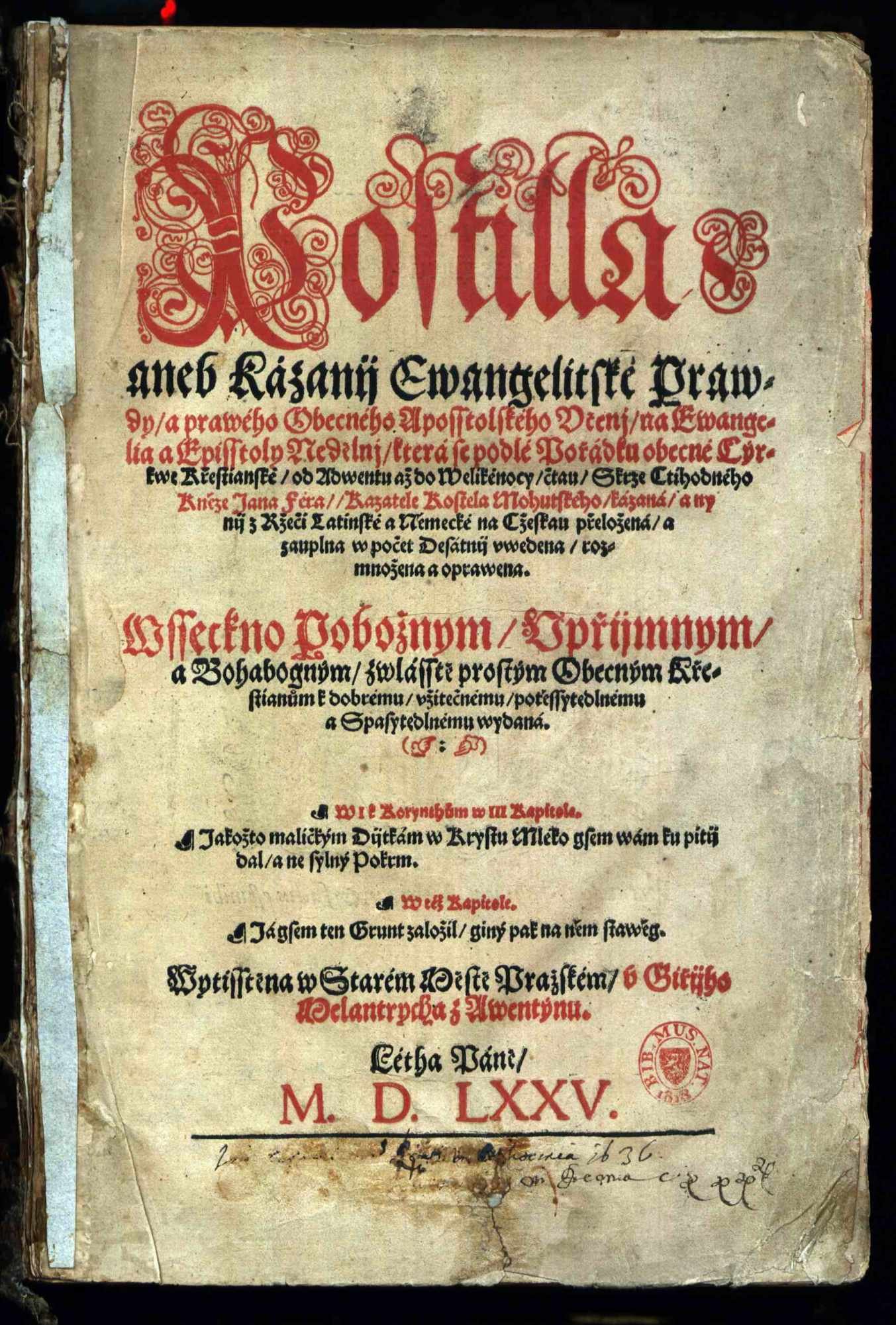 Rukopisy - XVI A 17. Misál Svatovítský Martina Starého, 15. století: fol. 8r, Kristus. Rukopisy - 1 A b 1 α. Část Rukopisu zelenohorského, 19. století: fol. 1r. Rukopisy - III B 10. Krumlovský sborník, 15. století: fol. 67r, Samson se Lvem. Rukopisy - IV B 24. Jenský kodex, 15. století: fol. 10v, Město Antikristovo. Rukopisy - XII A 10. Jaroměřská bible, 13. století: fol. 37v, Obětování beránka. Rukopisy - XII B 13. Františkánská bible, 13. století: fol. 2v, Izaiášovo umučení. Rukopisy - XII B 16. Quadragesimale Nicolai de Straz, rok 1411: fol. 1r, Mikuláš ze Stráže. Rukopisy - XIII B 9. Misál Jana z Dražic, 14. století: fol. 65r, Ukřižování Krista.  Rukopisy - XIV A 9. Epištolář Pražské diecéze: fol. 1v, Sv. Pavel. Rukopisy - XVI A 16. Misál Pražský, 14. století: fol. 17v, Sv. Řehoř I. Veliký. Rukopisy - XVI A 8. Paulinus de Venetiis: Satyrica historia: fol. 1r, Nero. Depozitář Terezín II. Uložení zámecké knihovny Čejetičky Depozitář Terezín II. Uložení starých tisků ze Sálu starých tisků Depozitář Terezín II. Uložení knihovny Gelasia Dobnera Rukopisy - 1 A b 6. Část Rukopisu královédvorského, 19. století: fol. 10v. Rukopisy - 1 A c 86. Rukopisný zlomek, fol. 2v: Seslání Ducha svatého. Staré tisky - 20 B 1. Jacobus Marchantius: Hortus pastorum in quo continetur omnis doctrina fidei et morum ad conciones catechismum... Kolín nad Rýnem : Hermann Dehmen, 1672. Staré tisky - 20 B 5. Biblia sacra vulgatae editionis Sixti V. Pont[ificis]. M[aximi]. iussu recognita, et Clementis VIII auctoritate edita. Praha : František Hladký, 1757. Staré tisky - 26 B 1. Basilius Faber: Dictionarium linguae Latinae, ex Magno Basilii Fabri Thesavro collectum atq[ue] concinnatum … Praha : Jiří Melantrich z Aventina, Daniel Adam z Veleslavína, 1579. Staré tisky - 26 E 2. Philipp Melanchthon: Grammatica Philippi Melanthonis Latina. Iam denvo recognita, et plerisque in locis locupletata … Praha : Jiří Melantrich z Aventina, 1580. Staré tisky - 26 E 27. Dicta Graeciae sapientum, interpretae [!] Erasmo Roterodamo … Praha : Jiří Melantrich z Aventina, 1568. Staré tisky - 26 E 3. Georg Fabricius: Elegantiarvm pverilium ex M. Tullii Ciceronis Epistolis libri tres. Collectia Georgio Fabricio Chemn[icensi] … Praha : Jiří Melantrich z Aventina, 1581. Staré tisky - 26 F 19. Aelius Donatus: Aelii Donati viri clarissimi, de octo partibvs orationis methodus … Praha : Jiří Melantrich z Aventina, 1568. Staré tisky - 27 B 17. Šimon Lomnický z Budče: Pijsně Nowé. Na Ewangelia Swatá Nedělnij přes celý Rok … Praha : Jiří Melantrich z Aventina, 1580. Staré tisky - 27 F 19. Knijha vžitečná y kratochwilná, genž slowe Radda wsselikých nerozumných Zwijřat y Ptactwa … Praha : Jiří Melantrich z Aventina, 1578. Staré tisky - 28 A 1. Pierandrea Mattioli: Herbář aneb Bylinář wysoce včeného a wznesseného P. Doktora Petra Ondřege Mathiola … Praha : Daniel Adam z Veleslavína, 1596. Staré tisky - 28 E 10. Tadeáš Hájek z Hájku: Wypsanij s wyznamenánijm gedné y druhé kométy, kteréž widijny byly března a dubna mesýcuow létha tohoto M,D,LVI. … Praha : Jiří Melantrich z Aventina, 1556 Staré tisky - 28 F 28. Thomas Günther: Knijžka potěssytedlná wssechniem tiehotnym (!) a rodijcým manželkám … Praha : Jiří Melantrich z Aventina, 1567. Staré tisky - 28 G 38. Joannes Gesslerus: Lékařstwij předněgssij a zkussená proti mornijmu nakaženij, z naystarssých lékařuow, od Jana Gesslera … Praha : Jiří Melantrich z Aventina, 1557. Staré tisky - 31 C 2. Daniel Adam z Veleslavína: Kalendář Hystorycský ... Praha : Jiří Melantrich z Aventinu, Daniel Adam z Veleslavína, 1578. Staré tisky - 34 A 1 b. Biblij cžeská, to gest, Wssecká Swatá pijsma obogijho, Starého y Nowého zákona … Praha : Jiří Melantrich z Aventinu, 1570. Staré tisky - 35 A 1. Johann Ferus: Postilla, aneb, Kázanij ewangelitské prawdy a prawého obecného aposstolskeho včenj … Praha : Jiří Melantrich z Aventina, 1575. Staré tisky - 35 B 1. Kniha Gezusa Syracha, ginak, Ecclesiasticus, w kterého zawřijna gsau vtěssená napomenutij … Praha : Jiří Melantrich z Aventina, 1561. Staré tisky - 36 A 10. David Crinitus z Hlaváčova: Fundationes et origines praecipuarum regni Bohemiae, eidemque adiunctarum aliquot urbium … Praha : Jiří Černý z Černého Mostu, 1575. Staré tisky - 36 A 7. Vavřinec Leander Rvačovský z Rvačova: Massopust. Knijha o vwedeňij w prawau o Bohu milau pobožnost … Praha : Jiří Melantrich z Aventina, 1580. Staré tisky - 36 E 1. Urbanus Rhegius: Katechesis Vrbána Rhegia z latinské řečy w cžeskau wnowě přeložená … Praha : Jiří Rožďalovský, 1547. Staré tisky - 36 F 1. Desiderius Erasmus: Knijha Erasma Roterodamského, w kteréž gednomu každému křestianskému cžlowěku naučenij y napomenutij se dáwá ... Praha : Jiří Melantrich z Aventina, 1563. Staré tisky - 36 F 16. Poklad dusse, w kterémžto každý křestianský cžlowěk pod spůsobau přijwětiwého a welmi vtěsseného rozmlauwánj wynaučen a naweden býwá ... Praha : Jiří Melantrych Rožďalovský, 154 Staré tisky - 38 D 36. Thoma a Kempis: O dokonalém následowánij Pána Krysta a o prawém potupenij tohoto bijdného Swěta s geho wssemi marnostmi knijhy patery … Praha : Jiří Melantrich z Aventina, 1571. Staré tisky - Dušek 71. Biblij Cžeská. Cum Gratia et Priuilegio Sacrae Regiae Maiestatis ad Decennium. M. D. XLIX. Praha : Bartoloměj Netolický z Netolic, Jiří Melantrich Rožďalovský, 1549. Staré tisky - Dušek 87. Heinrich Bünting: Itinerarium Sacrae scripturae, to gest, Putowánj swatých na wssecku Swatau biblj obogjho Zákona … Praha : Daniel Adam z Veleslavína, 1592. Rukopisy - I A 15. Písně chval božských, 16. století: fol. 218v, přijímání pod obojí. Rukopisy - II C 7. Jistebnický kancionál, 15. století: fol. 50