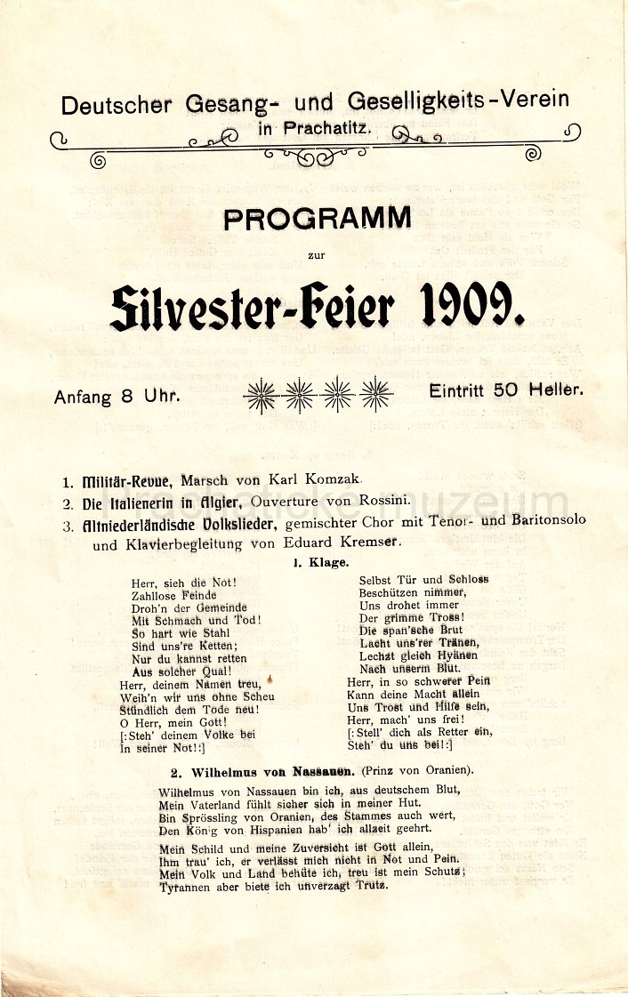 Statistický seznam obcí okresů Prachatice, Volary, Vimperk a Netolice, tištěný dvoulist, 19. stol. Seznam venkovských měst, která měla účast na 1. českém sněmu, tištěný dvoulist, 1848 regionální majetkoprávní záležitosti: Upomínka o zaplacení dlužné částky, rukopis, 1911 regionální majetkoprávní záležitosti: úřední převodní listina soukromých osob, strojopis a rukopis, 1910 regionální majetkoprávní záležitosti: soukromá smlouva, rukopis, 1856 staré tisky: píseň Der Neukreuzer, Zweiter Theil, tištěný dvoulist, německý text, rytina, 19. stol. Šumavské fotoalbum - soubor 50 pohlednic ze Šumavy, vydaný M. Kopeckým ve Vimperku, 1. pol. 20. stol. Seznam venkovských měst, která měla účast na 1. českém sněmu, tištěný dvoulist, 1848 regionální majetkoprávní záležitosti: Dožádání Krumlovského panství magistrátu Prachatic o soukromé osobě, rukopis, 1837 Pilnáčkův kalendář pro naše hospodyňky, reklamní brožura, 1937 papírový sáček na kávu, Jaroslav Kafka Volyně, 1. pol. 20. stol. vánoční pohlednice, 1. pol. 20. stol. pohlednice k Novému roku, 1. pol. 20. stol. pohlednice k Novému roku, 1. pol. 20. stol. vánoční pohlednice, 2. pol. 20. stol. vánoční pohlednice, 1. pol. 20. stol. vánoční pohlednice, 1. pol. 20. stol. vánoční pohlednice, 1. pol. 20. stol. vánoční pohlednice, 1. pol. 20. stol. velikonoční pohlednice, 1. pol. 20. stol. velikonoční pohlednice, 1. pol. 20. stol. pohlednice k Novému roku, 1. pol. 20. stol. pohlednice k Letnicím, 1. pol. 20. stol. vánoční pohlednice, 1. pol. 20. stol. vánoční pohlednice, 1. pol. 20. stol. vánoční pohlednice, 1. pol. 20. stol. vánoční pohlednice, 1. pol. 20. stol. velikonoční pohlednice, 1. pol. 20. stol. velikonoční pohlednice, 1. pol. 20. stol. pohlednice k Letnicím, 1. pol. 20. stol. pohlednice k Letnicím, 1. pol. 20. stol. žánrová pohlednice, ručně malovaná, 1. pol. 20. stol. žánrová pohlednice, ručně malovaná, 1. pol. 20. stol. pohlednice Vlachova Březí, 1. pol. 20. stol. Šumavské fotoalbum - soubor 50 pohlednic ze Šumavy, vydaný M. Kopeckým ve Vimperku, 1. pol. 20. stol. Poznámky k rozdělení krajů a okresů, rukopis, německý text, 19. stol. Poznámky k rozdělení krajů a okresů, rukopis, německý text, 19. stol. pohlednice Boubín, krmení zvěře, 1. pol. 20. stol. pohlednice Volary, 1. pol. 20. stol. papírový sáček na kávovinové náhražky zn. Franck, 1. pol. 20. stol. regionální spolky - program Silvestrovské oslavy v Prachaticích, pořádané Pěveckým spolkem, 1909 pozvánka na Požárnický ples, Netolice 1987 regionální spolky - pozvánka I. Sokolské šibřinky, TJ Sokol Prachatice, 1948 uložení archiválií v depozitáři uložení archiválií v depozitáři pohlednice Stožec, 1. pol. 20. stol. regionální spolky - Program pěveckého spolku ke slavnostem o letnicích 1887 uložení archiválií v depozitáři pohlednice Stožecká kaple, 1. pol. 20. stol. papírový sáček na kávu, O. Fetter Prachatice, 1. pol. 20. stol. papírový sáček na kávu, Bohumil Jelínek Hlušice, 1. pol. 20. stol. pozvánka na Ukázky ze spartakiádních skladeb, Prachatice 1984 regionální spolky - pozvánka na maškarní bál hasičského spolku, Prachatice 1938 regionální spolky - pozvánka I. Sokolské šibřinky, TJ Sokol Prachatice, přední strana, 1948