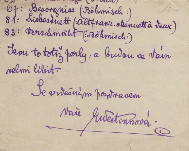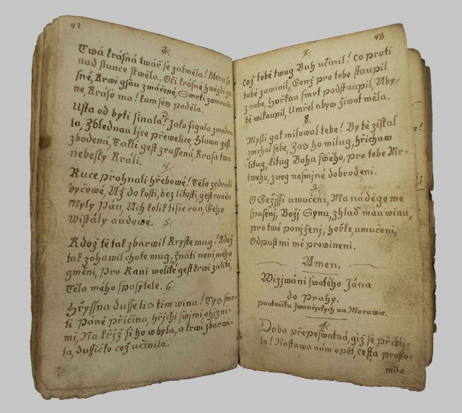 Řeči nedělní (homilie), rukopis, písmo 15. století Modlitební knížka, rukopis, 1746 Knížka právní (opisy právních nařízení, zákonů aj. od r. 1448), rukopis, 1753 Modlitební knížka, rukopis, 1779 Modlitební knížka, rukopis, polovina 18. století, obsahuje mědirytiny Modlitební knížka, rukopis, 1782 Písně k školním radovánkám na Réně, rukopis, 1834 Modlitební knížka, rukopis, počátek 19. století Modlitební knížka, rukopis, 1815 Modlitební knížka, rukopis, 1832 Modlitební knížka evangelická, rukopis, 1. polovina 19. století Dopis Dr. Emila Holuba zaslaný Josefu Vávrovi, řediteli obecné a měšťanské školy v Ivančicích, 25. 8. 1899, (o uspořádání přednášky v Ivančicích) Sešit kuchařských předpisů, rukopis, polovina 19. století Knížka - lidové lékařské předpisy, rukopis Autogram Elišky Krásnohorské, 26. 5. 1918 Rukopis Leoše Janáčka Svitek Ester, pergamen, rukopis, pravděpodobně 19. století Hugo Dusík: Rod pánů Müllerů zakladatelé uhel. dolů Oslavany Paduchov a Zbejšov, rukopis, dat. leden 1929 Rukopis Mikoláše Alše s jeho podpisem, 19. srpna 1903 Rukopis Emy Destinnové s jejím podpisem Olga Hansová: Z mých pamětí. Vzpomínky na rakouský kriminál, rukopis, dat. červenec 1919 Olga Uhrová: Hrnčíři a jejich dílny v Ivančicích, strojopis, dat. 1973 Českobratrský kancionál, zlomek, rukopis, přelom 16. a 17. století. Foto: Ivan Emr Výklad artikulů Bratrstva literátského v Ivančicích, rukopis, 1780 Uložení podsbírky rukopisy Uložení podsbírky rukopisy Uložení podsbírky rukopisy Knížka nábožných písní, rukopis, asi kolem r. 1850