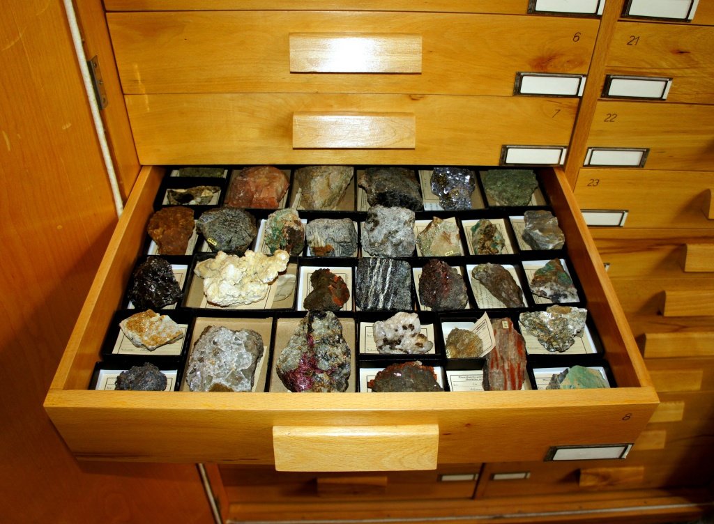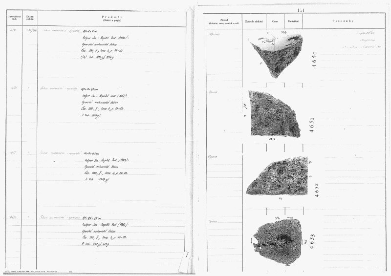 Galenit, Siegen, Vestfálsko, Německo Zlomek meteoritu, Opava-Kylešovice Syenit, Göteborg, Švédsko Baryt- světle cihlové a světle šedé proužky, Moldava, ČR Čedič, Laacher See, Německo Sfalerit, Cavnic, Rumunsko Thulit-fialově červený, Norsko Rubelit, San Diego, Kalifornie, USA Rodonit-karmínově červený, Ural, Rusko Magnetit, Dolní Moravice, ČR Meteorické železo, Opava-Kylešovice Hematit, Medlov - jáma Pikrit - šedohnědý zrnitý, Hodslavice, ČR Křemenný porfyr, Ehrenburg, Ilmenau, Německo Jílovitá břidlice, Hohenberg,  Ilmenau, Německo Siltovec, Ilmenau, Thüringen, Německo Syenit, Plauenscher Grund, Dresden, Německo Diabasový mandlovec, Herborn, Německo Porfyr syenitový, Katzenellenbogen, Německo Lumachelový vápenec, Maralles, Lyon, Francie Biotit v žule, Stará Červená Voda, ČR Albit-drúza hřebenitých bělošedých krystalů, Dolní Bory, ČR Posidoniová břidlice, Geistlichen Berg, Herborn, Německo Chloriticko-mastková břidlice, Harthan, Chemnitz, Německo Syenit, Ilmenau,Německo Achát - leštěný, Brazílie Depozitář - geologická podsbírka Kalcit, Egremont, Anglie Malachit, Tsumeb, JZ Afrika evidenční záznamy sbírkových  předmětu Žula - světlá, Gmünd, Rakousko Heulandit, Fassatal, Itálie Valchovit, Hřebeč u Moravské Třebové, ČR Albit a křemen (záhněda), Cyrilov u Velkého Meziříčí, ČR Chrysotil, Nová Ves u Oslavan, ČR Limnokvarcit, La Fayette Paris, Francie Travertin, Nový Jičín, ČR Křemitý porfyr, Halle an der Saale, Německo Syenit, Plauenscher Grund, Dresden, Německo Tufit diabasový, Karlovice, ČR Křemenný porfyr, Zalas, Krzeszovice, Polsko Křemenný porfyr, Jáchymov - šachta Werner, ČR Rohovec, Andreasberg,Harz, Německo Pískovec, Daun in Eifel, Německo Čedičový tufit, Wolfsberg, Siegburg, Německo Ryolit, Siglitz bei Frankenheim, Německo Ukázka uložení geologické podsbírky Auripigment, Allchar, Makedonie Vápenec - narůžověle šedý s bělošedými žilkami kalcitu, Zlíchov, ČR Bituminózní břidlice, Osterkappeln, Osnabrück, Německo Greisen, Schneckenstein, Německo Lumachelový vápenec, Türkenschanze Wien, Rakousko Trass, Brohl am Rhein, Německo Depozitář - geologická podsbírka Zlomek meteoritu, Opava-Kylešovice