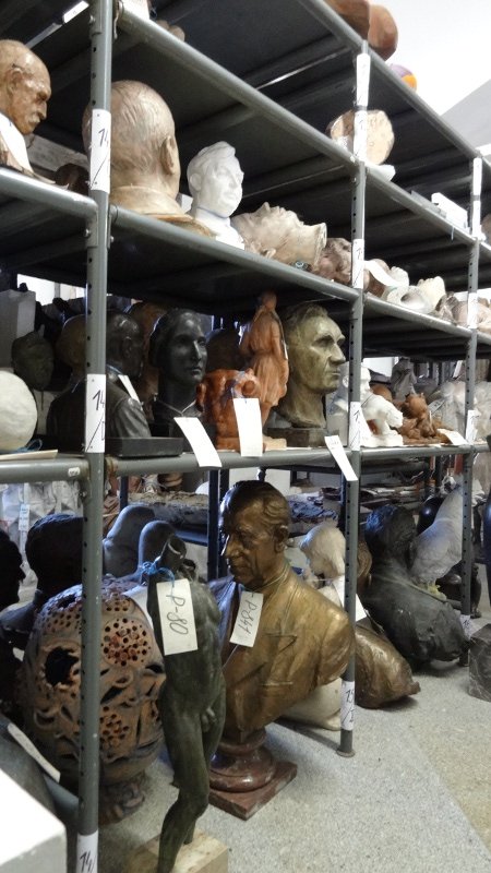 Jan Štursa: Podobizna ředitele Josefa Šimka, 1897, plastika, sádra, v.63,5 cm Jan Štursa: Eva, 1908 - 1909, plastika, bronz, v.190 cm Jan Štursa: Hráč na niněru, 1917, plastika, bronz, v.58 cm Jan Štursa: Vlastní podobizna, 1912 - 1913, plastika, bronz, v.45 cm Jan Štursa: Stavitelství, 1917, plastika, bronz, v.82 cm Jan Štursa: Hlava Krista, (1918 - 1920), reliéf, bronz, v.50 cm, d.50 cm, s.19 cm Jan Štursa: Život uniká, 1904, plastika, bronz, v.54,5 cm Vincenc Makovský: Schoulená, 1932, plastika, bronz, v.50 cm Vincenc Makovský: Podobizna Hany Wichterlové, 1931, plastika, sádra, v.64 cm Vincenc Makovský: Ležící Prométheus, 1935, plastika, patinovaná sádra, v.55 cm, d.123 cm Vincenc Makovský: Kozák, z cyklu Voda v našem životě, 1961 - 1963, reliéf, sádra, v.96 cm, d.135 cm Vincenc Makovský: Koupající se dívka, z cyklu Voda v našem životě, 1961 - 1963, reliéf, sádra, v.91 cm, d.68 cm Josef Klimeš: Tělo, plastika, bronz, v.26 cm, d.56 cm  Josef Klimeš: Podobizna Jiřího Trnky, 1986, plastika, bronz, v.50 cm Josef Klimeš: Boris Pasternak, plastika, bronz, v.53 cm Ladislav Martínek: Dyje, 1964, plastika, bronz, v.27 cm, d.54 cm Josef Klimeš: Paměť starého města, 1996, plastika, bronz, v.58 cm, d.50 cm, s.94 cm Ladislav Martínek: Podobizna Saši, 1968, plastika, bronz, v.39 cm Ladislav Martínek: Ládík, 1981, plastika, patinovaný cín, v.24,5 cm Josef Mařatka: Podobizna Míly Slavíčkové, 1909, plastika, bronz, v.38 cm Josef Mařatka: Podobizna Stanislava Suchardy, 1905, plastika, bronz, v.33,5 cm Josef Mařatka: Podobizna Antonína Slavíčka, 1911, plastika, bronz, v.35 cm, Karel Pokorný: Torzo mužského aktu, 1914 - 1915, plastika, bronz, v.73 cm,   Karel Pokorný: Křest sv. Ludmily, 1934 - 1935, plastika, sádra, v.112,5 cm Karel Pokorný: Studie aktu k Plačící ženě, 1943, plastika, bronz, v.68,5 cm pohled do depozitáře plastik pohled do depozitáře plastik pohled do depozitáře plastik