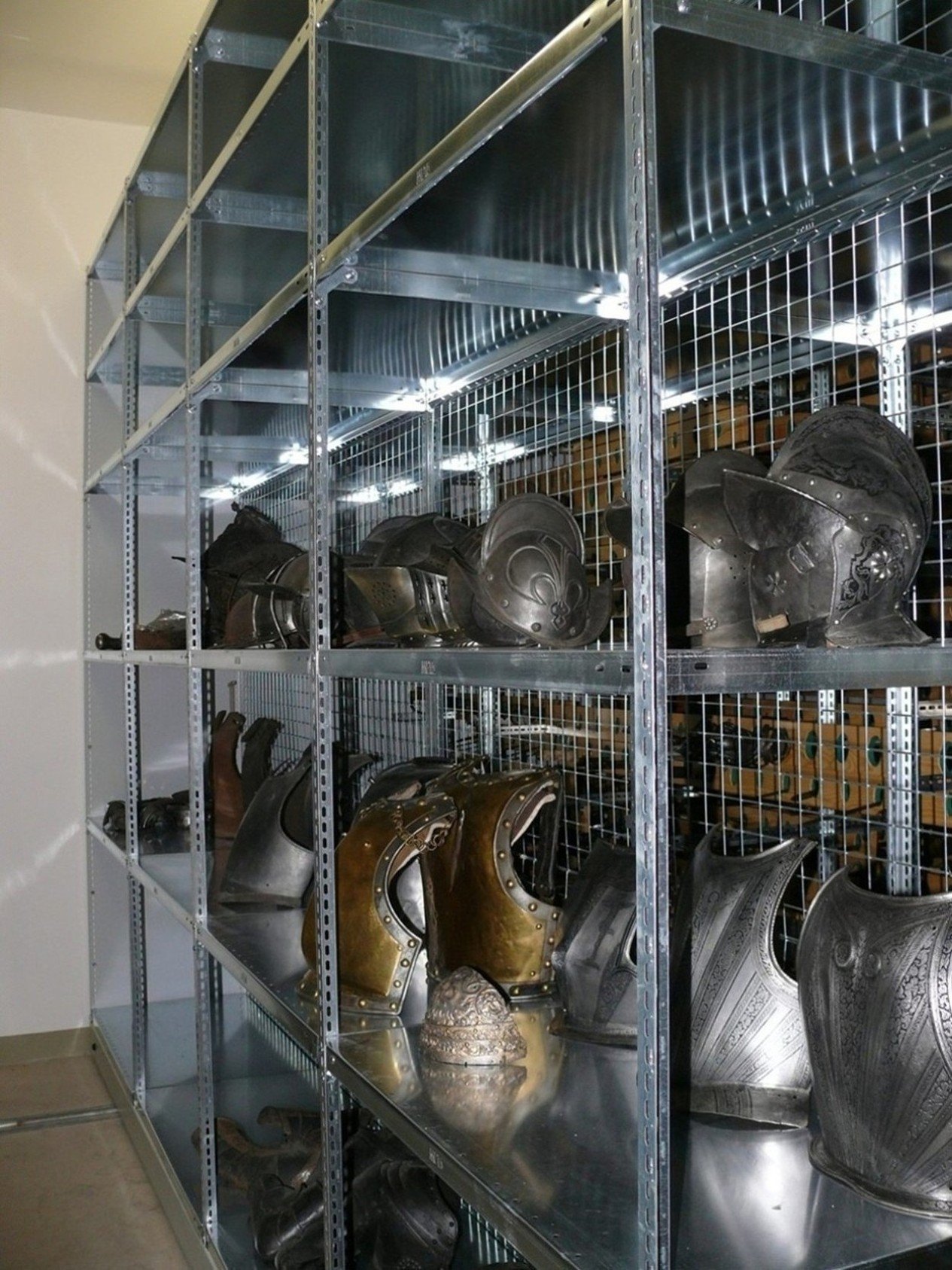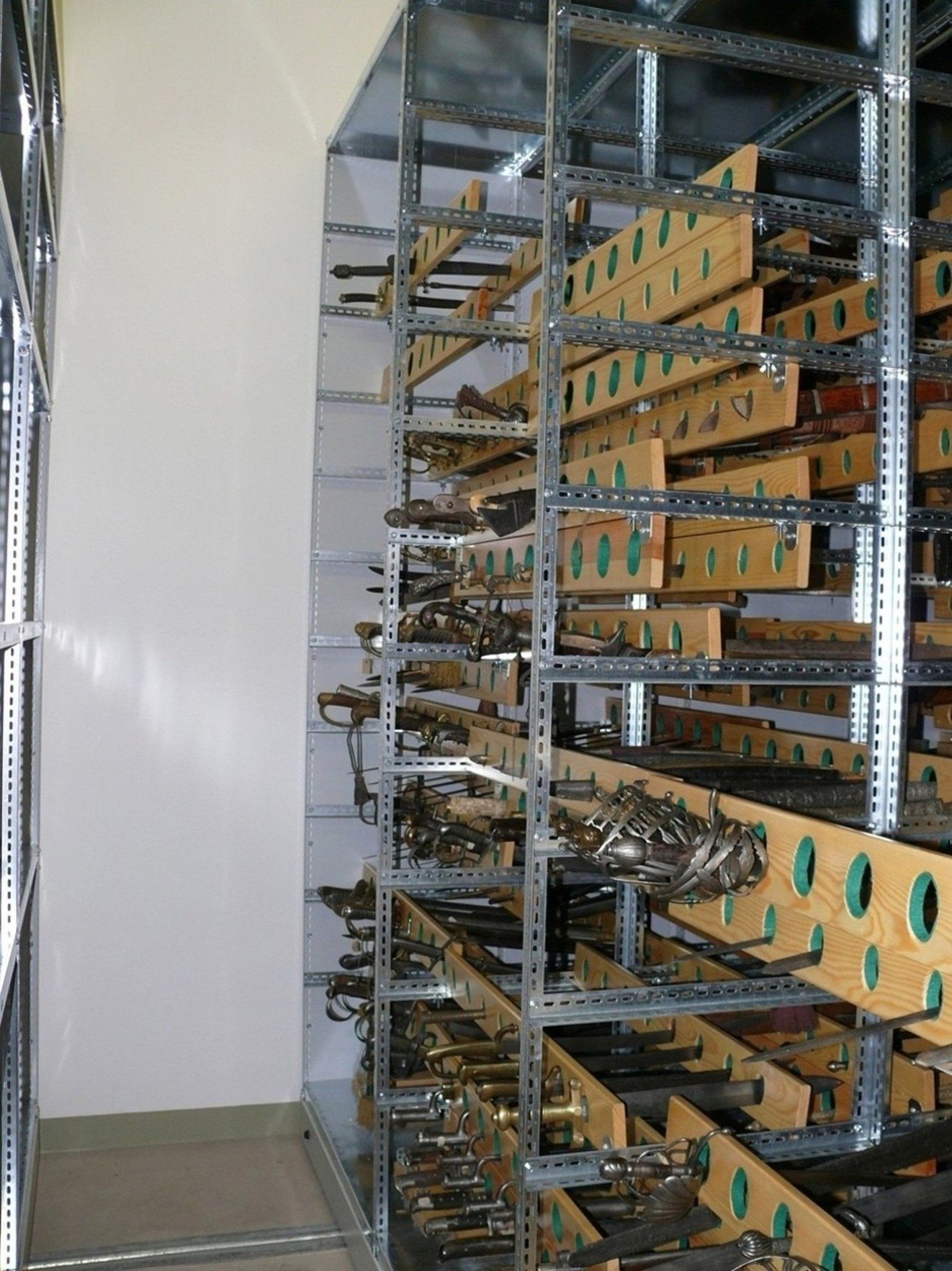 Pohled do depozitáře na uložení sbírky Pohled do depozitáře na uložení sbírky Z413: tachi, ocel, bronz, kůže, dřevo, textil, 18. století, Japonsko Z37: španělský křesadlový zámek, železo, kolem 1700, střední Itálie Z143: pážecí kord, železo, ocel, zlato, stříbro, kolem 1780, Německo Z146: úřednický kord s pochvou, ocel, zlato, mosaz, kůže, kolem 1800, Solingen/Mnichov Z147: dýka, ocel, zlato, dřevo, kůže, kolem 1760, Německo Z148: japonská dýka tanto, ocel, stříbro, mosaz, dřevo, kůže, měď, počátek 17. století, Japonsko Z151: dýka, ocel, 1. polovina 19. století, Německo Z153: úřednický kord, ocel, zlato, dřevo, perleť, mosaz, před rokem 1800, Solingen/Mnichov Z158: meč, ocel, železo, mosaz, 2. polovina 19. století, Německo Z165: meč, ocel, železo, zlato, Juan Martínez, 1. polovina 17. století, Toledo Z170: lovecký tesák s pochvou, ocel, dřevo, želvovina, perleť, kůže, 1730–1740, Německo Z182: jednuška, dřevo, železo, mosaz, zlato, rohovina, J. Schifter, 1730–1740, Neustadt Z201: náhubek pro koně, železo, 1564, Německo Z219: úřednický kord, ocel, zlato, dřevo, polovina 18. století, Francie Z226: lovecký tesák, ocel, mosaz, kůže, polovina 18. století, Německo Z277: lehká kulovnice – těšínka, dřevo, železo, zlato, mosaz, kost, rohovina, 1. polovina 17. století, Těšín Z301: kulovnice s křesadlovým zámkem, dřevo, železo, mosaz, zlato, rohovina, kolem 1700, Německo Z405: šavle s pochvou, ocel, dřevo, kůže, 18. století, Polsko Z409: vakizashi, ocel, dřevo, kůže, textil, meď, počátek 17. století, Japonsko Z417: katar s pochvou, ocel, mosaz, dřevo, samet, 19. století, Indie Z432: ceremoniální nůž, ocel, železo, zlato, dřevo, tkanina, stříbro, počátek 19. století, Indie Z443: kandy s pochvou, ocel, zlato, slonovina, sříbro, dřevo, 19. století, Ceylon Z476: hever ke kuši, železo, dřevo, konopí, 1569, Německo Z481: kolečkový zámek, železo, 3. čtvrtina 16. století, Německo Z501: puška, dřevo, železo, zlato, kost, kůže, stříbro, konec 18. století, Kavkaz Pohled do depozitáře na uložení sbírky