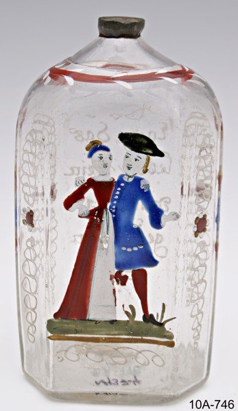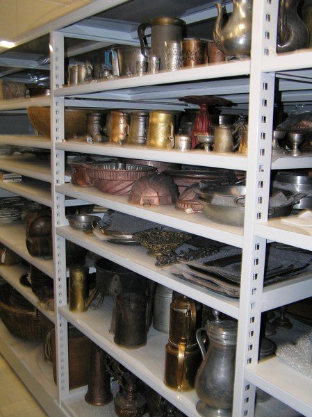 Bronzová kadidelnice z kostela ve Sloupnici byla vystavená na Národopisné výstavě v Praze r. 1895; 14. – 15. stol., inv. č. 10D-181. Čajová konvice z kameniny s hnědou lesklou glazurou; z majetku M. D. Rettigové, poté vlastnil Alois Jirásek a Hana Kvapilová; české země(?), 1. polovina 19. století, inv. č.: 10B-169. Osmiboká pryska malovaná emaily, na čelní straně pár v objetí, na zadní nápis; od sběratele Q. Šimka z Litomyšle; vysočinské sklárny, 3. čtvrt. 18. století, inv. č. 10A-746. Rozměrná ručně malovaná váza se vsazenými polodrahokamy a jinými nerosty; dotvořená sběratelem Q. Šimkem, poč. 20. stol., inv. č. 10B-29. Dvoustěnná číška s fasetováním a malbou (zřejmě bohyně Artemis s nymfami a lovec. psy) na zlaté fólii; po sběrateli Fr. Brinkem z Litomyšle; kolem 1800, inv. č. 10A-26. Číše se dvěma dvojstěnnými medailony a broušeným dekorem, signatura s datací; MILDNER, Johann Joseph, Guttenbrunn, Německo, 1791, inv. č.: 10A-32. Váza z irisovaného zeleného skla zdobená natavenými nitěmi; od sběratele Q. Šimka z Litomyšle; PALME-KÖNIG a HABEL, W., Košťany u Teplic, 1. čtvrt. 20. století, inv. č. 10A-317. Pohár ze zeleného, hutnicky zpracovaného skla ve tvaru römeru, ručně malovaný Q, Šimkem z Litomyšle, z jeho soukromé sbírky; 1856, Litomyšl, inv. č. 10A-320. Lodička z křišťálového skla zdobená broušením; od sběratele Q. Šimka z Litomyšle; výrobce neznámý, střední Evropa, 1. polovina 18. století, inv. č. 10A-359. Figurka plameňáka foukaná z oranžového skla; BRYCHTA, Jaroslav, Železný Brod, 20. - 30. léta 20. století, inv. č.: 10A-451. Karafa z čirého skla uvnitř s figurkou ženy s kloboukem z hutnicky zprac. skla; vysočinské sklárny, 70. - 80. léta 19. století, inv. č.: 10A-567. Šestiboká láhev z čirého skla se zátkou, zdobená rytým matovaným vegetabilním dekorem, nápis: Džbán z fajánse zdobený malbou oráče s bičem a dýmkou a párem býků a koní, datace a signatura: Džbán s malovaným dekorem - žena dívající se do zrcadla a muž s hráběmi, rozsáhlý text, datace Fajánsová váza s dekorem města s hradbou a lodí na moři; značka Vázy zdobené nálepy v podobě střepů porcelánu, sklíček a kovových předmětů včetně mincí; svérázná domácí práce, 19. stol. - 1. čtvrt. 20. st.; inv. č. 10B-1198. Váza z keramiky s bílou glazurou a pestrobarevným dekorem, značka Fajánsový ručně malovaný talíř s vegetabilní výzdobou, datace Hluboký talíř s ruční malbou Vatikánu a italských turistických míst, nápis Fajánsová mísa ve tvaru kardinálského klobouku, s malovaným vegetabilním dekorem, datace Forma na pečení z plechu v podobě rovnoramenného kříže; z majetku M. D. Rettigové; 1. polovina 19. století, inv. č.: 10D-189. Ukázka uložení podsbírky skla, keramiky, jiných nádob a kuchyňského nádobí. Ukázka uložení podsbírky skla, keramiky, jiných nádob a kuchyňského nádobí. Dóza z čirého tenkostěnného skla, na víku rytý matovaný znak města Litomyšl a nápis: Číše ze smaltovaného plechu s barevným potiskem; vyrobeno 400 000 ks u příležitosti korunovace cara Mikuláše II. r. 1896; smaltovna Bartelmus, Plzeň, 1896, inv. č. 10D-68. Dóza s víkem z mosazi, zdobená barevnými přírodními laky, rostlinný dekor tepaný; Indie, poč. 20. století, inv. č. 10D-106. Formanská jídelní souprava v koženém zdobeném pouzdře - dvouzubá vidlička, nůž, ocilka a trubička na víno, na noži značka Ukázka uložení podsbírky skla, keramiky, jiných nádob a kuchyňského nádobí. Dekorační talíř z alabastru, bohatě zdobený, na zrcadle poprsí Michelangela Buonarotti(?); od sběratele Q. Šimka, Benátky, Itálie(?), 2. pol. 19. stol., inv. č. 10C-6. Holba z cínu, na víku plastika lva a rytý monogram s datací Čutora ze dřeva s květinovou malbou, datace