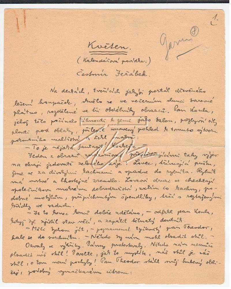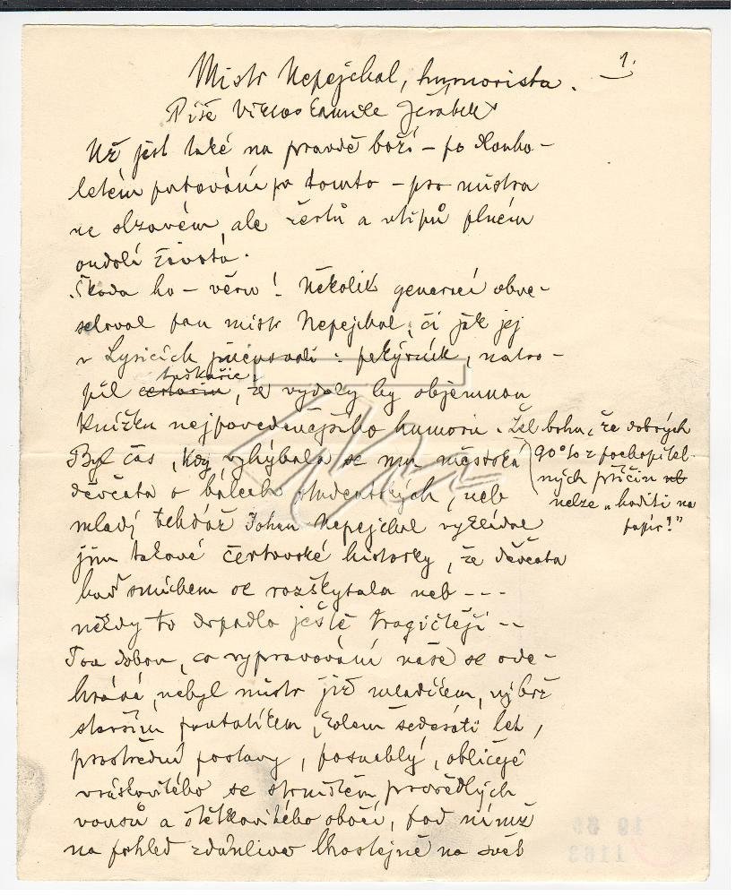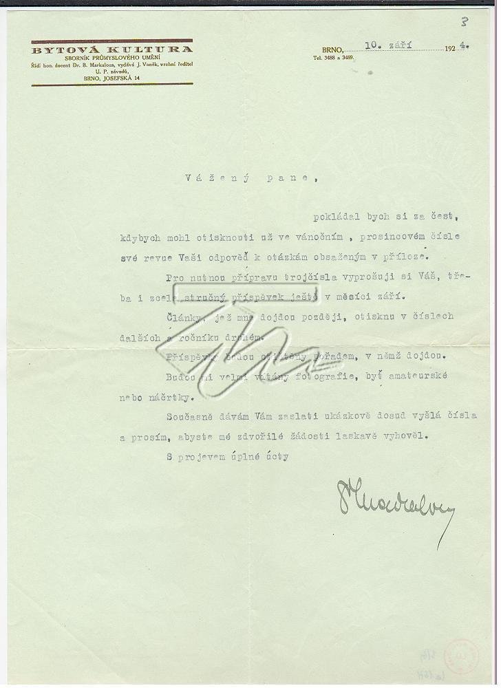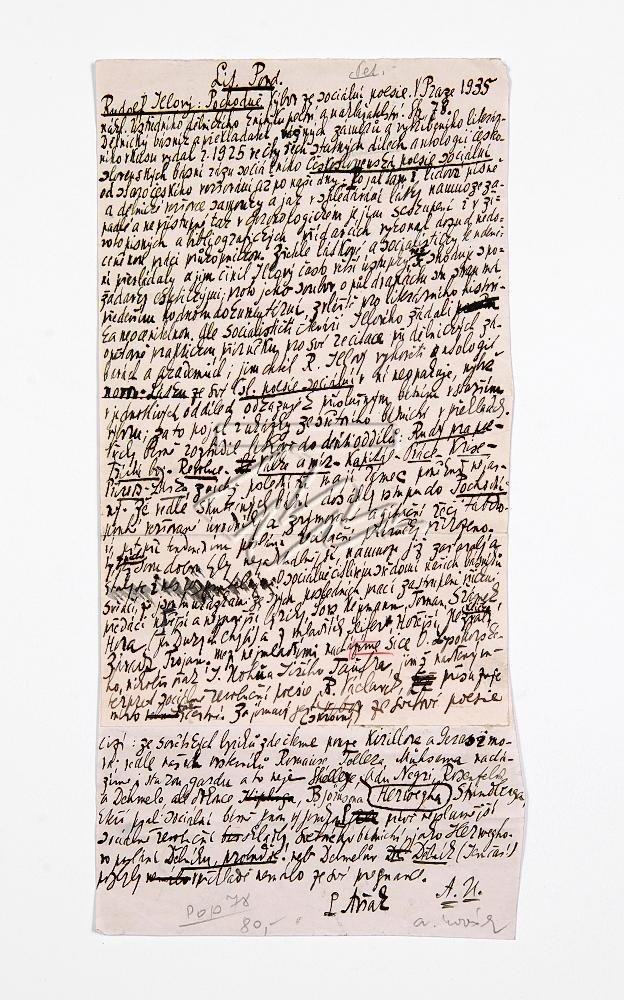 Jan Zahradníček (1905-1960): dopis nejmenovanému příteli, jednání o redakční práci (13.9.1940). 303x213 mm.  František Halas (1901-1949), revers fotografie (č. 85) s věnováním překladateli Aloysu Skoumalovi (1904-1988), b.d., 60x54 mm. František Vymazal (1841-1917), polyglot, překladatel a publicista: lístek nakladateli Janu Ottovi. Perem (22. 11. 1890),  140x91 mm. Legionářský časopis, Singapur 30. 4. 1920 (z pozůstalosti Otakara Jurnečky), 262x209 mm. Lev Blatný (1894-1930), spisovatel-expresionista a dramaturg Národního divadla v Brně: dopis F. X. Šaldovi o uvedení jeho hry Tažení proti smrti. Psáno perem (b.d.), 2x211x134 mm. Josef Večeřa (1856-1883), nejtalentovanější prozaik generace Mladé Moravy, redaktor: rukopis, psáno perem (b.d.), 211x171 mm. Jan Čep (1902-1974), prozaik katolické orientace: rukopis překladu. Psáno perem, s poznámkou pro sazbu v pravém horním rohu (b.d.), 300x211 mm. Dalibor Chalupa (1900-1983), básník, člen Literární skupiny, později rozhlasový dramaturg a režisér: rukopis. Perem (b.d.), 295x211 mm. Čestmír Jeřábek (1893-1981), prozaik stylu psychologického realismu: rukopis pro časopis Host. Perem, pozn. tužkou pro sazbu (b.d.), 210x170 mm. Františka Stránecká (1839-1888), prozaička Vysočiny a Slovácka: ateliérové foto s podpisem (b.d.), 107x66 mm. Jakub Deml (1878-1961), spisovatel, publicista a překladatel, katolický kněz: dopis vydavateli brněnské edice Atlantis Janu V. Pojerovi. Psáno perem (9. 5. 1947), 297x210 mm. Alois a Vilém Mrštíkové: Maryša. Detail. Psáno inkoustem, opravy červeným inkoustem a modrou tužkou (b.d., premiéra 1894). Bibliofilie vydaná u příležitosti Výstavy soudobé kultury v Brně (1928). Výtisk č. 126 s podpisy všech autorů, rozměr strany 191x130 mm. Literární historik Václav Černý (1905-1987): recenze knihy Marcela Prousta. Psáno perem, tužkou poznámka pro sazbu (b.d., pravděpodobně konec 20. let), 208x169 mm. Překladatel Otto František Babler (1901-1984): pohlednice spisovateli Františku Sekaninovi, informace o vydání překladu Dantovy Božské komedie (6.6.1942), 149x104 mm. Josef Florian (1873-1941), nakladatel ve Staré Říši: překlad knihy J. L. Balmese Protestantismus a katolicismus a jejich poměr k evropské civilizaci. Perem (b.d.), 151x188 mm. František Goetz (1894-1974): lektorský posudek hry kolegy z Literární skupiny Čestmíra Jeřábka (1893-1981) Nové vlajky pro Národní divadlo v Praze. Perem (7. 9. 1923),  2x263x174 mm. František Gellner (1881-1914): Nepříjemný nápadník. Kresba tuší (b.d.). V letech 1911-1914 byl Gellner redaktorem a kreslířem přílohy Lidových novin Večery. 411x355 mm. Karel Elgart Sokol (1874-1929), prozaik, dramatik a kritik: recenze pro Lidové noviny (úvod). Psáno perem, nahoře poznámky pro sazbu (11. 2., rok neuveden),  209x169 mm. Jan Dokulil (1910-1974), katolický básník, překladatel: rukopisy básní s tematikou růžencových tajemství. Strojopis s rukopisnými vpisky (b.d.), 296x210 mm. Dům umění města Brna, plakát besedy (25. 3. 1959), uváděl PhDr. Jiří Hájek (pseud. Jiří Hek, 1932-1998), zakladatel a dlouholetý vedoucí Odd. dějin literatury MZM. Tisk,  450x611 mm. Symbolistický básník Otokar Březina (1868-1929): dopis nejmenovanému redaktoru Moderní revue. Psáno perem (11. 1. 1897), 2x174x110 mm. Dopis Petra Bezruče (1867-1958) neurčenému příteli, pocity těsně po skončení 2. světové války. Psáno perem, podepsáno iniciálami V. V.- Vladimír Vašek (23.7.1945), 2x151x104 mm. Volná sebrání, samizdatové bibliofilské soubory originálů uměleckých textů a výtvarných děl, ed. Ludvík Kundera (1920-2010), vycházely 1973-1974. Miloslav Hýsek (1885-1957), literární historik a editor,  spisovatelce Evě Jurčinové (1886-1969). Perem (2. 2. 1949), 2x208x143 mm. Moravské kolo spisovatelů rodině Matěje Anastázii Šimáčka, podepsán předseda V. K. Jeřábek. Perem, hlavičkový papír a razítko spolku (14. 2. 1913), 2x289x230 mm. Josef Mach (1883-1951), spisovatel, redaktor, za první ČSR státní úředník: humoristické verše. Perem (b.d.), 340x207 mm. Josef Kainar (1917-1971), básník, dramatik, textař a publicista: kresba Viléma Reichmanna. Tuš (1957),  232x118 mm. Dopis redakce umělecké revue Host (orgánu Literární skupiny) nakladateli Václavu Petrovi. Hlavičkový papír a razítko organizace (30. 8. 1927), 300x235 mm. Stanislav Kostka Neumann (1875-1947), básník, publicista a překladatel. Rukopis, tužkou, poznámky k sazbě (b.d.), 114x209 mm. Výplata honoráře: týdeník Zvon Gabriele Preissové (1862-1946). Tiskopis, vypsáno perem (31. 10. 1901), 123x156 mm. Bible kralická jednodílná (1596). Vazba snad původní, kožený potah novější (19.-20. stol.). Rukopisné poznámky majitele (psány perem). Jan Herben (1857-1936), prozaik a novinář, nejvýznamnější autor vycházející z hnutí Mladá Morava: rukopis prózy. Perem, poznámky k tisku (b.d.), 212x171 mm. František Halas (1901-1949): amatérská černobílá fotografie, autor neurčen (b.d.), 60x54 mm. Básník, překladatel a publicista František Halas (1901-1949): korespondenční lístek začínajícímu kolegovi Klementu Bochořákovi (1910-1981). Psáno perem (b.d.), 148x104 mm. A. a V. Mrštíkové: Maryša. Vlevo rukopis Aloise Mrštíka (1861-1925), vpravo Viléma Mrštíka (1863-1912). 338x211 a 338x210 mm. Moravské kolo spisovatelů (1912-1949): stanovy. Kopie (průklep) strojopisu (b.d.), 298x210 mm. Alois Gregor (1888-1971) a Pavel Váša (1874-1954): Čítanka pro první třídu středních škol, příprava 4. vyd. (1941) dle okupačních požadavků. Tisk, strojopis, rukopis, 210x146 mm. Josef Holý (1874-1928), básník a dramatik, jako adresát dopisu Jaroslava Kvapila (1868-1950) k akci Manifestu českých spisovatelů. Perem (19. 5. 1917), 2x198x156 mm. Spisovatel a novinář Jaro