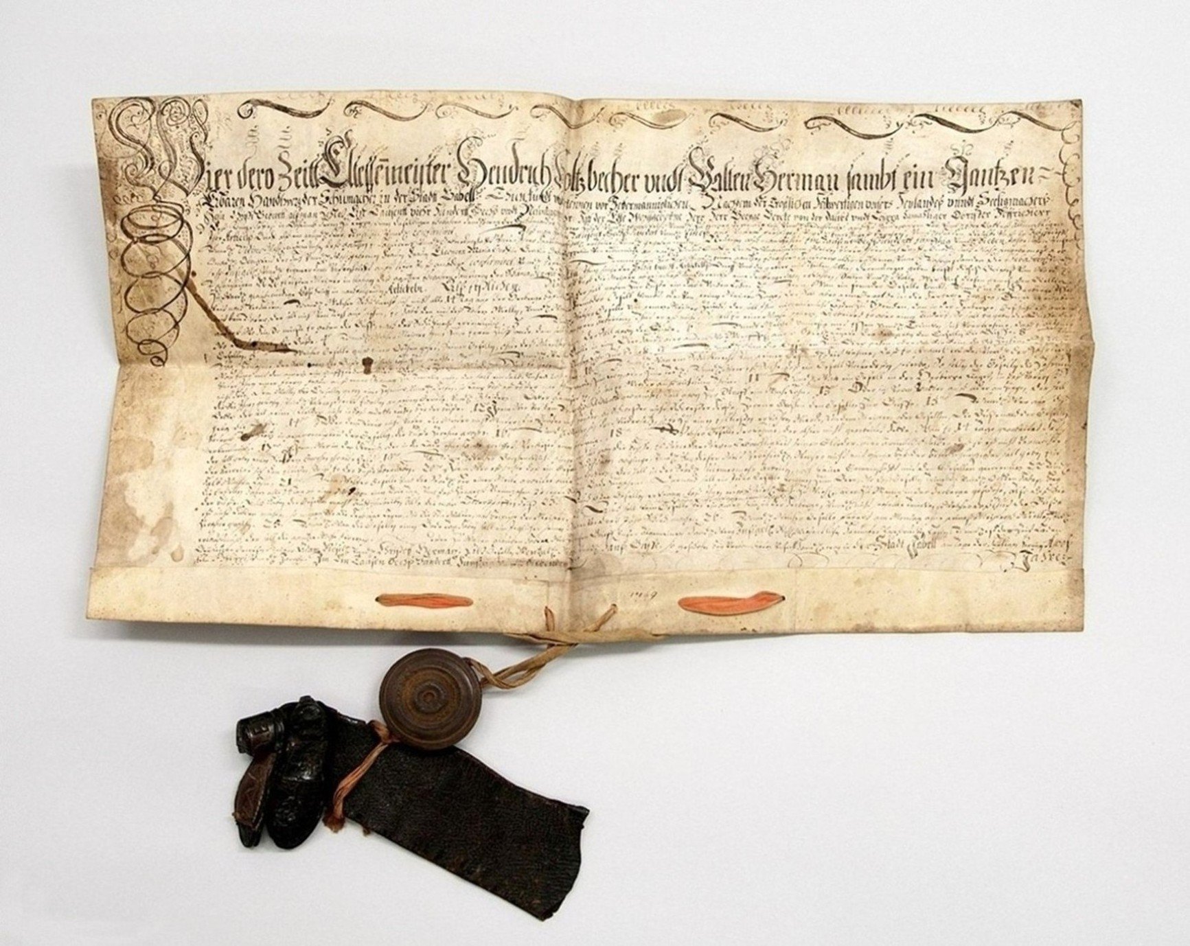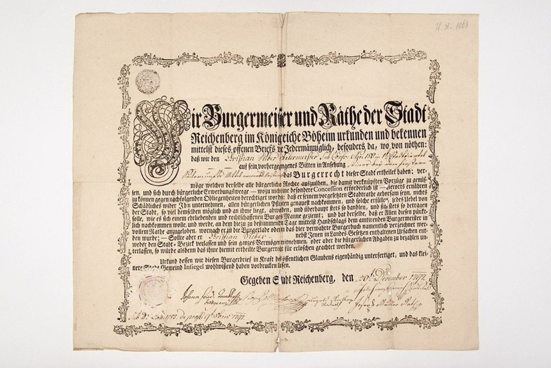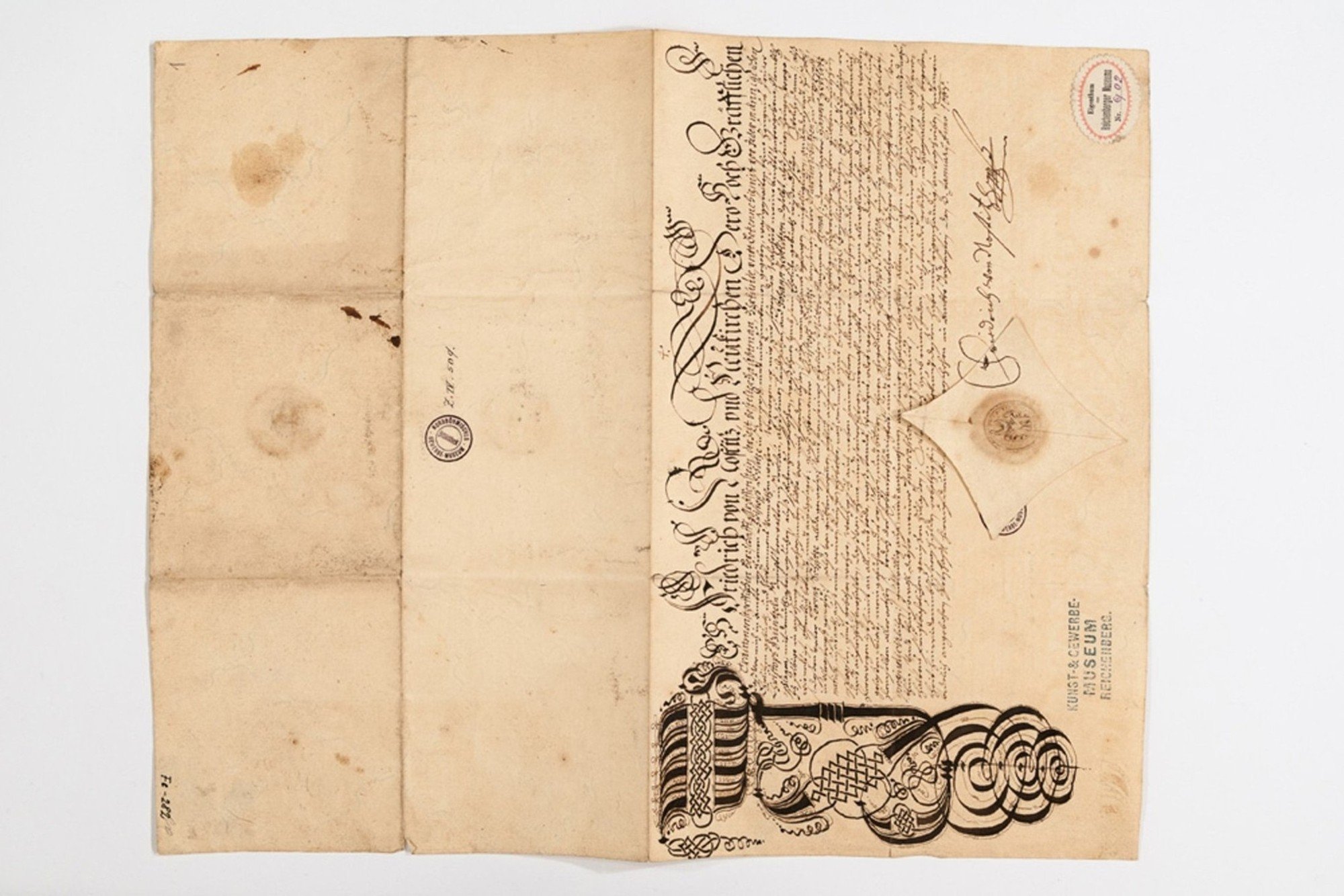 Uložení krabic se sbírkovými předměty v podzemním depozitáři SM Dokumenty ze sbírky Feudalismus v krabicích v podzemním depozitáři SM Ukázka dokumentů uložených v krabicích v podzemním depozitáři SM Fe 252: cechovní kniha provaznického cechu v Liberci, ruční papír, 1661-1694, Liberec Fe 14: znak libereckých soukeníků, dřevořezba, polychromie, 18. století, Liberec Fe 1: náhrobek z klášterního kostela Narození P. Marie, pískovec, 14. století, Klášter Hradiště nad Jizerou Fe 8: obelisk ze štítu liberecké renezanční radnice, pískovec, 1601, Liberec Fe 8: obelisk ze štítu liberecké renezanční radnice, pískovec, 1601, Liberec Fe 10: váha libereckých soukeníků, železo, dřevo, Georg Winkelmann, 1703, Německo, Mariental Fe 11: štít libereckého cechovního divadla, malba na železném plechu, 1820, Liberec Fe 12: model tří domků z let 1678 - 1681 ve Větrné uličce v Liberci, dřevo, kolem 1960, Liberec Fe 12: model tří domků z let 1678 - 1681 ve Větrné uličce v Liberci, dřevo, kolem 1960, Liberec Fe 13: kláda k připoutání provinilců za ruce a nohy, dřevo, železo, 1.polovina 18. století, Liberec Fe: 15 znak libereckých pláteníků, dřevořezba, polychromie, 18. století, Liberec Fe 16: znak punčochářského bratrstva, sekaná, tepaná, rýhovaná, stříbřená měď, 1756, Liberec (?) Fe 17: společný znak tří měšťanů, tepaná, stříbřená, zlacená, polychromovaná měď, 1692, Německo Fe 218: zahradnický výuční list Václava Kaspera z Třebívlic, pergamen, perokresba, 1714, Zahrádky u České Lípy Fe 221: lesnický výuční list Ignatze Keichela ruční papír, perokresba, 1817, Třebívlice Fe 222: myslivecký výuční list Václava Profelda z Louky, ruční papír, perokresba, 1794, Duchcov Fe 252: cechovní kniha provaznického cechu v Liberci, ruční papír, 1661-1694, Liberec Fe 252: cechovní kniha provaznického cechu v Liberci, ruční papír, 1661-1694, Liberec Fe 252: cechovní kniha provaznického cechu v Liberci, ruční papír, 1661-1694, Liberec Fe 273: potvrzení pro F.X.A.Pruggbergera o absolvování práv na univerzitě, pergamen, 1770, Německo, Ingolstadt Fe 273: potvrzení pro F.X.A.Pruggbergera o absolvování práv na univerzitě, pergamen, 1770, Německo, Ingolstadt Fe 273: potvrzení pro F.X.A.Pruggbergera o absolvování práv na univerzitě, pergamen, 1770, Německo, Ingolstadt Fe 273: potvrzení pro F.X.A.Pruggbergera o absolvování práv na univerzitě, pergamen, 1770, Německo, Ingolstadt Fe 280: osvobozovací list pro Wolffa Bräunbecka a jeho rodinu, ruční papír, 1631, Benátky nad Jizerou Fe 280: osvobozovací list pro Wolffa Bräunbecka a jeho rodinu, ruční papír, 1631, Benátky nad Jizerou Fe 282: osvědčení o původu a narození Christopha Schütze, ruční papír, 1668, Grabštejn Fe 302: kniha kontribucí a dodávek pro armádu Christiana Riegera, ruční papír, 1757-1763, Liberec Fe 352: kramářský tisk Fe 656: povýšení do šlechtického stavu pro J.A.Scheinera podepsané Marií Terezií, pergamen 1747, Rakousko, Vídeň Fe 273: potvrzení pro F.X.A.Pruggbergera o absolvování práv na univerzitě, pergamen, 1770, Německo, Ingolstadt Fe 273: potvrzení pro F.X.A.Pruggbergera o absolvování práv na univerzitě, pergamen, 1770, Německo, Ingolstadt Fe 273: potvrzení pro F.X.A.Pruggbergera o absolvování práv na univerzitě, pergamen, 1770, Německo, Ingolstadt Fe 273: potvrzení pro F.X.A.Pruggbergera o absolvování práv na univerzitě, pergamen, 1770, Německo, Ingolstadt Fe 273: potvrzení pro F.X.A.Pruggbergera o absolvování práv na univerzitě, pergamen, 1770, Německo, Ingolstadt Fe 275: cechovní artikuly barvířů plátna a mandlířů, pergamen, J.G.Spiellmann, 1751, habsburská monarchie Fe 277: výuční list krejčího J. A.Pachmanna, vydaný cechem pláteníků, krejčích a ševců, ruční papír, 1771, Javorná Fe 280: osvobozovací list pro Wolffa Bräunbecka a jeho rodinu, ruční papír, 1631, Benátky nad Jizerou Fe 280: osvobozovací list pro Wolffa Bräunbecka a jeho rodinu, ruční papír, 1631, Benátky nad Jizerou Fe 282: osvědčení o původu a narození Christopha Schütze, ruční papír, 1668, Grabštejn Fe 282: osvědčení o původu a narození Christopha Schütze, ruční papír, 1668, Grabštejn Fe 282: osvědčení o původu a narození Christopha Schütze, ruční papír, 1668, Grabštejn Fe 290: artikuly ševcovského cechu, pergamen, rukopis, 1657, Jablonné v Podještědí Fe 308: představení cechu cíchařů a tkalců potvrzují tovaryši J.Sallemonovi, že u nich dva roky pracoval, 1796, Liberec Fe 310: udělení měšťanského práva provaznickému mistru Christianu Sieberovi, ruční papír, 1797, Liberec Fe 319: potvrzení pro cech barvířů na černo a krasobarvířů o zaplacení dluhu 25 zl. kostelu sv. Kříže, 1815, Liberec Fe 352: kramářský tisk Fe 352: kramářský tisk