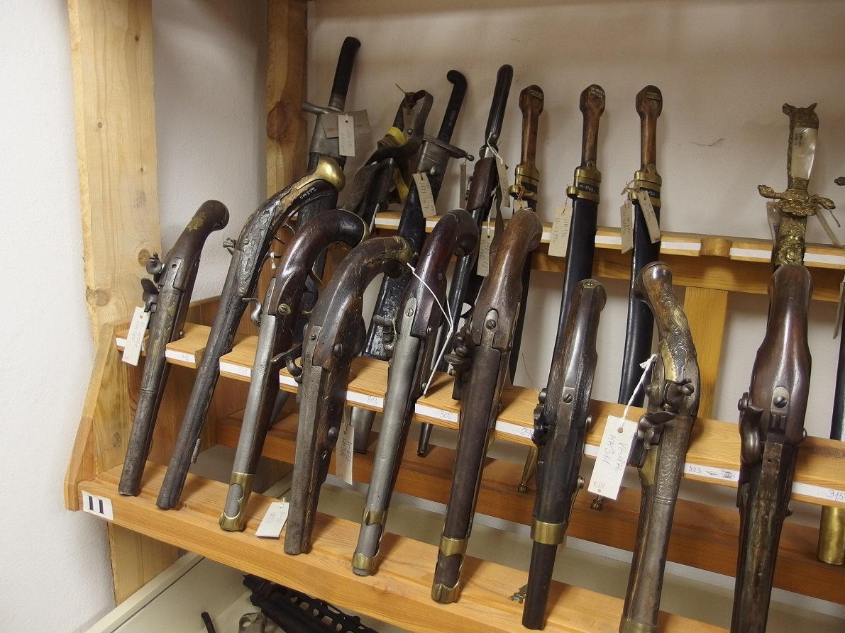 Německá signální pistole “Mauser“ Vojenská puška - předovka Civilní pistole s perkusním zámkem Pětiranný bubínkový revolver Rakouský myslivecký bodák Pohled do depozitáře Podsbírky Historická militaria Čáka rakouského poddůstojníka Polní láhev – čutora Železná píka, bez ratiště Kovaná halapartna, bez ratiště Kostěná prachovnice na střelný prach Rakouská šavle s třapcem a pochvou Litinový hmoždíř, ráže 30 mm Lovecký tesák s koženou pochvou Ruský dělostřelecký kinžal Rakouský tulejový bodák pro pušku Lorenz Ostrostřelecká důstojnická epoleta Dragounská důstojnická přilba Šavle rakouského tambora s pochvou Ruský zákopnický tesák Španělská pistole zn. “Martin A. Bascaran“ Železná dělová koule Torzo železného granátu Lovecká dvouhlavňová brokovnice Vojenský útočný nůž - bodák Ocelová přilba vzor M 29 Pohled do depozitáře Podsbírky Historická militaria Pohled do depozitáře Podsbírky Historická militaria