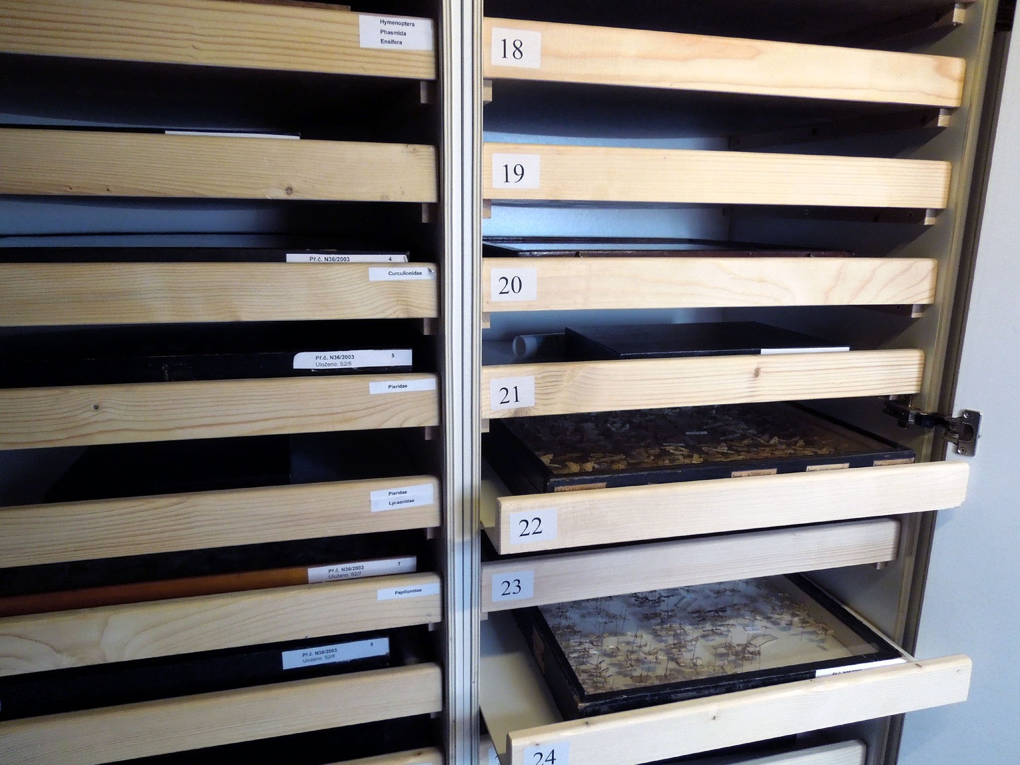 Inv. č. E8197  N36/2003  Laphria gibbona, lok. Rokycansko, dat. sběru 13. 11. 1994, koupě, lgt. Procházka, det. Procházka. karta E4604 Eurythyrea quercus Inv. č. E7756  N16/2000  Anthia pachyoma,  lok. Okavango Maun, dat. sběru 1. 11. 1998, koupě, lgt. Svoboda, det. Svoboda.   Inv. č. E9345  N36/2003  Parnassius apollo, lok. Malá Fatra, dat. sběru 1. 7. 1952, koupě, lgt. Rudolf,  det.  Rudolf. Inv. č. E8374  N36/2003   Scolia sp.,  lok. Fiĺakovo, dat. sběru 21. 7. 1955, koupě, lgt. Procházka, det. Procházka. Inv. č. E5296  N19/1996  Lucanus cervus , lok. Štúrovo, dat. sběru: 25. 6. 1980, koupě, lgt. Hanousek, det. Hanousek. Inv. č. E8001  N16/2000  Battaria, lok. Akavango Maun, dat. sběru 10. 11. 1998, koupě, lgt. Svoboda, det. Svoboda. Inv. č. E4604  N19/1996  Eurythyrea quercus, lok. Ladná, dat. sběru 14. 7. 1980, koupě, lgt. Kaláb, det. Kaláb. Inv. č. E7925  N16/2000  Scarabaeus sacer, lok. Morelos Cuantlos, dat. sběru 13. 11. 1994, koupě, lgt. Svoboda,  det. Svoboda. Inv. č. E6065  N12/1998  Procrustes coriaceus rugifer, lok. Sázava, dat. sběru 1. 9. 1982, koupě, lgt. Janata, det. Janata. Inv. č. E6372  N12/1998  Pachyta quadrimaculata, lok. Hlinky, dat. sběru  29. 6. 1992, koupě, lgt. Pokorný, det. Pokorný. Inv. č. E9646  N36/2003  Papilio machaon , lok. Bulharsko, dat.  sběru  25. 7. 1976, koupě, lgt. Procházka, det. Procházka. Inv. č. E7999  N16/2000  Ephippigeridae, lok. Springbok, dat. sběru 5. 11. 1998, koupě, lgt. Svoboda, det. Svoboda. Uložení entomologických krabic ve skříních v depozitáři Př. č. N36/2003 inv. č. E9237 Colias hyale L.  Rokycansko, sbírka Jaroslava Procházky, starý materiál - koupě Př. č. N19/1996, Inv. č. E1755 Polyphylla fullo l., Bulharsko, Varna-Kančia, leg. Hanousek, sbírka O. Wolfa, koupě Př. č. N36/2003 Inv. č. E9443 Lycaena virgaureae, sine loc, sbírka Jaroslava Procházky, starý materiál - koupě. Př. č. N36/2003 Inv. č. E10727 Melanargia galathea, sbírka Jaroslava Procházky, starý materiál - koupě Př. č. N1996 Inv. č. E6 Calosoma sycophanta,  Bulharsko - Primorsko,  VI./19774, leg. L. Rektořík,  sbírka O. Wolfa, koupě. Př. č. N36/2003 inv. č. E9256 Gonepteryx rhamni L. sine loc, sbírka Jaroslava Procházky, starý materiál-koupě Př. č. N19/1996 Inv. č. E1478 Dolichus halensis, Plešivec- Slovensko,  17.6. 1976, Leg. Brožík, sbírka O. Wolfa Př. č. N19/1996 Inv. č. E2 Calosoma reticulatum, Slovensko - Prašice, leg. Kozický,28. 7. 1979, sbírka O. Wolfa, koupě. Uložení entomologických sbírek v policích v prachotěsných skříních Př. č. N19/1996 Inv. č. E4551 Chalcophora mariana, Rokycany, leg. et det. O. Wolf, 12. 6. 1980 koupě od sběratele. Př. č. N36/2003 Inv. č. E10716 Colias chrysotheme, sine, sbírka Jaroslava Procházky, starý materiál - koupě. Př. č. N36/2003 inv. č. E9270 Aporia crataegi L. , Filakovo,12. 6. 1956, sbírka Jaroslava Procházky, starý materiál - koupě Inv. č.E5389  N19/1996  Nicrophorus humator, lok. Rokycany, 362 m n. m., dat. sběru 1982,  koupě, lgt. Volf, det. Volf. Př.č. N19/1996 Inv. č. E23 Cychrus caraboides L. , Slovensko-vihorlat, leg. Hanousek, 26. 7. 1985, sbírka O. Wolfa, koupě.