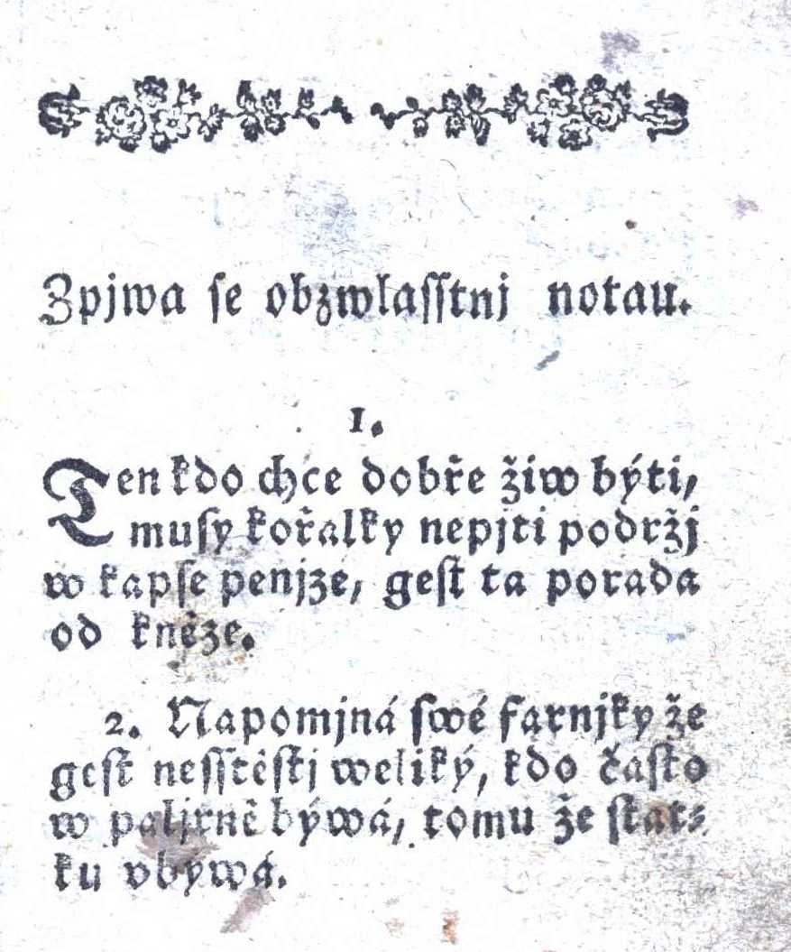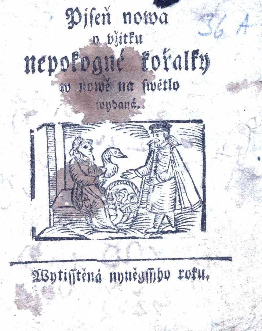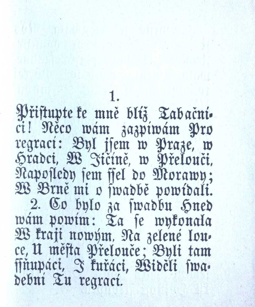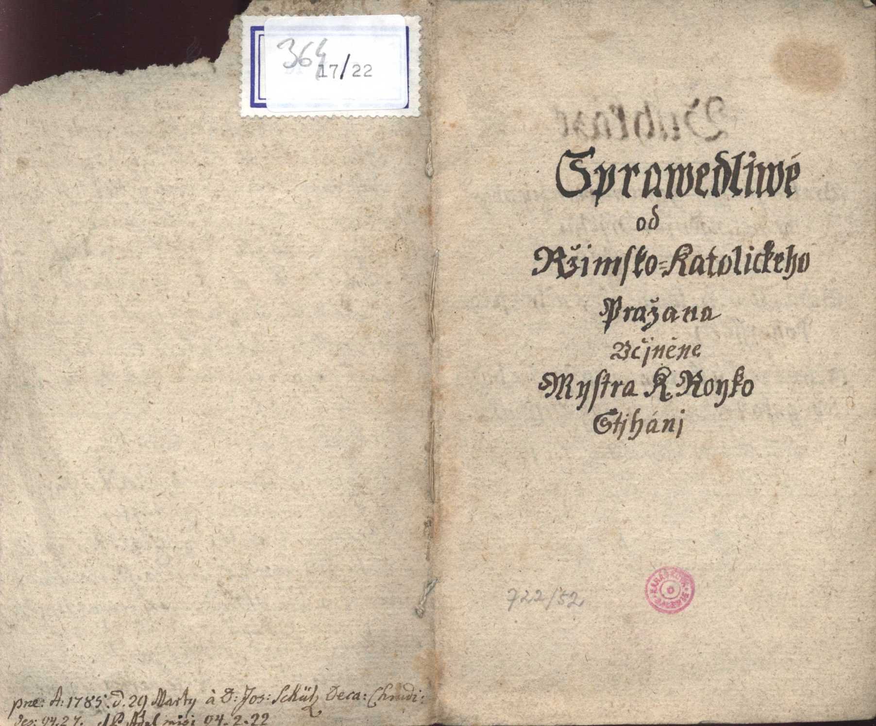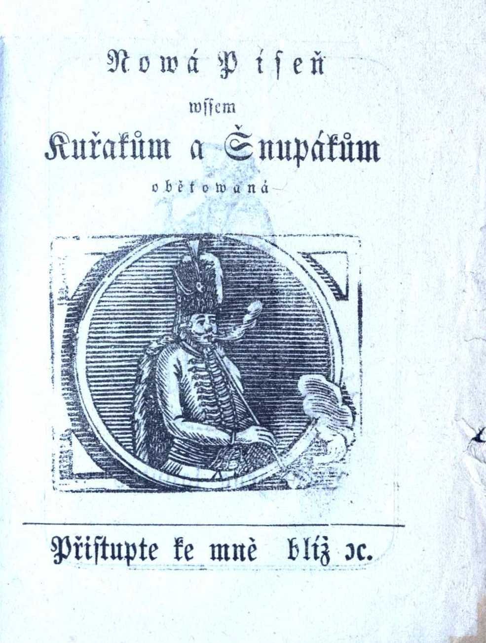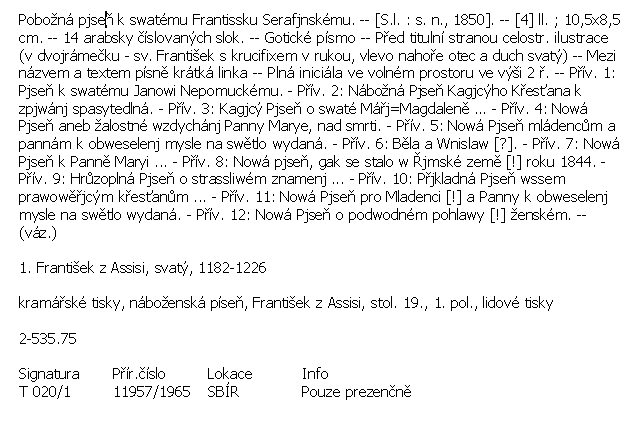Evidenční záznam kramářského tisku Depozitář podsbírky písemností a tisků  Mejstřík, Martin : Štít Marie Panny aneb Katolické modlitby, 1791, pag. I. Sign. RKP I 108 Jöcher, Christian Gottlieb : Compendiöses Gelehrten-Lexicon... . - [Lipsko] : Johann Friedrich Gleditsch - syn [i.e. Johann Gottlieb Gleditsch], 1726. - Titulní strana. - Sign. S C 28 Jöcher, Christian Gottlieb : Compendiöses Gelehrten-Lexicon... . - [Lipsko] : Johann Friedrich Gleditsch - syn [i.e. Johann Gottlieb Gleditsch], 1726. - Nesign. mědirytinový frontispis. - Sign. S C 2 Depozitář podsbírky písemností a tisků Kristián z Koldína, Pavel : Práva a zřízení zemská Království českého v krátkou summu uvedená. - Praha : Jiří Nigrín, 1583. Titulní list (l. [1]a). Srov. Knihopis, č. 4.574. Sign. S II c 3. Jöcher : Gelehrten-Lexicon ... 1. - Lipsko : Gleditsch - dědicové, 1750. - Mědirytinový frontispis Johanna Christiana Gottfrieda Fritzsche podle předlohy Eliase Gottlieba Hausmanna. - Sign. S C 29 Skrbenský z Hříště, Kryštof Bernard : Lamentací na práva..., 1679, fol. [2]r (resp. pag. III). Sign. RKP I 4 Erronei ac Heretici Dogmatis ... Articuli. - Praha : Mikuláš Konáč z Hodištkova, [1520-1528]. Titulní list (l. [1]a (sign A1a)). Srov. BCBT 16. stol., Ar, č. 2-6. Sign. S XII f 6. Píseň nová o užitku nepokojné kořalky vnově na světlo vydaná. - [S.l.] : [s.t.n.], [1850], l. [1]a. Sign. T 31-36 Píseň nová o užitku nepokojné kořalky vnově na světlo vydaná. - [S.l.] : [s.t.n.], [1850], l. [1]b. Sign. T 31-36 Píseň nová o užitku nepokojné kořalky vnově na světlo vydaná. - [S.l.] : [s.t.n.], [1850], l. [3]a. Sign. T 31-36 Nová píseň všem kuřákům a šňupákům obětovaná. - Uherská Skalice : Josef Škarnicl - dědicové, [s.a.], l. [1]a. Sign. T 302 Dopis Athanasia a Sancto Josepho [Eliáše Sandricha] Janu Markvartovi Kocovi z Dobrše obsahující genealogické údaje k rodu Koců, 1768, 10. června. Adresa (in rubro). Sign. RKP II 80 Nová píseň všem kuřákům a šňupákům obětovaná. - Uherská Skalice : Josef Škarnicl - dědicové, [s.a.], l. [3]a. Sign. T 302 Píseň nová o užitku nepokojné kořalky vnově na světlo vydaná. - [S.l.] : [s.t.n.], [1850], l. [2]b. Sign. T 31-36 Píseň nová o užitku nepokojné kořalky vnově na světlo vydaná. - [S.l.] : [s.t.n.], [1850], l. [3]b. Sign. T 31-36 Zahradníček, František: Nová píseň k výstraze všem pijákům kořalky. - Praha : Jan Spurný, 1859, l. [1]a. Sign. T 33-34 Zahradníček, František: Nová píseň k výstraze všem pijákům kořalky. - Praha : Jan Spurný, 1859, l. [1]b. Sign. T 33-34 Zahradníček, František: Nová píseň k výstraze všem pijákům kořalky. - Praha : Jan Spurný, 1859, l. [2]a. Sign. T 33-34 Zahradníček, František: Nová píseň k výstraze všem pijákům kořalky. - Praha : Jan Spurný, 1859, l. [2]b. Sign. T 33-34 Píseň nová o užitku nepokojné kořalky vnově na světlo vydaná. - [S.l.] : [s.t.n.], [1850], l. [2]a. Sign. T 31-36 Píseň nová o užitku nepokojné kořalky vnově na světlo vydaná. - [S.l.] : [s.t.n.], [1850], l. [4]a (l. [4]b vacat). Sign. T 31-36 Nová píseň všem kuřákům a šňupákům obětovaná. - Uherská Skalice : Josef Škarnicl - dědicové, [s.a.], l. [1]b. Sign. T 302 Nová píseň všem kuřákům a šňupákům obětovaná. - Uherská Skalice : Josef Škarnicl - dědicové, [s.a.], l. [2]a. Sign. T 302 Nová píseň všem kuřákům a šňupákům obětovaná. - Uherská Skalice : Josef Škarnicl - dědicové, [s.a.], l. [2]b. Sign. T 302 Nová píseň všem kuřákům a šňupákům obětovaná. - Uherská Skalice : Josef Škarnicl - dědicové, [s.a.], l. [3]b. Sign. T 302 Nová píseň všem kuřákům a šňupákům obětovaná. - Uherská Skalice : Josef Škarnicl - dědicové, [s.a.], l. [4]a. Sign. T 302 Nová píseň všem kuřákům a šňupákům obětovaná. - Uherská Skalice : Josef Škarnicl - dědicové, [s.a.], l. [4]b. Sign. T 302 Spravedlivé od římsko-katolického Pražana učiněné Mistra Kašpara Royko stíhání, 1785, fol. [1]v-[2]r. - Rýmovaný pamflet proti osvícenskému církevnímu historiku Kašparu Roykovi. Sign. RKP I 364 Spravedlivé od římsko-katolického Pražana učiněné Mistra Kašpara Royko stíhání, 1785, fol. [1]r-[4]v. - Rýmovaný pamflet proti osvícenskému církevnímu historiku Kašparu Roykovi. Sign. RKP I 364 Spravedlivé od římsko-katolického Pražana učiněné Mistra Kašpara Royko stíhání, 1785, fol. [3]v-[4]r. - Rýmovaný pamflet proti osvícenskému církevnímu historiku Kašparu Roykovi. Sign. RKP I 364 Dopis Athanasia a Sancto Josepho [Eliáše Sandricha] Janu Markvartovi Kocovi z Dobrše obsahující genealogické údaje k rodu Koců, 1768, 10. června. Sign. RKP II 80 Dopis Athanasia a Sancto Josepho [Eliáše Sandricha] Janu Markvartovi Kocovi z Dobrše obsahující genealogické údaje k rodu Koců, 1768, 10. června. Sign. RKP II 80 Spravedlivé od římsko-katolického Pražana učiněné Mistra Kašpara Royko stíhání, 1785, fol. [2]v-[3]r. - Rýmovaný pamflet proti osvícenskému církevnímu historiku Kašparu Roykovi. Sign. RKP I 364 Jöcher, Christian Gottlieb : Allgemeines Gelehrten-Lexicon ... 1., A-C. - Lipsko : Johann Friedrich Gleditsch - dědicové, 1750. - Titulní strana. - Sign. S C 29/1 Katalog profesorské knihovny učitelského ústavu ve Sv. Janu pod Skalou. - Přiložený protektorátní seznam zakázaných knih, jež mají být z knihovny vyřazeny, 1940, l. [1]a. - Sign. RKP IV 13 Katalog profesorské knihovny učitelského ústavu ve Sv. Janu pod Skalou. - Přiložený protektorátní seznam zakázaných knih, jež mají být z knihovny vyřazeny, 1940, l. [1]b. - Sign. RKP IV 13 Katalog profesorské knihovny učitelského ústavu ve Sv. Janu pod Skalou. - Přiložený protektorátní seznam zakázaných knih, jež mají být z knihovny vyřazeny, 1940, l. [2]a. - Sign. 