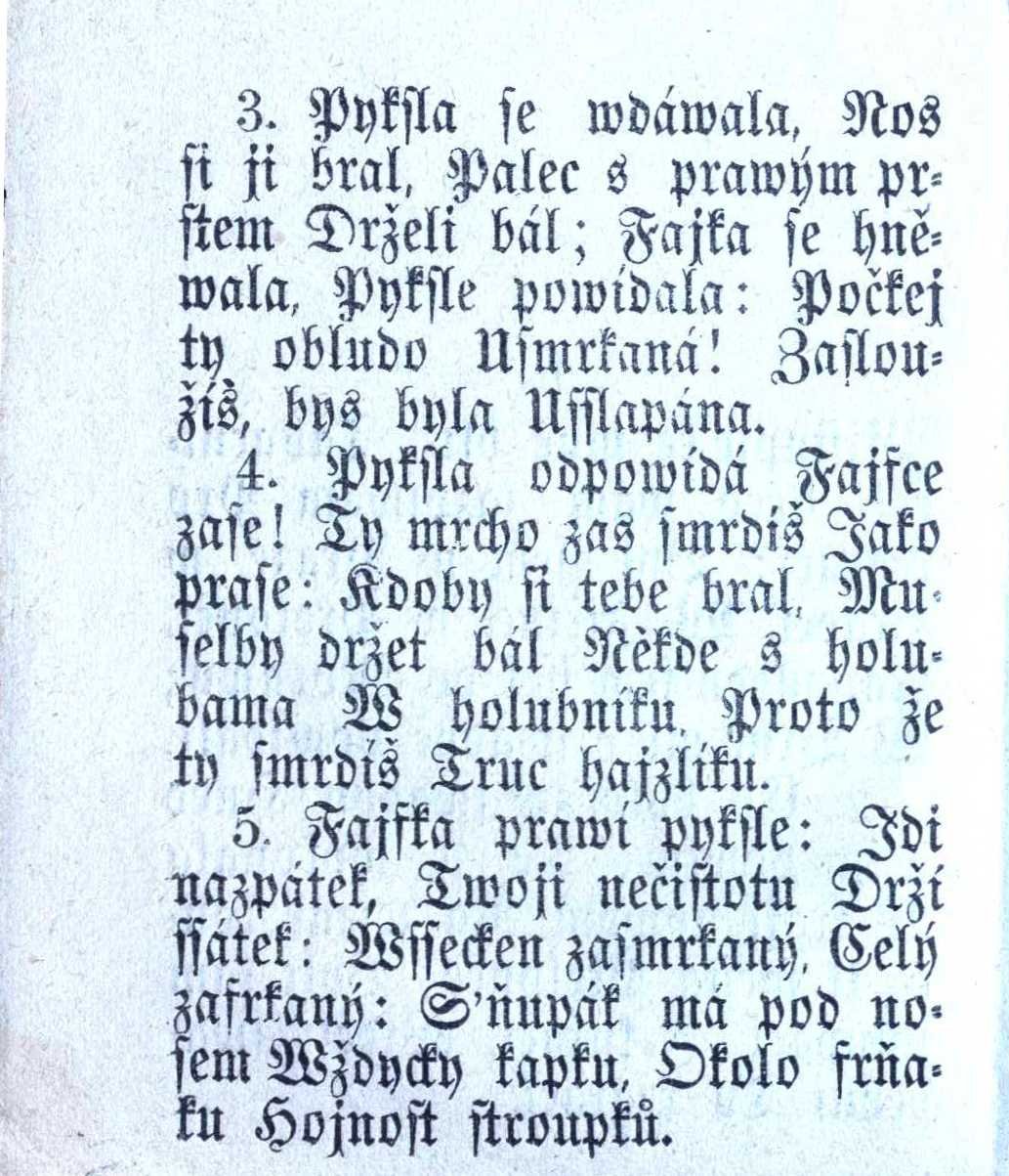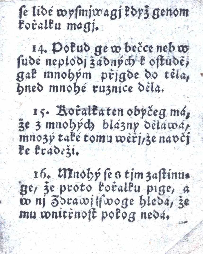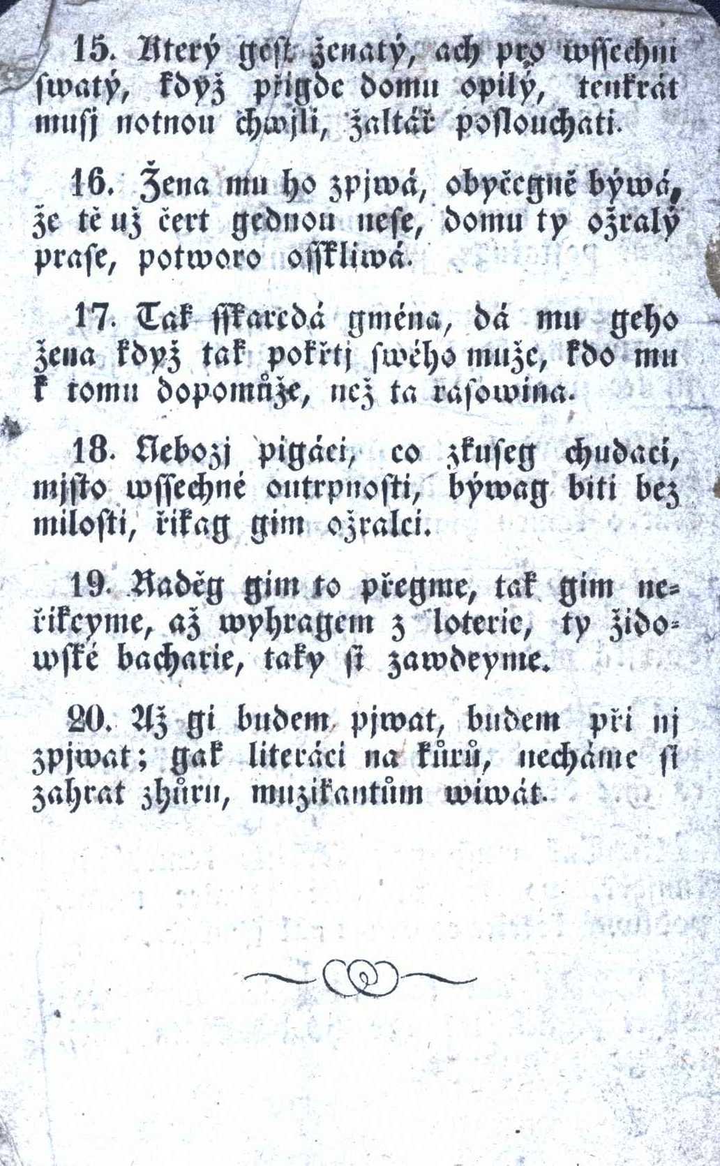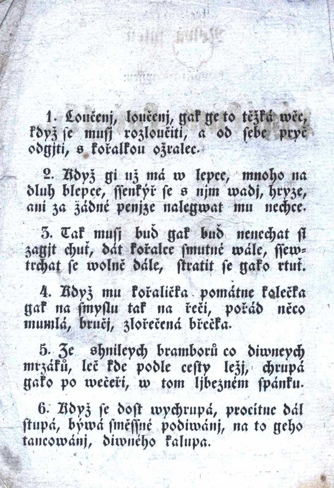 Evidenční záznam kramářského tisku Depozitář podsbírky písemností a tisků  Mejstřík, Martin : Štít Marie Panny aneb Katolické modlitby, 1791, pag. I. Sign. RKP I 108 Jöcher, Christian Gottlieb : Compendiöses Gelehrten-Lexicon... . - [Lipsko] : Johann Friedrich Gleditsch - syn [i.e. Johann Gottlieb Gleditsch], 1726. - Titulní strana. - Sign. S C 28 Jöcher, Christian Gottlieb : Compendiöses Gelehrten-Lexicon... . - [Lipsko] : Johann Friedrich Gleditsch - syn [i.e. Johann Gottlieb Gleditsch], 1726. - Nesign. mědirytinový frontispis. - Sign. S C 2 Depozitář podsbírky písemností a tisků Kristián z Koldína, Pavel : Práva a zřízení zemská Království českého v krátkou summu uvedená. - Praha : Jiří Nigrín, 1583. Titulní list (l. [1]a). Srov. Knihopis, č. 4.574. Sign. S II c 3. Jöcher : Gelehrten-Lexicon ... 1. - Lipsko : Gleditsch - dědicové, 1750. - Mědirytinový frontispis Johanna Christiana Gottfrieda Fritzsche podle předlohy Eliase Gottlieba Hausmanna. - Sign. S C 29 Skrbenský z Hříště, Kryštof Bernard : Lamentací na práva..., 1679, fol. [2]r (resp. pag. III). Sign. RKP I 4 Erronei ac Heretici Dogmatis ... Articuli. - Praha : Mikuláš Konáč z Hodištkova, [1520-1528]. Titulní list (l. [1]a (sign A1a)). Srov. BCBT 16. stol., Ar, č. 2-6. Sign. S XII f 6. Píseň nová o užitku nepokojné kořalky vnově na světlo vydaná. - [S.l.] : [s.t.n.], [1850], l. [1]a. Sign. T 31-36 Píseň nová o užitku nepokojné kořalky vnově na světlo vydaná. - [S.l.] : [s.t.n.], [1850], l. [1]b. Sign. T 31-36 Píseň nová o užitku nepokojné kořalky vnově na světlo vydaná. - [S.l.] : [s.t.n.], [1850], l. [3]a. Sign. T 31-36 Nová píseň všem kuřákům a šňupákům obětovaná. - Uherská Skalice : Josef Škarnicl - dědicové, [s.a.], l. [1]a. Sign. T 302 Dopis Athanasia a Sancto Josepho [Eliáše Sandricha] Janu Markvartovi Kocovi z Dobrše obsahující genealogické údaje k rodu Koců, 1768, 10. června. Adresa (in rubro). Sign. RKP II 80 Nová píseň všem kuřákům a šňupákům obětovaná. - Uherská Skalice : Josef Škarnicl - dědicové, [s.a.], l. [3]a. Sign. T 302 Píseň nová o užitku nepokojné kořalky vnově na světlo vydaná. - [S.l.] : [s.t.n.], [1850], l. [2]b. Sign. T 31-36 Píseň nová o užitku nepokojné kořalky vnově na světlo vydaná. - [S.l.] : [s.t.n.], [1850], l. [3]b. Sign. T 31-36 Zahradníček, František: Nová píseň k výstraze všem pijákům kořalky. - Praha : Jan Spurný, 1859, l. [1]a. Sign. T 33-34 Zahradníček, František: Nová píseň k výstraze všem pijákům kořalky. - Praha : Jan Spurný, 1859, l. [1]b. Sign. T 33-34 Zahradníček, František: Nová píseň k výstraze všem pijákům kořalky. - Praha : Jan Spurný, 1859, l. [2]a. Sign. T 33-34 Zahradníček, František: Nová píseň k výstraze všem pijákům kořalky. - Praha : Jan Spurný, 1859, l. [2]b. Sign. T 33-34 Píseň nová o užitku nepokojné kořalky vnově na světlo vydaná. - [S.l.] : [s.t.n.], [1850], l. [2]a. Sign. T 31-36 Píseň nová o užitku nepokojné kořalky vnově na světlo vydaná. - [S.l.] : [s.t.n.], [1850], l. [4]a (l. [4]b vacat). Sign. T 31-36 Nová píseň všem kuřákům a šňupákům obětovaná. - Uherská Skalice : Josef Škarnicl - dědicové, [s.a.], l. [1]b. Sign. T 302 Nová píseň všem kuřákům a šňupákům obětovaná. - Uherská Skalice : Josef Škarnicl - dědicové, [s.a.], l. [2]a. Sign. T 302 Nová píseň všem kuřákům a šňupákům obětovaná. - Uherská Skalice : Josef Škarnicl - dědicové, [s.a.], l. [2]b. Sign. T 302 Nová píseň všem kuřákům a šňupákům obětovaná. - Uherská Skalice : Josef Škarnicl - dědicové, [s.a.], l. [3]b. Sign. T 302 Nová píseň všem kuřákům a šňupákům obětovaná. - Uherská Skalice : Josef Škarnicl - dědicové, [s.a.], l. [4]a. Sign. T 302 Nová píseň všem kuřákům a šňupákům obětovaná. - Uherská Skalice : Josef Škarnicl - dědicové, [s.a.], l. [4]b. Sign. T 302 Spravedlivé od římsko-katolického Pražana učiněné Mistra Kašpara Royko stíhání, 1785, fol. [1]v-[2]r. - Rýmovaný pamflet proti osvícenskému církevnímu historiku Kašparu Roykovi. Sign. RKP I 364 Spravedlivé od římsko-katolického Pražana učiněné Mistra Kašpara Royko stíhání, 1785, fol. [1]r-[4]v. - Rýmovaný pamflet proti osvícenskému církevnímu historiku Kašparu Roykovi. Sign. RKP I 364 Spravedlivé od římsko-katolického Pražana učiněné Mistra Kašpara Royko stíhání, 1785, fol. [3]v-[4]r. - Rýmovaný pamflet proti osvícenskému církevnímu historiku Kašparu Roykovi. Sign. RKP I 364 Dopis Athanasia a Sancto Josepho [Eliáše Sandricha] Janu Markvartovi Kocovi z Dobrše obsahující genealogické údaje k rodu Koců, 1768, 10. června. Sign. RKP II 80 Dopis Athanasia a Sancto Josepho [Eliáše Sandricha] Janu Markvartovi Kocovi z Dobrše obsahující genealogické údaje k rodu Koců, 1768, 10. června. Sign. RKP II 80 Spravedlivé od římsko-katolického Pražana učiněné Mistra Kašpara Royko stíhání, 1785, fol. [2]v-[3]r. - Rýmovaný pamflet proti osvícenskému církevnímu historiku Kašparu Roykovi. Sign. RKP I 364 Jöcher, Christian Gottlieb : Allgemeines Gelehrten-Lexicon ... 1., A-C. - Lipsko : Johann Friedrich Gleditsch - dědicové, 1750. - Titulní strana. - Sign. S C 29/1 Katalog profesorské knihovny učitelského ústavu ve Sv. Janu pod Skalou. - Přiložený protektorátní seznam zakázaných knih, jež mají být z knihovny vyřazeny, 1940, l. [1]a. - Sign. RKP IV 13 Katalog profesorské knihovny učitelského ústavu ve Sv. Janu pod Skalou. - Přiložený protektorátní seznam zakázaných knih, jež mají být z knihovny vyřazeny, 1940, l. [1]b. - Sign. RKP IV 13 Katalog profesorské knihovny učitelského ústavu ve Sv. Janu pod Skalou. - Přiložený protektorátní seznam zakázaných knih, jež mají být z knihovny vyřazeny, 1940, l. [2]a. - Sign. 