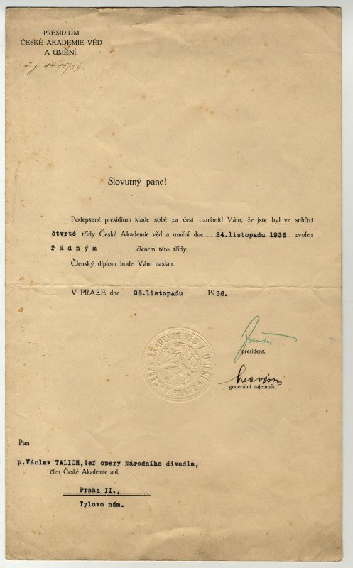 PředmětyKorespondence Václava Talicha soukromá i pracovní (přijatá i odeslaná); rukopisné poznámky; hudebniny; notové sešity s osobními poznámkami; osobní dokumenty (vysvědčení, lékařské zprávy, jmenovací dekrety, čestná členství, platové výměry a pracovní smlouvy); vyznamenání a řády; divadelní a koncertní programy; plakáty a cedule; fotografie (osobní i oficiální); osobní předměty (frak, taktovka, brýle, stuhy).