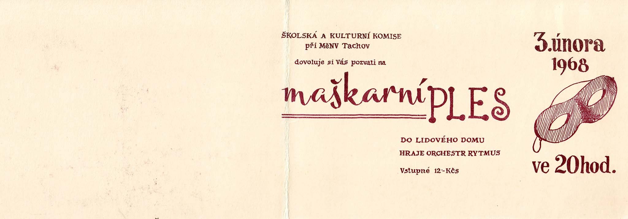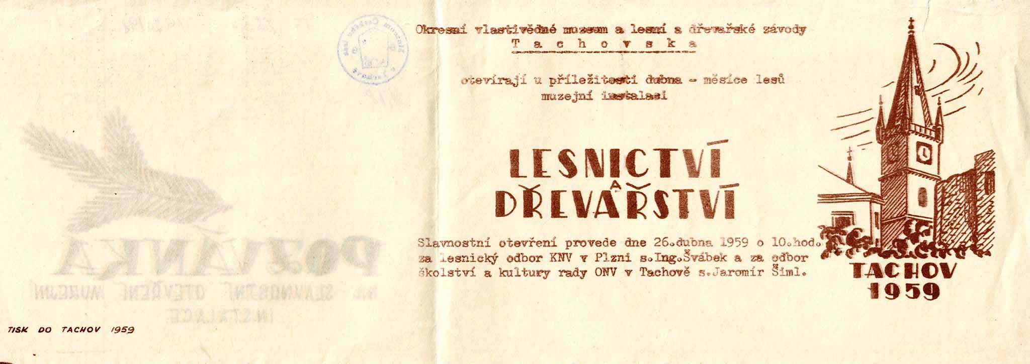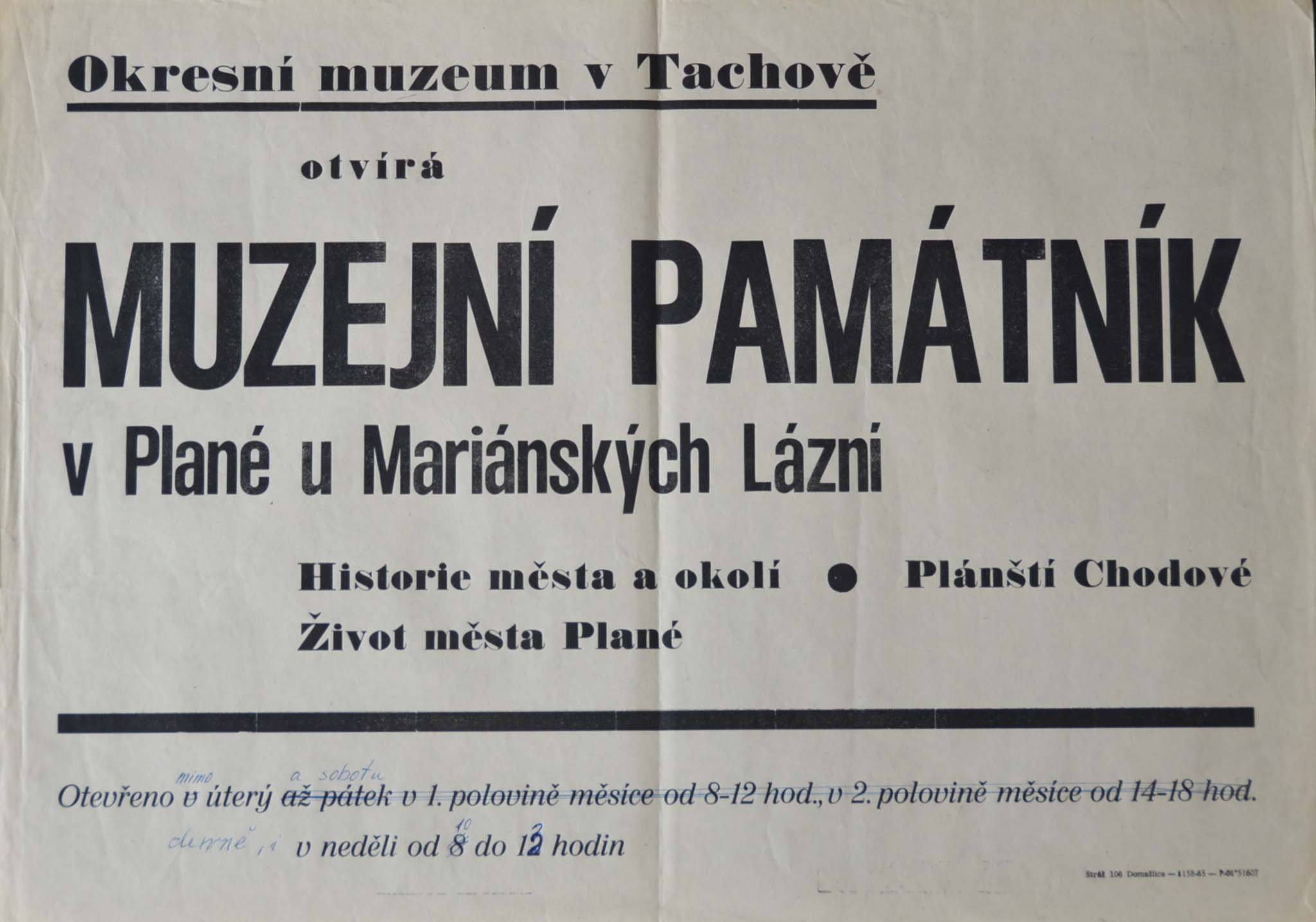 ukázka uložení nevystavených předmětů ukázka uložení nevystavených předmětů ukázka uložení nevystavených předmětů Plakát chebského zábavního podniku, který zval na pouťové atrakce v Tachově r. 1968. Plakát z roku 1965 k červnu - Měsíci myslivosti. Pozvánka z roku 1977 na vernisáž výtvarné výstavy v tachovském muzeu. Pozvánka na prezentaci šesti programů nových, osvědčených forem v kulturně výchovné činnosti, Tachov, rok 1979. Plakát, který v roce 1957 zval tachovské obyvatelstvo na besedu o Sibiři. Pozvánka tachovských kulturních středisek na zahájení výstavy výtvarné amatérské tvorby, r. 1978. Plakát s programem tachovského letního kina na červen 1970. Papírový ubrousek propagující známé výletní místo západních Čech - lesní restaurant Pozvánka školské a kulturní komise při Měst. národním výboru v Tachově na maškarní ples v roce 1968. Ukázka z volebních materiálů strany Občanské fórum - volby v roce 1990. Kartonový pivní tácek z roku 1967 s pozvánkou k návštěvě rekreačních středisek na Tachovsku. Propagační kartonový pivní tácek družstva Jednota z roku 1967 - tachovský hotel Český les. Pozvánka tachovského Okresního osvětového domu a Lidové školy umění na koncert, který se v roce 1968 uskutečnil v tachovském muzeu. Plakát - Armádní umělecký soubor Víta Nejedlého vystoupil v Tachově v roce 1958 s lidovými a vojenskými písněmi a tanci. Plakát - Okresní muzeum v Tachově otevřelo v Plané památník zaměřený na historii města a okolí. Program prvního Pozvánka z roku 1967 na orchranářskou olympiádu mládeže. Pozvánka na VII. ročník cyklistického závodu Tachovský trojúhelník, rok 1977. Perokresba podle dobové fotografie - celkový pohled na město Tachov. Propustka do hraničního pásma, vydáno Okresní správou SNB v roce 1990. Pozvánka z roku do obce Maršovy Chody na staročeskou svatbu. Pozvánka na oblastní soutěž amatérských filmů v Tachově v roce 1978. Poukázka na odběr kávovinové směsi v roce 1918. Perokresba podle dobové fotografie - pohled na tachovskou městskou bránu. Příručka z roku 1908 k určování mincí s ukázkami platidel různých zemí světa. Perokresba české menšinové školy v Tachově z roku 1928. Plakát - tachovské muzeum spolu s Galerií výtvarného umění v Chebu uspořádalo v Tachově v roce 1963 výstavu českého malířství 19. století. Vkladní knížka Spořitelny Tachov z období 1. sv. války, nevyplněná, s úpisem půjčky na válečné účely. Plakát - představení souboru Divadla E. F. Buriana v Praze, odehrálo se v tachovském kině v roce 1968. Kartonový pivní tácek vyrobení u příležitosti husitských slavností v Tachově v roce 1967. Plakát z roku 1986 - pozvánka na koncert, v němž účinkovala hudební tělesa z Německé demokratické republiky. Pozvánka na Poslední leč do obce Malý Rapotín v roce 1968. Pozvánka České křesťanské akademie v Tachově z roku 1998 na přednášku s tématem II. Vatikánského koncilu a církevního sněmu. Pozvánka na otevření instalace Volební humor - propagační materiál (Občanské fórum) voleb v roce 1990. Plakát k výstavě v tachovském muzeu v roce 1989 - historické hodiny ze sbírek západočeských muzeí. Plakát z roku 1963 k výstavě kreseb a grafiky členů a spolupracovníků AVS na téma