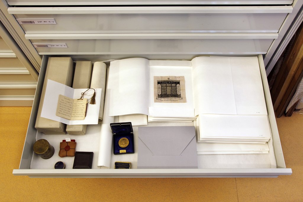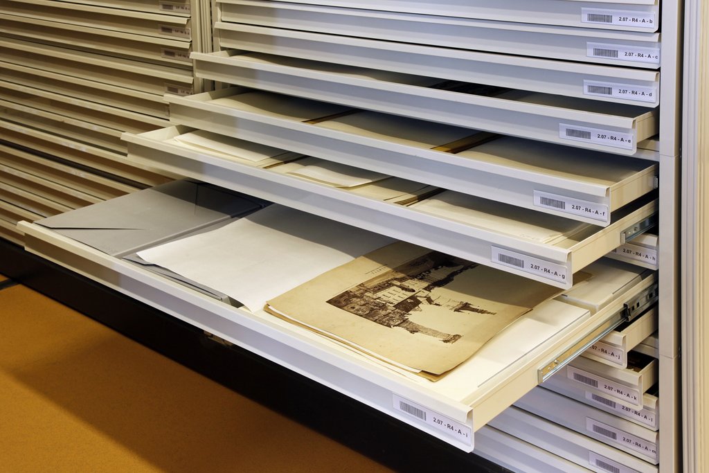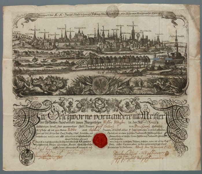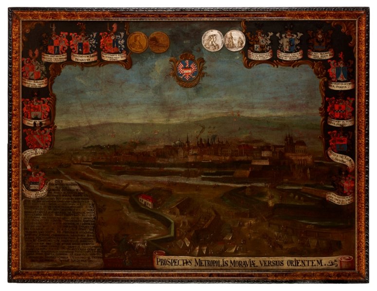 Portrét Marie Terezie, 1748, olej na plátně H. Haubenreisser, Pohled na věž olomoucké radnice, 1860, fotografie Střelecký terč s vyobrazením tramvaje a Horního náměstí v Olomouci, 1900, olej na dřevě Typář města Olomouce, počátek 16. století, stříbro O. Zahner a J. I. Rokický, Model sloupu Nejsvětější Trojice v Olomouci, před 1745, dřevo, papírmaš, polychromie, zlacení F. Hoplíček, Portrtét olomouckého starosty R. Fischera, 30. léta 20. století, olej na plátně J. Krügelmacher, Pamětní list ostrostřelců s vedutou Olomouce, polovina 19. století, akvarel na papíru F. Richter, Katedrála sv. Václava v Olomouci, 19. století, akvarel na papíru A. Haun, Pohled na Olomouc od jihozápadu, polovina 19. století, litografie Olomoucké divadlo, počátek 20. století, fotografie J. Winterhalder ml., Sv. Jan Evangelista, 1766, pero, lavírování na papíru J. Winterhalder ml., Krajina s řekou a domy, 1760–1765, pero, kolorování na papíru Sloup Nejsvětější Trojice v Olomouci, kolem 1900, pohlednice J. N. Friedrich, Portrét Františka Josefa I., 1854, olej na plátně M. A. Lublinský, Pohled na Olomouc od jihozápadu, 1674, olej na plátně Medaile na 50. jubileum vlády Františka Josefa I., 1898 J. Minnich, Model kostela Panny Marie na Předhradí, 1826, dřevo, lepenka, papírmaš, sklo, kov, hlína aj. Střelecký terč (tzv. solný) s vyobrazením Olomouce, 1720, olej na dřevě Divadelní cedule, 1900, tisk J. D. Klein st., Pohled na obléhanou Olomouc, 1758, olej na plátně Pečetní prsten se znakem města Olomouce, 17. století, zlato, červený kámen Pero v původní etui, 2. polovina 19. století J. Freindt, Tovaryšský list pro Josefa Rollentze, 1735, mědiryt Uložení části obrazů a střeleckých terčů. Uložení grafik a fotografií v zásuvných šuplících. Uložení sbírkových předmětů, tzv. památek z radniční věže. Pamětní zápis ze souboru tzv. památek z radniční věže, 1658, pergamen J. S. Klauber a J. B. Klauber, Slavnostní výzdoba průčelí kláštera Hradisko, 1751, mědiryt