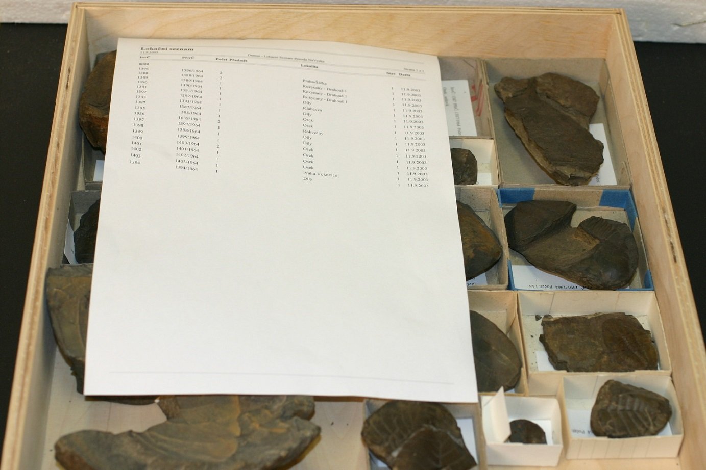 236/1964, 236, Ectillaenus katzeri (Barrande, 1856), lok. Osek, ordovik 527/1964, 527, Ormathops atava (Barrande, 1872), lok. Rokycany, ordovik 1486/1964, 2431, Babinka prima, lok. Osek, ordovik 874/1965, D578, Leptolepis spratiformis, lok. Kehlheim   Uložení paleontologických sbírek 63/1987, C284, Bactrites gracilis, lok. Wissenbach, devon P19/1995, 1277, Phycodes noha ichnosp. nov., lok. Rokycany-Stráň 18/1966, K1, Cyclopteris orbicularis, lok. Nýřany, karbon 18/1966, K12, Huttonia carinata, lok. Nýřany, karbon 942/1965, D646, Ammonites sp., původem starý materiál bez lokace D374 Perisphinctes almensis, lokalita není uvedena, druhohory-třetihory, starý sbírkový fond. 956/1964, 956, Colpocoryhpe bohemica (Vaněk, 1965), lok. Osek, ordovik 1118/1964, 1118, Sinuites reticulatus (Perner, 1903), lok. Rokycany 1545/1964, 2859, Ectillaenus katzeri (Barrande, 1856), lok. Sirá, ordovik 1587/1964, 3358, Paradoxides gracilis (Boeck, 1827), lok. Jince, kambrium 108/1970, 4859, Holograptus tardibrachiatus (Bouček, 1973), lok. Rokycany-Stráň, ordovik 230/1993, 59745, Iridistrophia eodevonica Havlíček, 1967, lok. Koněprusy-Zlatý kůň, devon 1142/1965, C140, Periechocrinus moniliformis, lok. Velká Británie-Dudley 1143/1965, C167, Michelinia favosa, lok. Belgie-Tournay, karbon   P23/1995, 1182, Teichichnus rectus Seilacher, 1955, lok. Rokycany-Drahouš, ordovik 18/1966, K38, Lepidodendron dichotomum, lok. Nýřany, karbon 21/1966, K68, Muropteris heterophylla, lok. Zbůch, karbon  Evidenční karta ke zkamenělině 236 Stálá expozice Otisky času byla otevřena v r. 2000 a představuje paleontologické nálezy z Rokycanska 364/1971, 5308, Pseudoreticulograptus inusitatus (J.Kraft, 1973), lok. Rokycany, Stráň 10, Valcha, ordovik 1140/1965, C51, Calymenella tristani, lok. Francie, ordovik 902/1964, 902, Colpocoryphe bohemica (Vaněk, 1965), lok. Rokycany, Osek, ordovik 445/1971, 5336, Dendrograptus klouceki Bouček, 1956, lok. Rokycany, Stráň 10, Valcha, ordovik Uložení paleontologických sbírek Uložení paleontologických sbírek Uložení paleontologických sbírek Uložení paleontologických sbírek