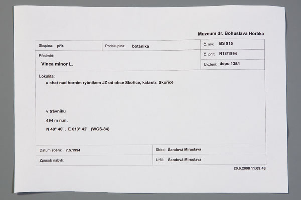 N8/2002  BS2594 Panicum miliaceum L., Rokycany, rumiště u Rakovského potoka .., 26. 8. 1950, leg. et det. K. Jágr. N25/1994 BS1035 Tithymalus dulcis (L.)Scop., Teršov, SV svah v PR Lípa, 23.5. 1994, leg. et det. Šandová N4/2002  BS2341 Leonurus cardiaca L., Rokycany, na rumišti za Rašínovem.., 7. 7. 1956, leg. et det. J. Pešek. N8/2002 BS 2537 Petasites albus Gärtn., levý břeh Padrťského potoka u hájovny Amerika.., 22. 4. 1951, leg. et det. K. Jágr. N36/1967 BL11 Cladonia alcicornis (Lght.)Schaer., kambr. břidly pod Felbabkou, 10. 9. 1924, leg et det. V. Los, rev. Bayerová 2005 (=C.foliacea) N36/1967  BL16 Cladonia squamosa (Scop.)Hoffm., Strašice, při cestě borem na Pískovém vrchu, VI.1912, leg. et det. B. Horák. N11/1999  BL91 Hypogymnia physodes (L.)Nyl, Brdy, Jahodová hora, 12. 8. 1999, leg. et det. : Šandová, rev. Halda 2005. N132/1967 BM139 Aulacomnium androgynum, Brdy, skála v lomu pod Hrachoviskem, sine dat, leg. et det. V. Los. N17/1998  BM189 Plagiothecium undulatum (Hedw.) B.S.B., Brdy, Hradčanské skály,15. 6. 1998, leg. et det. M. Šandová N55/1967  BM33 Fegatella conica Corda, Kornatice, na spodku olše podle potoka, sine dat, leg. et det. B. Horák N66/1967 BM58 Hypnum chrysophyllum, Böhmen, Kalkfelsen im Prokopithale bei Prag, 9. 8. 1896, leg. et det. Bauer. 211/93  BS794 Phegopteris dryopteris (=Gymnocarpium dryopteris (L.) Newman), Pavlovsko, PP Žďár, 17. 8. 1993, leg. et det. Šandová. N18/1994 BS915 Vinca minor L., Skořice, u chat nad  horním rybníkem JZ obce, 7. 5. 1994, leg. et det. Šandová. Evidenční karta k herbářové položce BS915 N4/2008 BL129 Evernia sp., Holoubkov, vrch Trhoň, 11. 1. 2008, leg. M. Šandová N14/99 BL98 Pseudoevernia furfuracea, Brdy, levý břeh Klabavy cca 100m od silničního mostku silnice Strašice- Buková, leg et det. M. Šandová 19.8. 1999, rev.: J.P. Halda, 21.11. 2005 N4/2011 BL160 Cetraria islandica, V lese pod Radyní, 26.4. 1968, Šimková. N4/2012 BL150 Umbilicaria deusta, na skále pod Radyní, 26.4. 1968, Šimková. N11/1999 BL94 Cladonia gracilis (? Cl. furcata) , Brdy, Jahodová hora – na vrcholu, leg et det M. Šandová, 12. 8. 1999, rev.: Cladonia furcata, J.P. Halda, 21.11. 2005. N110/1967 BL37 Evernia prunastri, Plzeňská pahorkatina, Lopata - na modřínech, leg  B. Horák, VII. 1902. N113/1967 BL50  Parmelia acetabulum, staré kleny V chalupách nad Dolním rybníkem Padrťským, 640 m n.m., 25. srpna  1926, leg et det V. Los. Př. č. 397/92  inv.č.  BM11 Aulacomnium palustre, Rokycany, Rokycanská stráň, část Drahouš, J orient.svah příkopu na J úpatí stráně v místě stavby D5 – 0508, 355 m n.m.,leg M. Šandová 25.4. 1991, Př. č. 412/92 inv. č. BM30 Fontinalis antipyretica, Holoubkov, dno potoka Chejlava, pokryv kamenů, v místě přeložky potoka pro stavbu dálnice D5 – O507, leg. M. Šandová 7.8.1991, det  M. Vondráček. Př. č . 54/67 inv. č. BM32 Eurhynchium striatum, Brdy, Padrťský potok (břehy) za Strašicemi, leg et  det  B. Horák, VI. 1904. Př. č. 63/67 inv. č.  BM47 Hylocomium splendens, Lesní žleb v polích nad Litohlavy, leg et det B. Horák, VIII. 1901. Př.č. 42/67 inv.č. BM152 Climacium dendroides, Podbrdsko, Cháchov, leg et det B. Horák, sine dat. 030 resize Uložení krabic s položkami mechorostů v regálech 034 resize Uložení cévnatých rostlin v zásuvkách ve skříních podle rodů 031 Uložení lišejníků v obálkách a v herbářových krabicích