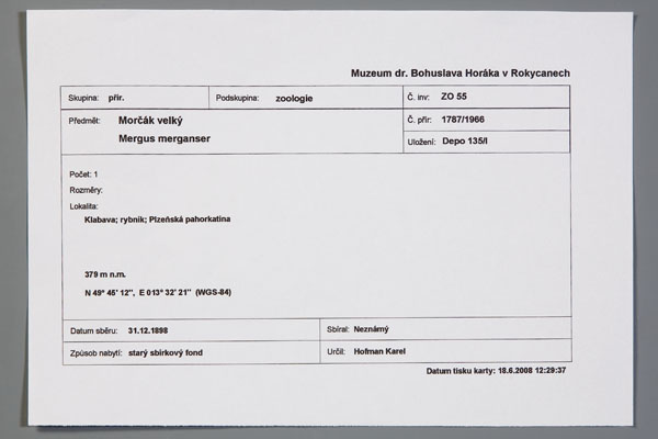 Uložení ornitologických sbírek v prachotěsných skříních v depozitáři ZM 13  N11/2002  Sciurus vulgaris,  lok. Rokycany, Husovy sady, dat. sběru 28. 7. 2001, dar-úhyn, lgt. Mayerová, det. Mayerová. ZO 154  N1/2001  Gavia arctica, samec, lok.: sine loc., dat. sběru 1. 1. 1934, starý sbírkový fond, lgt. neznámý, det. K. Hofman. ZO 55  1787/1996  Mergus merganser,  lok. Klabava, rybník, dat. sběru 31. 12. 1898, starý sbírkový fond, lgt. neznámý, det. K.  Hofman. ZO 27  1759/1996  Pernis apivorus, lok. Brdy -Padrť, dat. sběru 1. 1. 1934, starý sbírkový fond, lgt. Bohutínský, det. K. Hofman. Evidenční karta k nejstaršímu dermoplastickému preparátu z roku 1898 Mergus merganser ZO 159  N10/2003  Carduelis chloris, lok.Holoubkov, hráz rybníka, dat. sběru 15. 9. 2002, nález- úhyn, lgt. et det. M. Šandová. ZO 160  N11/2002  Aegithalos caudatus, lok. Plzeňsko, dat. sběru: 1. 7. 2002, dar, lgt. E. Gust, det. J. Nobilisová. ZM 10  N12/2000  Martes martes, lok. Holoubkov, silnice E 50,dat. sběru 25. 7. 2000, nález - úhyn, lgt. et det. M. Šandová. ZO 58  1790/1996  Gavia arctica, samice, lok. Plzeň - Bolevec, dat. sběru 1. 1. 1934, starý sbírkový fond, lgt. neznámý, det. K. Hofman. ZM 18  N56/2005  Capreolus capreolus, lok. Holoubkov, tanková cesta, dat. sběru 3. 8. 2004, dar - úhyn, lgt.  et det. P. Špelina. ZOH 2 1049/1967  Lanius sp. ,  lok. sine loc, dat. sběru 1. 1. 1967, starý sbírkový fond, lgt. neznámý, det.  K. Hofman. Uložení části zoologické sbírky v prachotěsných skříních - část Oologie-vejce Uložení části zoologické sbírky- hnízda a hnízda s vejci v zásuvce ve skříni Uložení části zoologické sbírky - osteologický materiál Př. č. N24/2008 Inv. č. ZM24 Prase divoké,  preparace P. Zedník, deponováno v expozici Př. č.N22-N23, Inv. č. ZM22-ZM23 Srnec obecný (samec,samice) dermoplastický preparát, preparace P. Zedník, deponováno v expozici N17/2009 ZM34 Lebka jezevce lesního, Máslovice, okr. Praha-východ, leg et det P. Zedník, osteologický materiál, preparace P. Zedník N21/2011 ZM40 Mustela nivalis, Rokycany-Borek, u loděnice, 1.1. 2010, leg. et det. P. Špelina, preparace: P. Špelina. 1002/1967 ZM2 Mustela erminea, sine loc, 1.1. 1967, det. K. Hofman, preparace: neznámý. N19/2011 ZM38 Mustela vison, Svojkovice, Lamanický (Lamancký) rybník, 1. 1. 2010, leg. et det. P. Špelina, preparace: P. Špelina. N14/2013 ZM49 Matres foina, Vitinka (okr. Rokycany), 11. 5. 2013, leg. et det. P. Špelina, preparace: P. Špelina. N11/2013 ZM46 Sciurus vulgaris, Záběhlá, 2. 3. 2013, leg. et  det. M. Süssová, preparace: P. Špelina. N9/2013 ZM44 Talpa europea, Holoubkov, okraj lesa; 1. 4. 2012, leg. et det. M. Šandová, preparace: P. Špelina. 1005/1967 ZM5 Mus musculus, Kařez, 1. 1. 1937, det. K. Hofman, preparace: neznámý. N30/2013 ZM51 Sus  scrofta juv., Holoubkov, leg. et  det. P. Špelina, preparace: P. Špelina. N12/2011 ZO181 Garrulus glandarius, Rokycany-hřbitov, 1. 1. 2010, leg. et  det. P. Špelina, preparace: P. Špelina. 1037/1967 ZO138 Lanius excubitor, sine loc, 1. 1. 1967, det. K. Hofman, preparace: neznámý. N44/2013 ZO223 Pyrrhula pyrrhus, Rokycansko, leg. et  det. P. Moulis, preparace: P. Špelina. 1053/1967 ZOH6 Alauda arvensis hnízdo s vejci, sine loc, det. K. Hofman. 945/1967 ZOV46 Larus minutus, sine loc, 1. 1. 1934, det. K. Hofman. 985/1967 ZOV86 Larus canus, sine loc, 1. 1. 1934, det.  K. Hofman. N8/2001 Z5 Sepia officinalis, lihový preparát, sine loc, 1. 1. 2000, det. J. Nobilisová, repreparace E. Gust. N5/2001 Z2 Emys europea, lihový preparát,  sine loc, 1.1. 2000,det. M. Šandová, repreparace E. Gust. N4/2001 Z1 Sciurus vulgaris, lihový preparát, sine loc, det.  M. Šandová,  repreparace  E. Gust. ZM 14  N12/2002  Vulpes vulpes, lok. Pavlovsko - Žďár, dat. sběru 1. 1. 2001, dar, lgt. et det. V.Tomášek. ZO 167  N26/2007  Garrulus glandarius, lok. Holoubkov, v zahradě, dat. sběru 7. 10. 2004, nález-úhyn, lgt. K. Kocourek, det. M. Šandová.