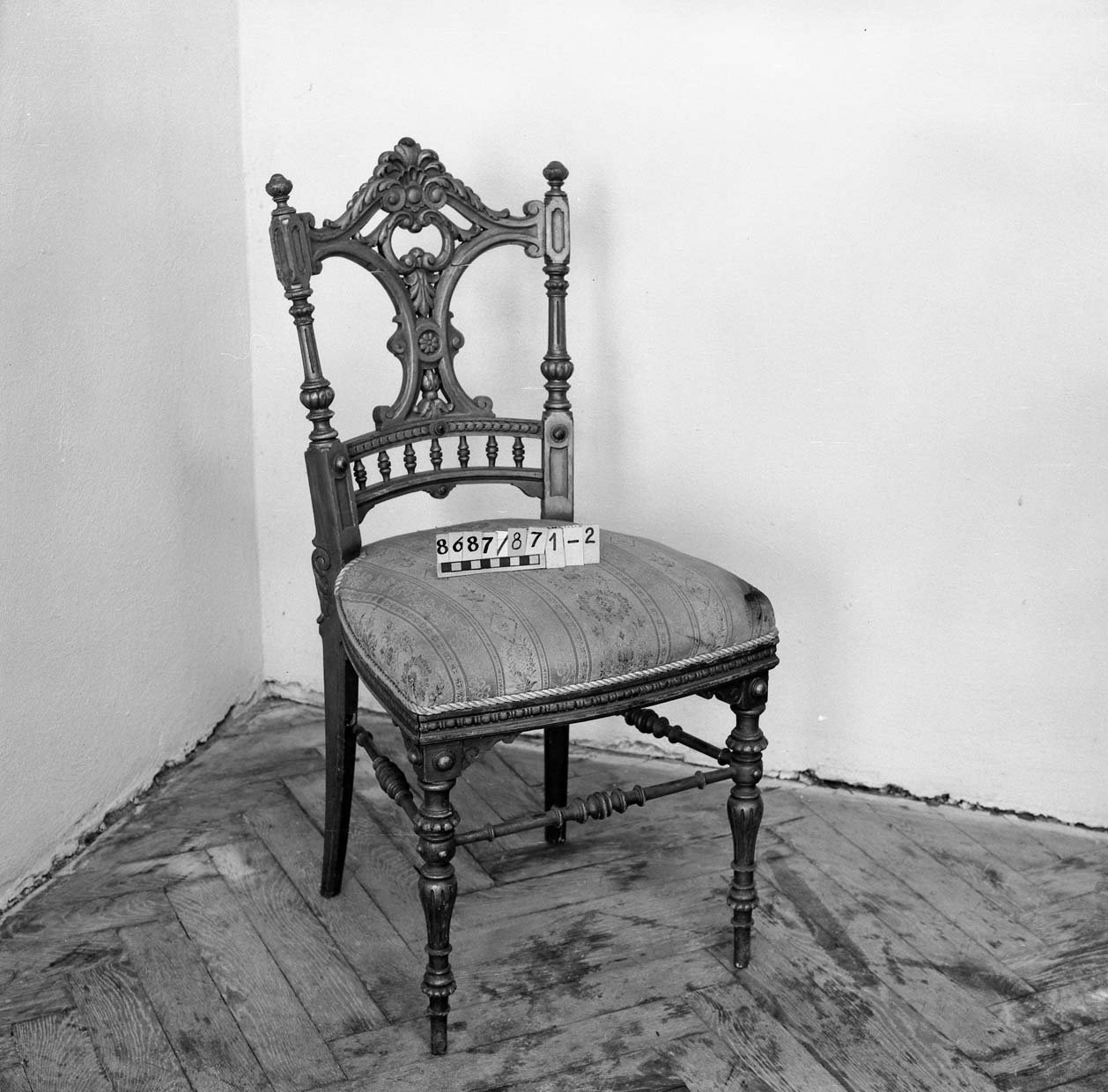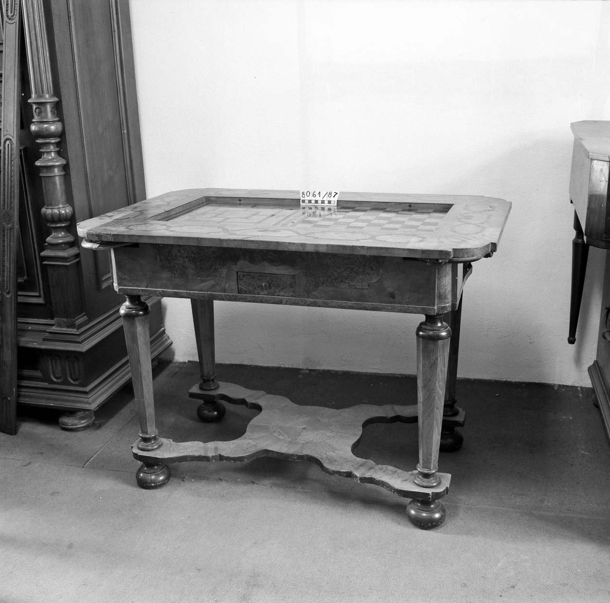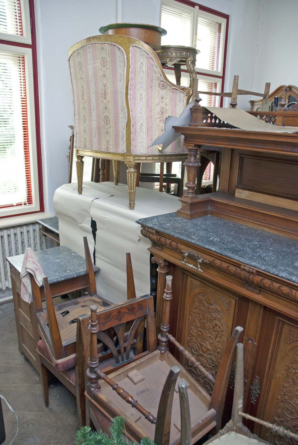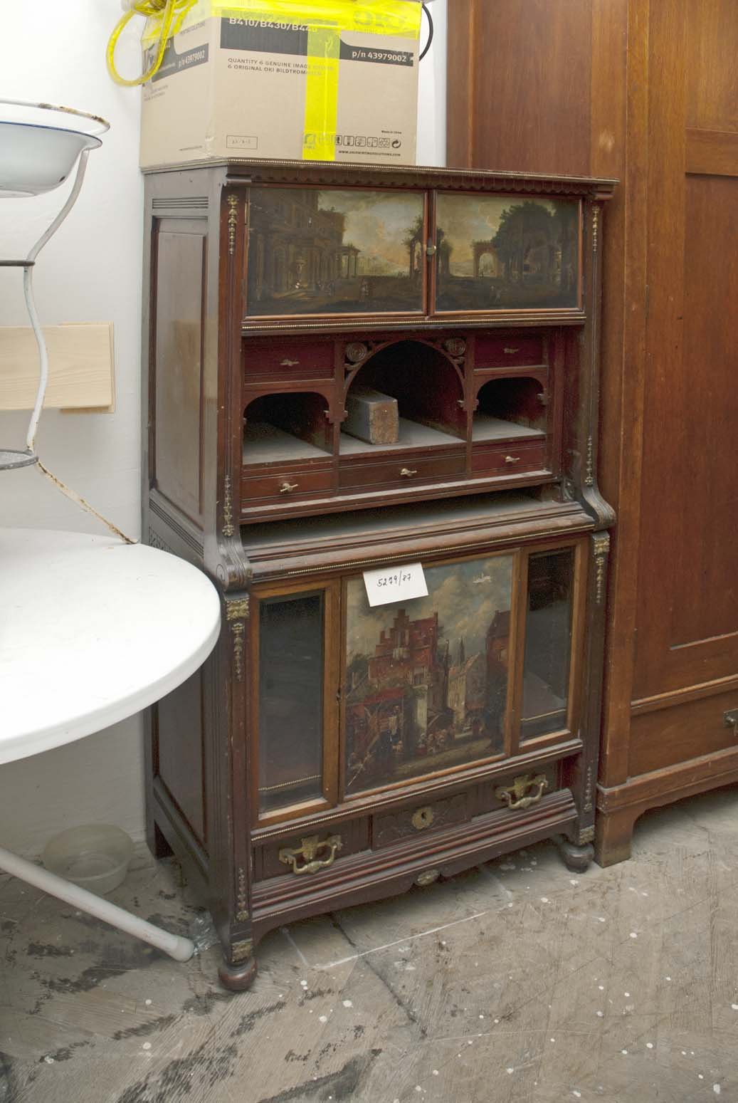 5170/1987 křeslo, vysoké opěradlo, plná postranní opěradla, dřevěné rámy zlacené, vyndavací polštář, polstrované části potažené gobelínovou látkou, na zadním opěradle žena se psem, 2. pol. 18. stol. 8062/87 Barokní kabinet, kořenovice, bohatá intarzie, mosazné kování, částečně poškozeno, v 1750mm, š 1200mm, hl. 900mm 5275/87 skříňka ze dřeva, tmavě mořeno, v horní části dvoudvéřová,  dole vyklápěcí dvířka, nahořei po  stranách vyřezávané sloupky, uprostřed  plastika ženy, v 1170 x h 450m š: 992mm poč. 20. stol. 8068/87 Stůl obdélníkovitého tvaru na 4 bohatě vyřezávaných nohách, ve spodní části širší trnož. Horní deska na bohatě profilovaném obložení.Rozměr: v: 770mm, deska: 1010x690mm 5953/87Dřevěné křeslo, empirového stylu, hnědé barvy, s tyčovou výztuží v zadním opěradle.Rozměr: výška s opěradlem: 935mm; výška sedáku: 485mm; šířka vzadu: 360mm; šířka vpředu: 535mm N 18 a Židle typu sella curulis,  Žebra, sedací plocha i opěradlo bohatě intarzováno slonovinou. Dekor rostlinný, typ napovídá orientální původ, chybí oválný obrázek v opěradle,  19. stol, v 92mm 5279/87 Sekretář mahagon. dřevo, dole zásuvka, na dvířkách malované romantické motivy po stranách obdélníková prosklená pole, psací deska  a horní dvířka chybí, po 1800,  v 1370mm; š 650mm. 52836/87 Komodový nástavec dvoudvéřový,  zakončený obloukem, dveře prosklené, 2 police, 3 zásuvky, prolamovaná římsa uprostřed se spirálovým ukončením, poškozený bok, r  v 1430mm š 1140mm, 18. stol. 5955/87Čtvrhranné,  mořené, dubové křeslo se soustruženýma předníma nohama, po obvodu vyřezávaný trnož, r výška s opěradlem: 855mm; výška sedáku vpředu:560mm, po 1700 5956/87 Sekretář, tři široké zásuvky, nad nimi sklopné víko sí výsuvnou psací desku, v průčelí 7 zásuvek, jedny dvířka. Nad sklopeným víkem dvě široké zásuvky, nahoře užší zásuvka, kol. 1840, v 1760mm 5954/87 Židle dřevěná, sedák a opěradlo potažené kůží s ozdobnými vtlačenými linkovými pásy, kůže upevněna mosaznými cvoky,  trnož do písmene H,výška s opěradlem: 970mm; výška sedáku: 470mm, 1910 5958/87 truhla dřevěná, bohatě intarzované víko do čtverců s motivem ptáka, tulipánu a růže. Přední intarsie stejná jako na víku. Dole zásuvka s rostlinnou intarsií, ozdobné kování. 18.stol. 5171/87, křeslo dřevěný rám původně zlacený a vyřezávaný, dvě polstrovaná opěradla, polstrované části potažené gobelínem, na zadním opěradle milenci s kytarou, květinový dekor, 2. pol. 19. stol. 5274/87 Dřevěná skříňka, 12 zásuvek, bohatě zdobena figurální řezbou, dolní profilovaná lišta v přední části chybí, 17. století ?rozměry: max. v: 660mm; š: 725mm; h: 380mm. 8069/87 Noční stolek,na čtyřech kulatých nohách, bohatě zdobený a soustružený, odkládací deska -šedý mramor, 490x420x770mm. konec 19. stol. 8201/87stoleček na 4 čtverhranných nohách, deska čtvercového tvaru s bohatě vyřezávaným rostlinným dekorem, zdobená deska spojující nohy ve spodní části, v720mm, horní deska 400x400mm 1. pol.20. stol. 8688/87  kulatý stolek štuk, bronz na třech bohatě zdobených prohnutých nohách. nohy spojeny ozdobnou podstolinou, Poškozeno. v: 750mm, průměr desky 510mm. 8687/87 1 Židle, nohy bohatě vyřezávané, opěradlo bohatě vyřezávané, rostlinný ornament. Spodní část opěradla tvoří balustráda se 7 kuželkami. Sedací deska čalouněná, v: 870mm, sed. deska: 420x410mm. 8070/87 Toaletní stolek. dřevo, dvě bohatě soustružené nohy ve spodní části spojené trnoží, mramorová deska, zásuvka chybí, konec 19. stol. v 158cm 5959/87 Barokní komoda, v přední části prolamovaná.  Vykládaná barevným dřevem, tři velké zásuvky, na zásuvkách zdobné kování do tvaru držadel.  Rozměry: v: 870mm; hloubka: 720mm; šířka: 1250mm. 8161/87 Skříň dvoudvéřová, na 4 kulatých soustružených nohách  konec 19. stol, r: 1986x1390x670mm. 8167/87Postel na čtyřech kulatých soustružených nohách, na zadním čele zahloubené  pole, nad ním profilovaná lišta, r 920x1115mm, postranice: 1885x240mm 5282/87 Dřevěná truhla, , po stranách kovová ucha,  v předu kování  zámku, na víku a přední stěně  intarzovaná  pole s hvězdicemi, intarzie světlým a tmavým dřevem, v 680mm š 1180mm h 640mm, 18.stol 5282/87 Dřevěná truhla, po stranách kovová ucha,  v předu kování  zámku, na víku a přední stěně intarzovaná pole s hvězdicemi, intarzie světlým a tmavým dřevem, 18.stol.v 645mm š 650mm d 115mm pošk. 8061/87 Hrací stolek na 4 šestihran. nohách s kulovitými soustruž patkami. Nohy spojeny trnoží, Deska intarzovaná, s oblými rohy. Střední část vysouvatelná, 1 malá zásuvka chybí, 18.st. v. 785 mm  8619/87Gondolové křeslo2. polovina 18. století, střední EvropaCeločalouněné s půlkruhovým lenochem sníženým v místě područek, r 880x760x450mm. Pohled do depozitáře nábytku Pohled na uložení předmětů v depozitáři nábytku Pohled do depozitáře nábytku