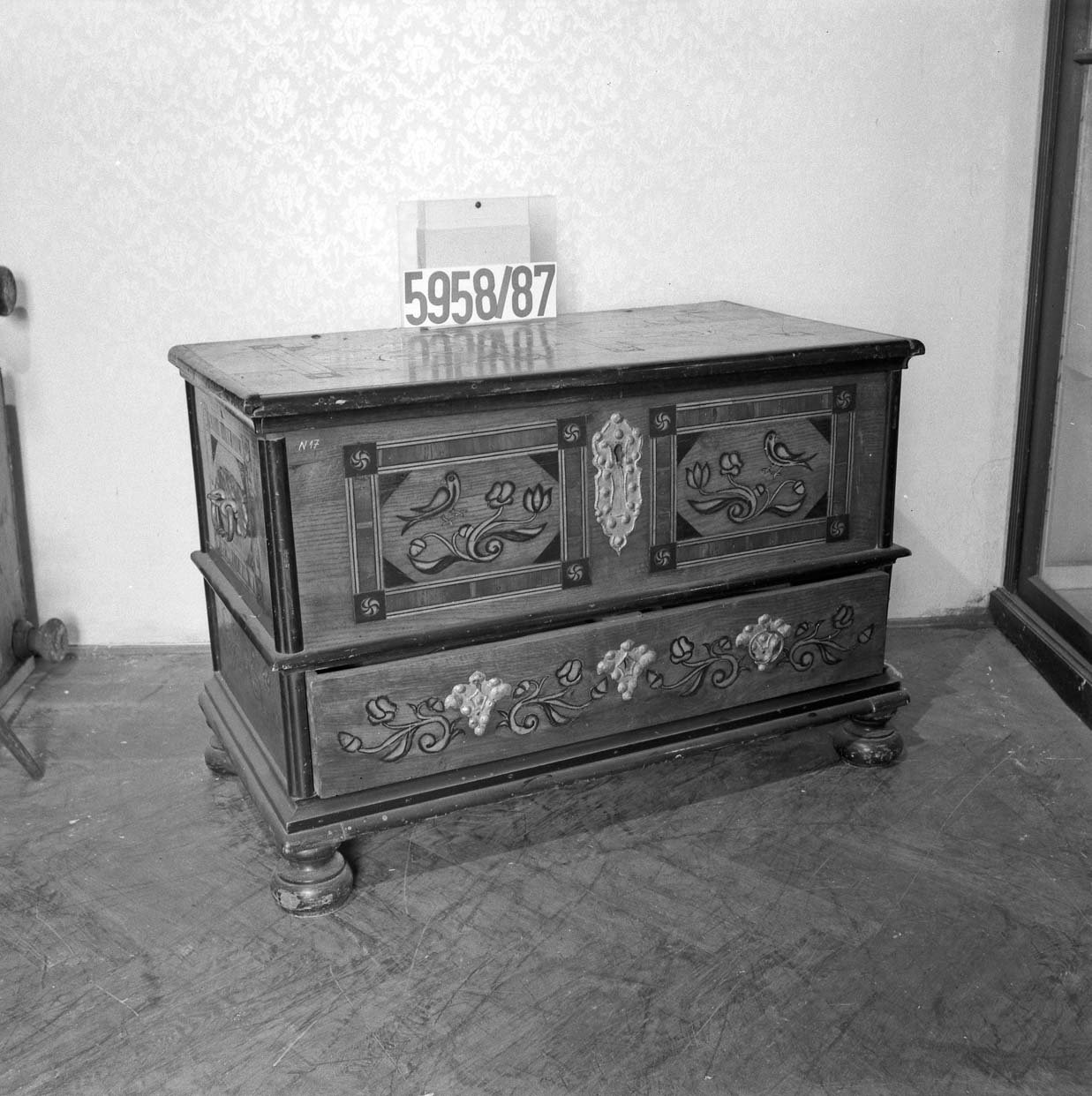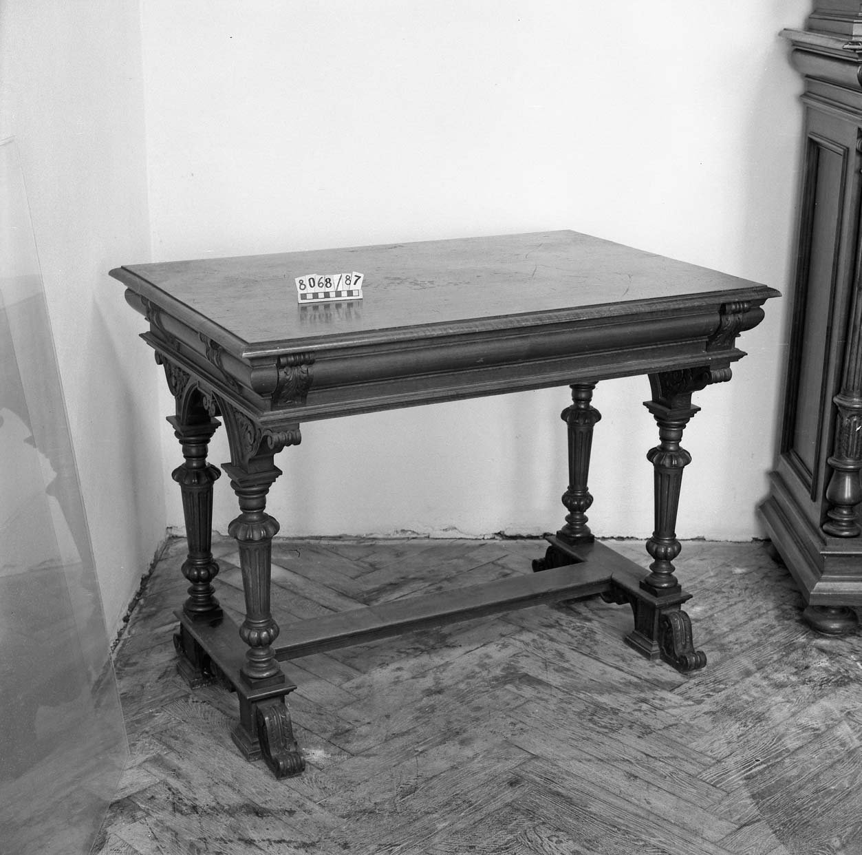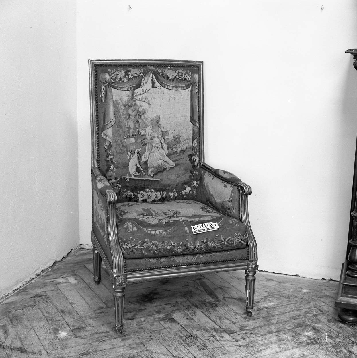 5170/1987 křeslo, vysoké opěradlo, plná postranní opěradla, dřevěné rámy zlacené, vyndavací polštář, polstrované části potažené gobelínovou látkou, na zadním opěradle žena se psem, 2. pol. 18. stol. 8062/87 Barokní kabinet, kořenovice, bohatá intarzie, mosazné kování, částečně poškozeno, v 1750mm, š 1200mm, hl. 900mm 5275/87 skříňka ze dřeva, tmavě mořeno, v horní části dvoudvéřová,  dole vyklápěcí dvířka, nahořei po  stranách vyřezávané sloupky, uprostřed  plastika ženy, v 1170 x h 450m š: 992mm poč. 20. stol. 8068/87 Stůl obdélníkovitého tvaru na 4 bohatě vyřezávaných nohách, ve spodní části širší trnož. Horní deska na bohatě profilovaném obložení.Rozměr: v: 770mm, deska: 1010x690mm 5953/87Dřevěné křeslo, empirového stylu, hnědé barvy, s tyčovou výztuží v zadním opěradle.Rozměr: výška s opěradlem: 935mm; výška sedáku: 485mm; šířka vzadu: 360mm; šířka vpředu: 535mm N 18 a Židle typu sella curulis,  Žebra, sedací plocha i opěradlo bohatě intarzováno slonovinou. Dekor rostlinný, typ napovídá orientální původ, chybí oválný obrázek v opěradle,  19. stol, v 92mm 5279/87 Sekretář mahagon. dřevo, dole zásuvka, na dvířkách malované romantické motivy po stranách obdélníková prosklená pole, psací deska  a horní dvířka chybí, po 1800,  v 1370mm; š 650mm. 52836/87 Komodový nástavec dvoudvéřový,  zakončený obloukem, dveře prosklené, 2 police, 3 zásuvky, prolamovaná římsa uprostřed se spirálovým ukončením, poškozený bok, r  v 1430mm š 1140mm, 18. stol. 5955/87Čtvrhranné,  mořené, dubové křeslo se soustruženýma předníma nohama, po obvodu vyřezávaný trnož, r výška s opěradlem: 855mm; výška sedáku vpředu:560mm, po 1700 5956/87 Sekretář, tři široké zásuvky, nad nimi sklopné víko sí výsuvnou psací desku, v průčelí 7 zásuvek, jedny dvířka. Nad sklopeným víkem dvě široké zásuvky, nahoře užší zásuvka, kol. 1840, v 1760mm 5954/87 Židle dřevěná, sedák a opěradlo potažené kůží s ozdobnými vtlačenými linkovými pásy, kůže upevněna mosaznými cvoky,  trnož do písmene H,výška s opěradlem: 970mm; výška sedáku: 470mm, 1910 5958/87 truhla dřevěná, bohatě intarzované víko do čtverců s motivem ptáka, tulipánu a růže. Přední intarsie stejná jako na víku. Dole zásuvka s rostlinnou intarsií, ozdobné kování. 18.stol. 5171/87, křeslo dřevěný rám původně zlacený a vyřezávaný, dvě polstrovaná opěradla, polstrované části potažené gobelínem, na zadním opěradle milenci s kytarou, květinový dekor, 2. pol. 19. stol. 5274/87 Dřevěná skříňka, 12 zásuvek, bohatě zdobena figurální řezbou, dolní profilovaná lišta v přední části chybí, 17. století ?rozměry: max. v: 660mm; š: 725mm; h: 380mm. 8069/87 Noční stolek,na čtyřech kulatých nohách, bohatě zdobený a soustružený, odkládací deska -šedý mramor, 490x420x770mm. konec 19. stol. 8201/87stoleček na 4 čtverhranných nohách, deska čtvercového tvaru s bohatě vyřezávaným rostlinným dekorem, zdobená deska spojující nohy ve spodní části, v720mm, horní deska 400x400mm 1. pol.20. stol. 8688/87  kulatý stolek štuk, bronz na třech bohatě zdobených prohnutých nohách. nohy spojeny ozdobnou podstolinou, Poškozeno. v: 750mm, průměr desky 510mm. 8687/87 1 Židle, nohy bohatě vyřezávané, opěradlo bohatě vyřezávané, rostlinný ornament. Spodní část opěradla tvoří balustráda se 7 kuželkami. Sedací deska čalouněná, v: 870mm, sed. deska: 420x410mm. 8070/87 Toaletní stolek. dřevo, dvě bohatě soustružené nohy ve spodní části spojené trnoží, mramorová deska, zásuvka chybí, konec 19. stol. v 158cm 5959/87 Barokní komoda, v přední části prolamovaná.  Vykládaná barevným dřevem, tři velké zásuvky, na zásuvkách zdobné kování do tvaru držadel.  Rozměry: v: 870mm; hloubka: 720mm; šířka: 1250mm. 8161/87 Skříň dvoudvéřová, na 4 kulatých soustružených nohách  konec 19. stol, r: 1986x1390x670mm. 8167/87Postel na čtyřech kulatých soustružených nohách, na zadním čele zahloubené  pole, nad ním profilovaná lišta, r 920x1115mm, postranice: 1885x240mm 5282/87 Dřevěná truhla, , po stranách kovová ucha,  v předu kování  zámku, na víku a přední stěně  intarzovaná  pole s hvězdicemi, intarzie světlým a tmavým dřevem, v 680mm š 1180mm h 640mm, 18.stol 5282/87 Dřevěná truhla, po stranách kovová ucha,  v předu kování  zámku, na víku a přední stěně intarzovaná pole s hvězdicemi, intarzie světlým a tmavým dřevem, 18.stol.v 645mm š 650mm d 115mm pošk. 8061/87 Hrací stolek na 4 šestihran. nohách s kulovitými soustruž patkami. Nohy spojeny trnoží, Deska intarzovaná, s oblými rohy. Střední část vysouvatelná, 1 malá zásuvka chybí, 18.st. v. 785 mm  8619/87Gondolové křeslo2. polovina 18. století, střední EvropaCeločalouněné s půlkruhovým lenochem sníženým v místě područek, r 880x760x450mm. Pohled do depozitáře nábytku Pohled na uložení předmětů v depozitáři nábytku Pohled do depozitáře nábytku