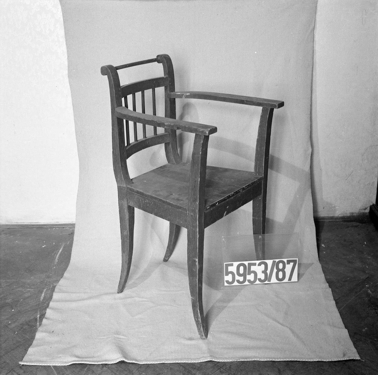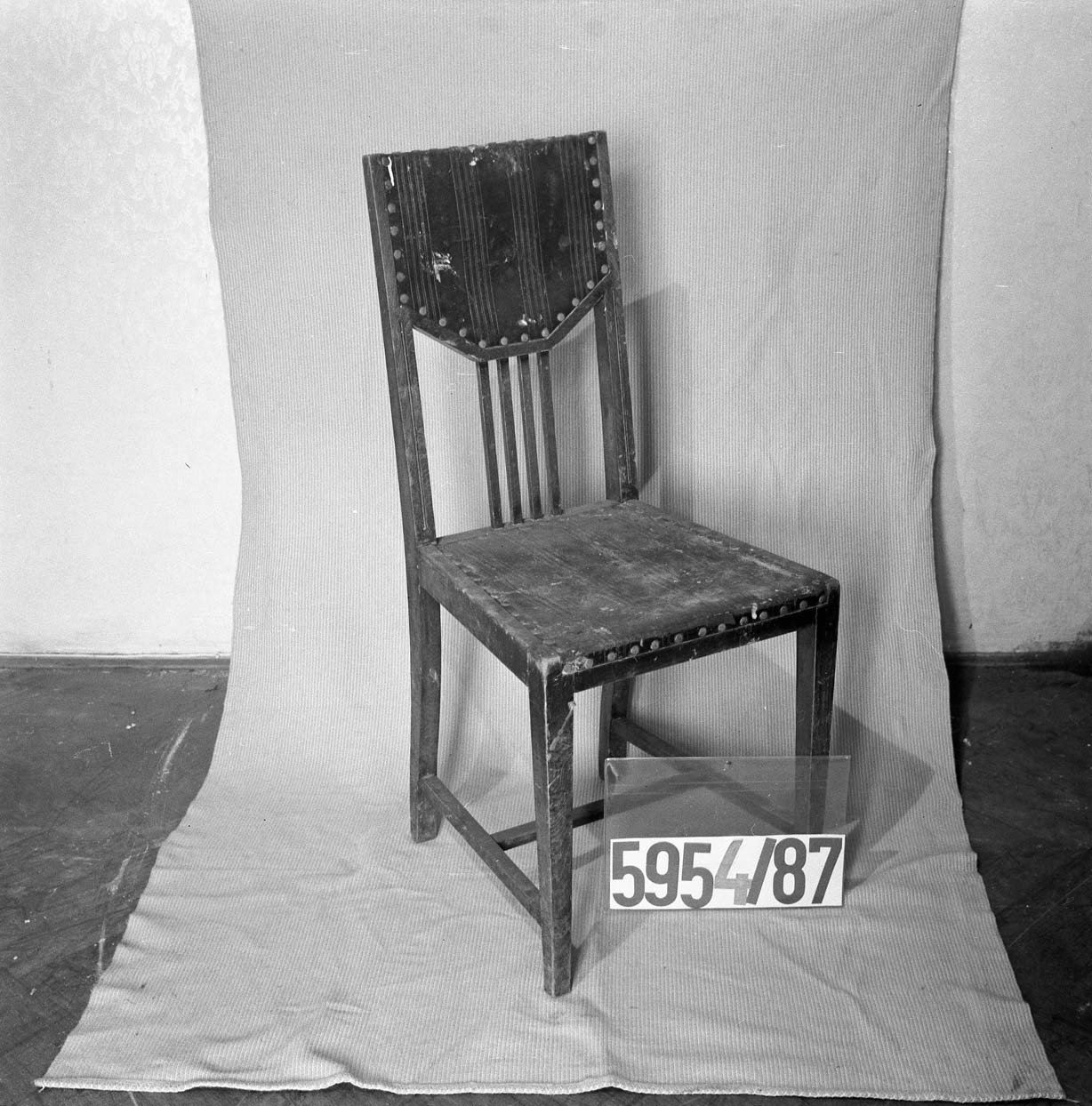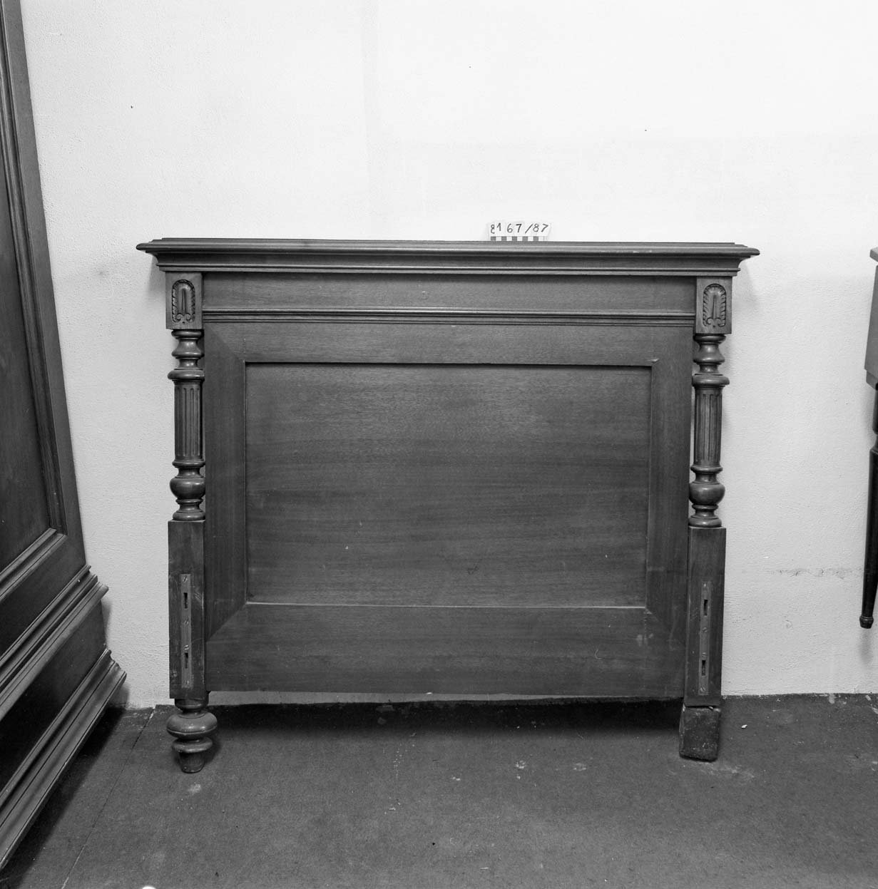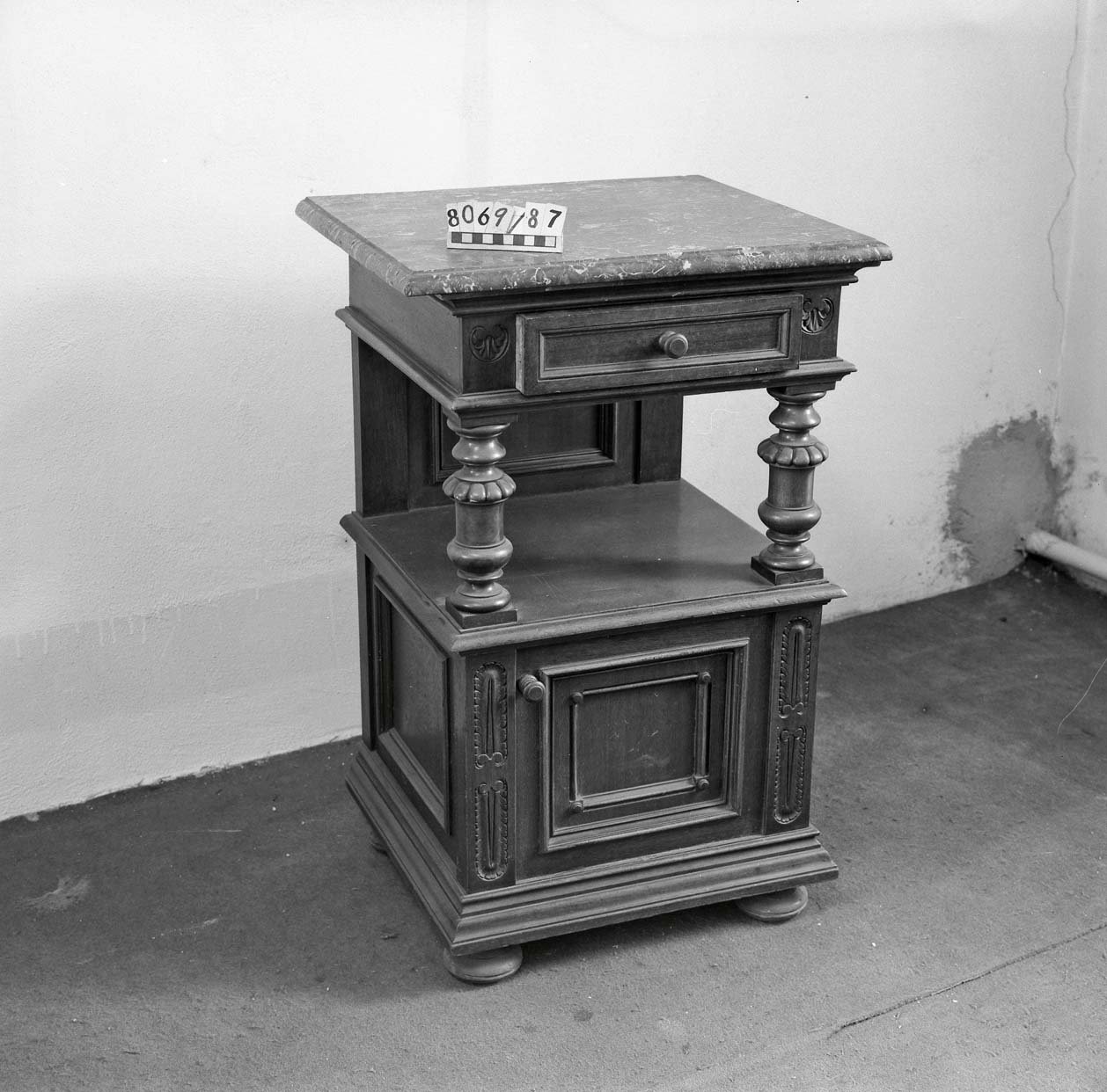 5170/1987 křeslo, vysoké opěradlo, plná postranní opěradla, dřevěné rámy zlacené, vyndavací polštář, polstrované části potažené gobelínovou látkou, na zadním opěradle žena se psem, 2. pol. 18. stol. 8062/87 Barokní kabinet, kořenovice, bohatá intarzie, mosazné kování, částečně poškozeno, v 1750mm, š 1200mm, hl. 900mm 5275/87 skříňka ze dřeva, tmavě mořeno, v horní části dvoudvéřová,  dole vyklápěcí dvířka, nahořei po  stranách vyřezávané sloupky, uprostřed  plastika ženy, v 1170 x h 450m š: 992mm poč. 20. stol. 8068/87 Stůl obdélníkovitého tvaru na 4 bohatě vyřezávaných nohách, ve spodní části širší trnož. Horní deska na bohatě profilovaném obložení.Rozměr: v: 770mm, deska: 1010x690mm 5953/87Dřevěné křeslo, empirového stylu, hnědé barvy, s tyčovou výztuží v zadním opěradle.Rozměr: výška s opěradlem: 935mm; výška sedáku: 485mm; šířka vzadu: 360mm; šířka vpředu: 535mm N 18 a Židle typu sella curulis,  Žebra, sedací plocha i opěradlo bohatě intarzováno slonovinou. Dekor rostlinný, typ napovídá orientální původ, chybí oválný obrázek v opěradle,  19. stol, v 92mm 5279/87 Sekretář mahagon. dřevo, dole zásuvka, na dvířkách malované romantické motivy po stranách obdélníková prosklená pole, psací deska  a horní dvířka chybí, po 1800,  v 1370mm; š 650mm. 52836/87 Komodový nástavec dvoudvéřový,  zakončený obloukem, dveře prosklené, 2 police, 3 zásuvky, prolamovaná římsa uprostřed se spirálovým ukončením, poškozený bok, r  v 1430mm š 1140mm, 18. stol. 5955/87Čtvrhranné,  mořené, dubové křeslo se soustruženýma předníma nohama, po obvodu vyřezávaný trnož, r výška s opěradlem: 855mm; výška sedáku vpředu:560mm, po 1700 5956/87 Sekretář, tři široké zásuvky, nad nimi sklopné víko sí výsuvnou psací desku, v průčelí 7 zásuvek, jedny dvířka. Nad sklopeným víkem dvě široké zásuvky, nahoře užší zásuvka, kol. 1840, v 1760mm 5954/87 Židle dřevěná, sedák a opěradlo potažené kůží s ozdobnými vtlačenými linkovými pásy, kůže upevněna mosaznými cvoky,  trnož do písmene H,výška s opěradlem: 970mm; výška sedáku: 470mm, 1910 5958/87 truhla dřevěná, bohatě intarzované víko do čtverců s motivem ptáka, tulipánu a růže. Přední intarsie stejná jako na víku. Dole zásuvka s rostlinnou intarsií, ozdobné kování. 18.stol. 5171/87, křeslo dřevěný rám původně zlacený a vyřezávaný, dvě polstrovaná opěradla, polstrované části potažené gobelínem, na zadním opěradle milenci s kytarou, květinový dekor, 2. pol. 19. stol. 5274/87 Dřevěná skříňka, 12 zásuvek, bohatě zdobena figurální řezbou, dolní profilovaná lišta v přední části chybí, 17. století ?rozměry: max. v: 660mm; š: 725mm; h: 380mm. 8069/87 Noční stolek,na čtyřech kulatých nohách, bohatě zdobený a soustružený, odkládací deska -šedý mramor, 490x420x770mm. konec 19. stol. 8201/87stoleček na 4 čtverhranných nohách, deska čtvercového tvaru s bohatě vyřezávaným rostlinným dekorem, zdobená deska spojující nohy ve spodní části, v720mm, horní deska 400x400mm 1. pol.20. stol. 8688/87  kulatý stolek štuk, bronz na třech bohatě zdobených prohnutých nohách. nohy spojeny ozdobnou podstolinou, Poškozeno. v: 750mm, průměr desky 510mm. 8687/87 1 Židle, nohy bohatě vyřezávané, opěradlo bohatě vyřezávané, rostlinný ornament. Spodní část opěradla tvoří balustráda se 7 kuželkami. Sedací deska čalouněná, v: 870mm, sed. deska: 420x410mm. 8070/87 Toaletní stolek. dřevo, dvě bohatě soustružené nohy ve spodní části spojené trnoží, mramorová deska, zásuvka chybí, konec 19. stol. v 158cm 5959/87 Barokní komoda, v přední části prolamovaná.  Vykládaná barevným dřevem, tři velké zásuvky, na zásuvkách zdobné kování do tvaru držadel.  Rozměry: v: 870mm; hloubka: 720mm; šířka: 1250mm. 8161/87 Skříň dvoudvéřová, na 4 kulatých soustružených nohách  konec 19. stol, r: 1986x1390x670mm. 8167/87Postel na čtyřech kulatých soustružených nohách, na zadním čele zahloubené  pole, nad ním profilovaná lišta, r 920x1115mm, postranice: 1885x240mm 5282/87 Dřevěná truhla, , po stranách kovová ucha,  v předu kování  zámku, na víku a přední stěně  intarzovaná  pole s hvězdicemi, intarzie světlým a tmavým dřevem, v 680mm š 1180mm h 640mm, 18.stol 5282/87 Dřevěná truhla, po stranách kovová ucha,  v předu kování  zámku, na víku a přední stěně intarzovaná pole s hvězdicemi, intarzie světlým a tmavým dřevem, 18.stol.v 645mm š 650mm d 115mm pošk. 8061/87 Hrací stolek na 4 šestihran. nohách s kulovitými soustruž patkami. Nohy spojeny trnoží, Deska intarzovaná, s oblými rohy. Střední část vysouvatelná, 1 malá zásuvka chybí, 18.st. v. 785 mm  8619/87Gondolové křeslo2. polovina 18. století, střední EvropaCeločalouněné s půlkruhovým lenochem sníženým v místě područek, r 880x760x450mm. Pohled do depozitáře nábytku Pohled na uložení předmětů v depozitáři nábytku Pohled do depozitáře nábytku