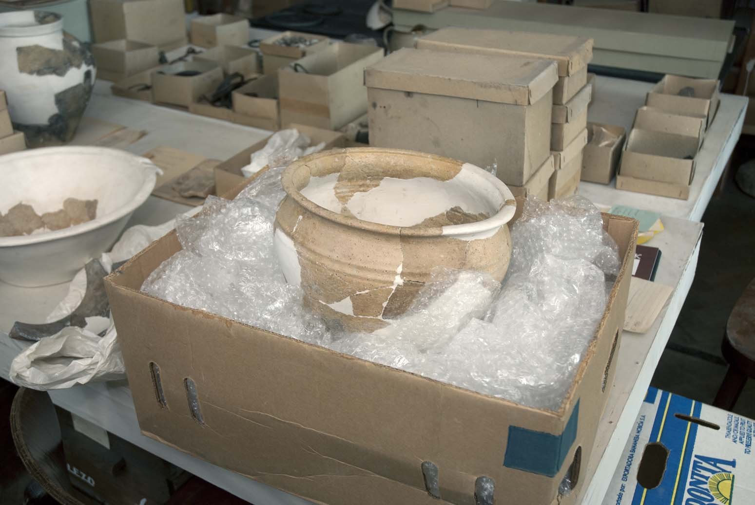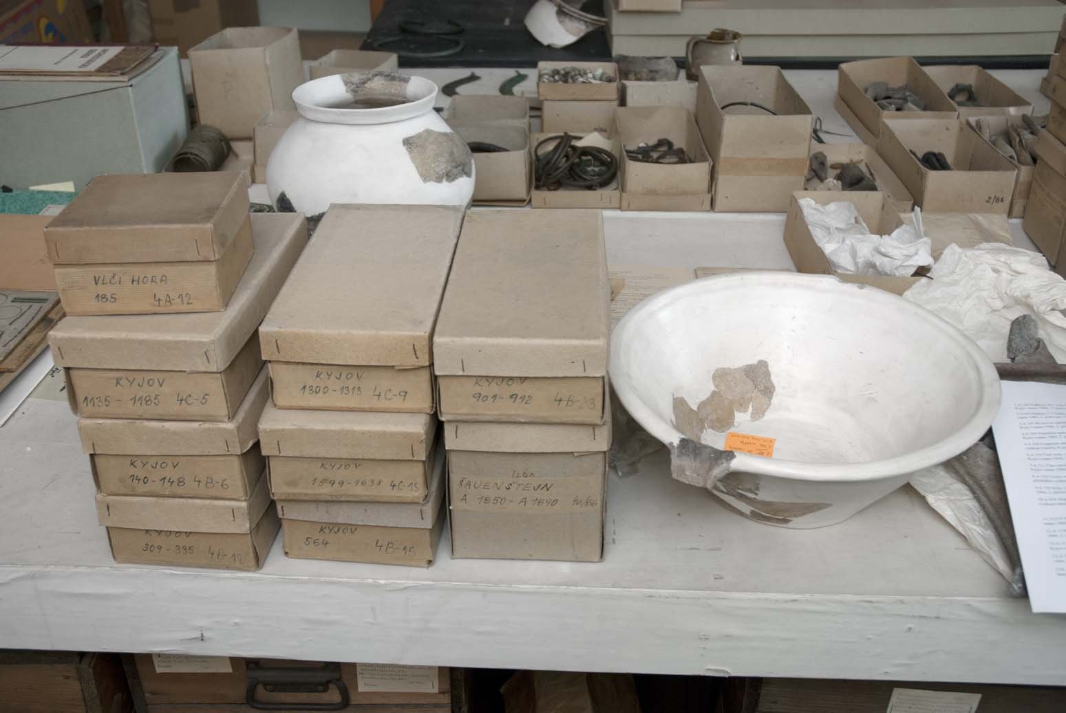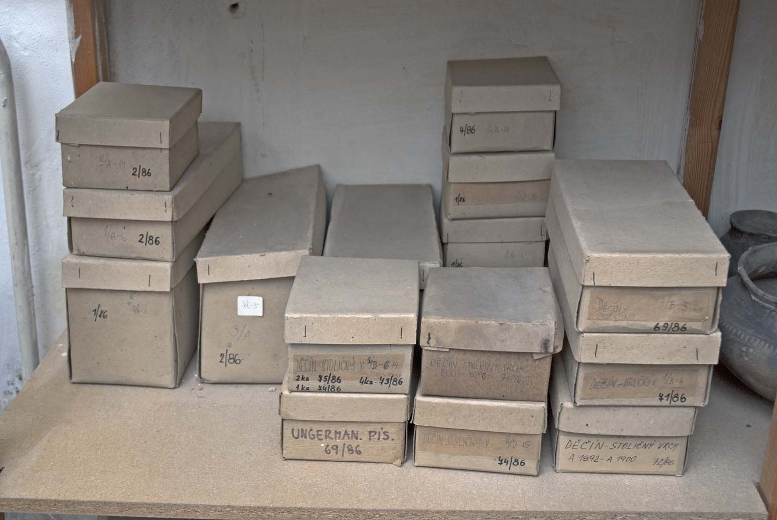 1/86,Část srpu, 212mm, bronz,kopie ( originál v muzeu v Mnichově), Palmeho sbírka A 1151 Část dveřního pantu, Soubor keramiky a kovových předmětů-výzkum lokality Kyjov-srpen 1984, 2. polovina 13. a počátek 14. století, A 2067 Část nádoby, v 125mm okraj a podhrdí s červeně malovaným dekorem, v 125mm,  polovina 14. století 71/86, fragment nádoby  - kultura lužická, Děčín - Stoliční vrch, Gebirge Verein Böhm. Schweiz, kamenný vrtaný přívěsek - kulturně neurčeno, Děčín Stoliční vrch , poloha - cesta Ecce Homo A 140 Podkova, Fe, 110x 95 mm,  Soubor keramiky a kovových předmětů-výzkum lokality Kyjov-srpen 1984,  2. polovina 13. a počátek 14. století A 185 Bronzová nádobka, v 45mmSoubor keramiky a kovových předmětů-výzkum lokality Kyjov-srpen 1984, 2. polovina 13. a počátek 14. století 1/86,  Nákrčník, 215cm, bronz, Praha-  Libeň, Palmeho sbírka A 145 Nástroj, v 112mm, Soubor keramiky a kovových předmětů-výzkum lokality Kyjov-srpen 1984, 2. polovina 13. a počátek 14. století A 204 Doplněná nádoba, v 168mm,Soubor keramiky a kovových předmětů-výzkum lokality Kyjov-srpen 1984, 2. polovina 13. a počátek 14. stol. A 309 Fragment sekery bez tuleje , 148 x 114mm,  Soubor keramiky a kovových předmětů-výzkum lokality Kyjov-srpen 1984, 2. polovina 13. a počátek 14. století A 310 Část nože, v 250mm , Soubor keramiky a kovových předmětů-výzkum lokality Kyjov-srpen 1984, 2. polovina 13. a počátek 14. století A 311 Část ostruhy, v 95mm, Soubor keramiky a kovových předmětů-výzkum lokality Kyjov-srpen 1984, 2. polovina 13. a počátek 14. století A 316 Úchyt, tordovaný držák k vědérku ? d 195mm, Soubor keramiky a kovových předmětů-výzkum lokality Kyjov-srpen 1984, 2. polovina 13. a počátek 14. století Klín, v 90mm, soubor keramiky a kovových předmětů-výzkum lokality Kyjov-srpen 1984, 2. polovina 13. a počátek 14. století  A 916 Doplněná nádoba, š380 x v138mm,  Soubor keramiky a kovových předmětů-výzkum lokality Kyjov-srpen 1984, 2. polovina 13. a počátek 14. století, A 1135 Klíč, d 135mm,  Soubor keramiky a kovových předmětů-výzkum lokality Kyjov-srpen 1984, 2. polovina 13. a počátek 14. století A 1139 Držák, Soubor keramiky a kovových předmětů-výzkum lokality Kyjov-srpen 1984, 2. polovina 13. a počátek 14. století , A 1239 Přeslen, Soubor keramiky a kovových předmětů-výzkum lokality Kyjov-srpen 1984, 2. polovina 13. a počátek 14. století A 2058 část ucha s páskovým prožlabením, š 54mm, červeně malovaný ornament, výzkum Mariánská louka 1938, přelom 13. a14. století A 2068 Část nádoby, okraj a podhrdlí bez dekoru, jemně plavená hlína, import? 2. polovina 13. století A 2079/3 š 100mm  Část okraje nádoby s červeně malovanou linkou,přelom 13. a 14. století 72/86 A 1892 - 1900/1-17, fragmenty nádob – středověk, Děčín - Stoliční vrch , poloha Heinburg (východní strana) 73/86 štípaná industrie - neolit, eneolit, Děčín - Stoličný vrch, poloha Hirschtränke bei nachst Kaiser Ansicht 75/86 štípaná industrie , neolit – eneolit, Děčín Stoliční vrch , poloha - Focksche Höhe, svrchní labská terasa A 1803, 69/86 ,fragmenty nádoby - kultura lužická,  Děčín, poloha - Ungrmannova pískovna Celkový pohled do depozitáře Archeologie Celkový pohled do depozitáře archeologie Pohled na uložení sbírkových předmětů v krabicích Pohled na uložení sbírkových předmětů v krabicích Pohled na uložení sbírkových předmětů v krabicích a regálech
