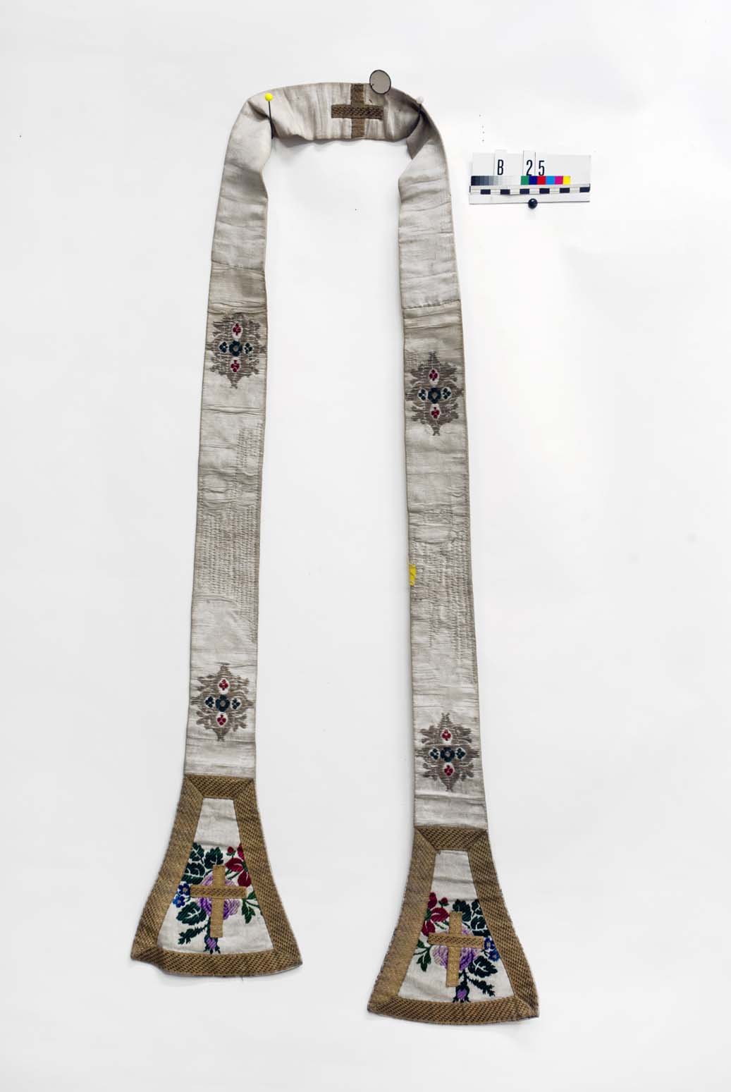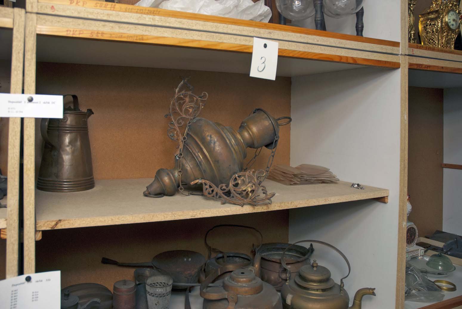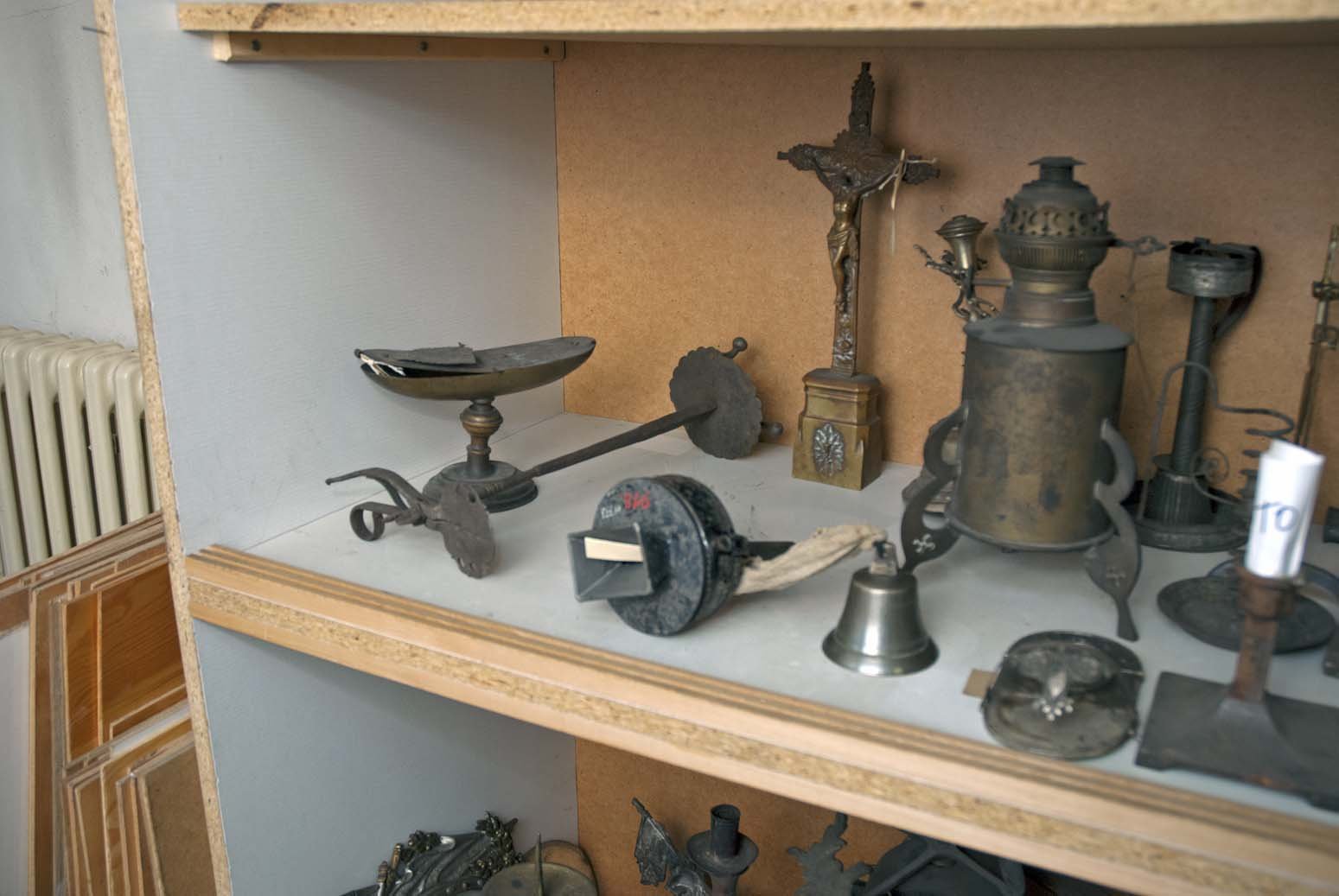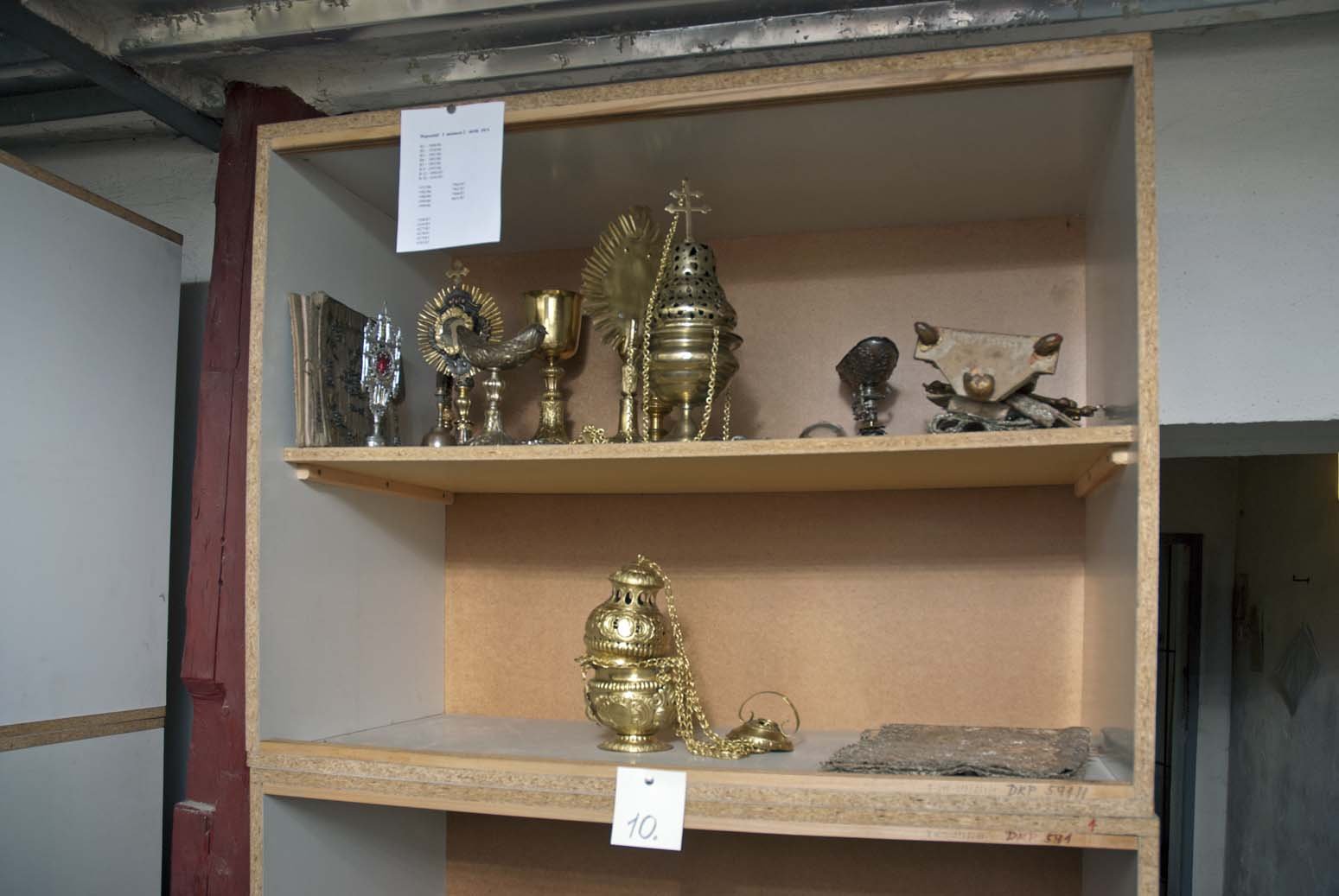 Relikviář, štítový, dřevěný, zelený, barokní. Sign. na nálepce: Relikviář monstrancový, mosaz,  konec 18. století,  Kadidelnice, mosazná, v 37cm, pravoslavné náboženství, 19.století Relikviář monstrancový, tepaná mosaz, částečně zlacená, 29, 5cm, 3. čtvrtina 18. století Navikula, barokní, tepaná stříbřená mosaz, 18,5cm, pol. 18. století Navikula, tepaná mosaz, v17,6cm, 2. polovina 18.století Věčné světlo, mosazný plech, strojově spracované, v39cm, 2.plovina 19. století Mešní zvonek, bílý kov, v 9,8cm, profilované držátko, 19. století Měšec k vybírání peněz, opatřený zvonkem, torzo, obecný kov, poč.20. století Relikviář,tepaná mosaz a stříbro, rozměr 15 x 12,5 cm, 2.polovina 18. století Burza k zaopatření, sign. J.I., vyšívaný bílý hedvábný ryps, 19,6 x19,6cm, 2.pol. 19. století Mešní tabulka, na papíru tištěné obvyklé mešní texty, tištěné v Litoměřicích v roce 1726. 21,4 x 17,8cm Mešní tabulka, na papíru tištěné obvyklé mešní texty, tištěné v Litoměřicích v roce 1726. 21,4 x 17,8cm Štola, hedvábná bílá s brokátovými konci, 2. pol. 19. stol.,sign. F 136 Kasulke, hedvábná bílá, bohatě vyšívaná m 1,10 x 94,5cm, 19.století Pás vyšívaný korálky, na jednom konci kování ve čeledína pečujícího o koně, druhý konec zakončen hřebenem, 117 x 10,3cm   konec 19. století Pás k sakristijnímu zvonku vyšívaný, kování ve tvaru ptáčka v keři, 140 x 9cm  asi kolem 1900 Pás vyšívaný, bez kování,  181 x 9,5cm  konec 19. století Výšivková výplň pravděpodobně z oltářního antipendia ( torzo )  113 x 25cm,kolemn roku 1900 Štola, bílá brokátová, sign. 135, látka řídce vyšívaná křížkovým vzorem, rozšířené konce štoly jsou z brokátu. konec 19. století Pás k sakristijnímu zvonku vyšívaný, kování ve tvaru poloviční rosety, 175 x 12,7cm  asi konec 19. století Pás vyšívaný korálky, kování ve tvaru lyry, na jednom konci mosazný kruh, 115 x 10,5 cm  asi konec 19. století Bílá brokátová štola, látka vyšívaná zlatými úponky a barevnými florálními motivy, stříbřitá obruba, podšívka červ ená, kolem roku 1900 Bílá štola, látka žlutě vyšívaná úponky, v rozšířené části motiv kříže, zakončeno dracounovými třásněmi barevnými florálními motivy, stříbřitá obruba, podšívka červ ená, kolem roku 1900 Fialová štola, látka vyšívaná zlatými a stříbřitými úponky. motivy, rozšířené konce zdobeny  stříbřitou portou, uprostřed motiv kříže, 2. pol. 19. století Palla,  černá sametová, lemovaná krajkou ze zlatého dracounu, konec 18 - 19. stol,  rozměr v137 x 137 mm, sign. F.W. 500 Pohled do tunelového depozitáře na uložení  sbírkových  předmětů Pohled do tunelového depozitáře na uložení  sbírkových  předmětů Pohled do tunelového depozitáře na uložení  sbírkových  předmětů