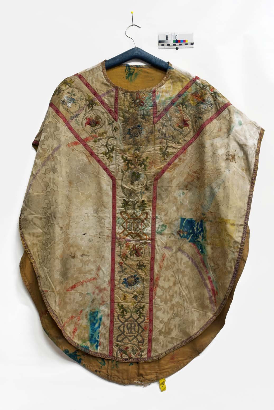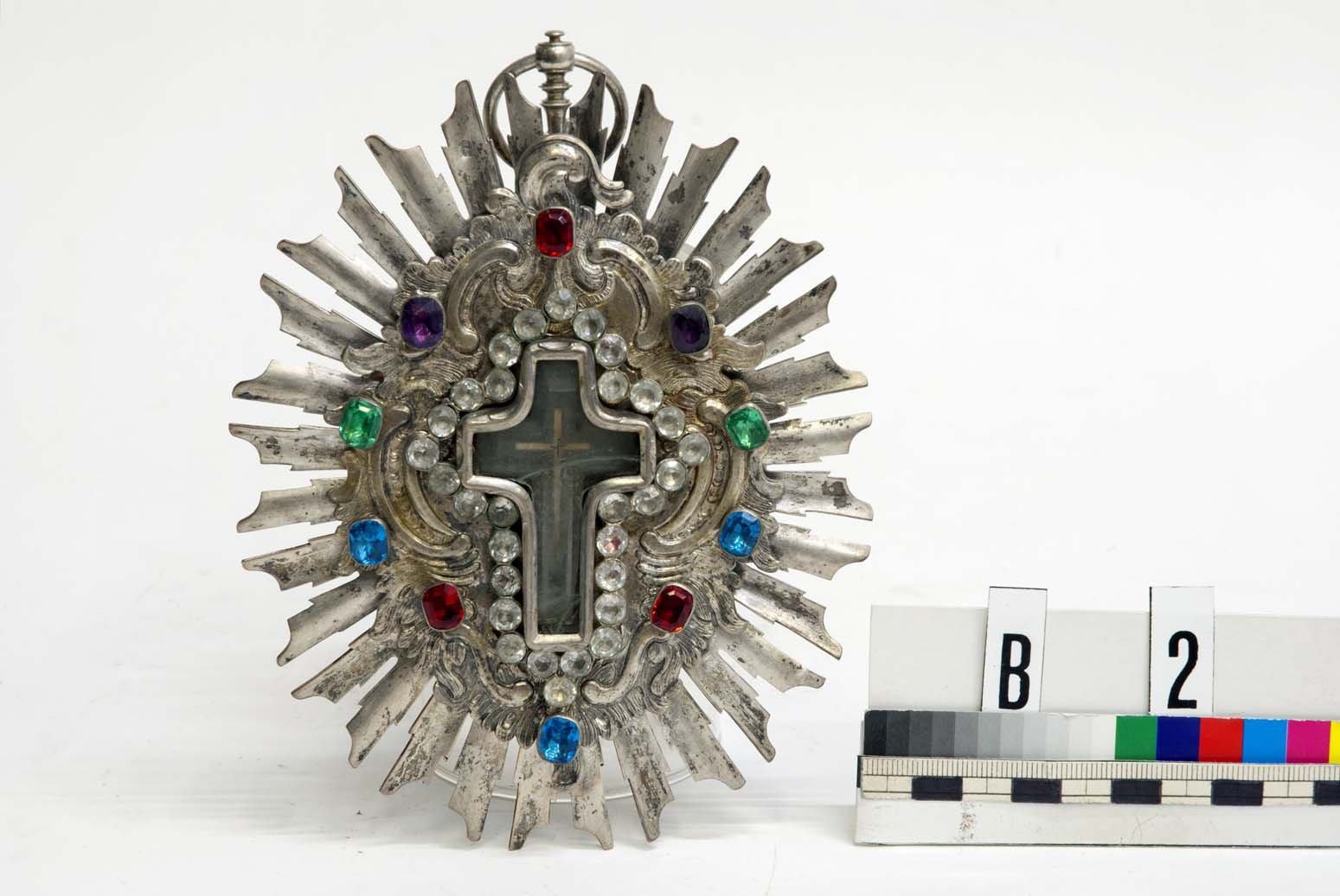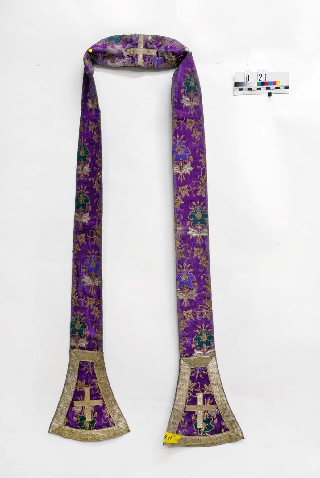 Relikviář, štítový, dřevěný, zelený, barokní. Sign. na nálepce: Relikviář monstrancový, mosaz,  konec 18. století,  Kadidelnice, mosazná, v 37cm, pravoslavné náboženství, 19.století Relikviář monstrancový, tepaná mosaz, částečně zlacená, 29, 5cm, 3. čtvrtina 18. století Navikula, barokní, tepaná stříbřená mosaz, 18,5cm, pol. 18. století Navikula, tepaná mosaz, v17,6cm, 2. polovina 18.století Věčné světlo, mosazný plech, strojově spracované, v39cm, 2.plovina 19. století Mešní zvonek, bílý kov, v 9,8cm, profilované držátko, 19. století Měšec k vybírání peněz, opatřený zvonkem, torzo, obecný kov, poč.20. století Relikviář,tepaná mosaz a stříbro, rozměr 15 x 12,5 cm, 2.polovina 18. století Burza k zaopatření, sign. J.I., vyšívaný bílý hedvábný ryps, 19,6 x19,6cm, 2.pol. 19. století Mešní tabulka, na papíru tištěné obvyklé mešní texty, tištěné v Litoměřicích v roce 1726. 21,4 x 17,8cm Mešní tabulka, na papíru tištěné obvyklé mešní texty, tištěné v Litoměřicích v roce 1726. 21,4 x 17,8cm Štola, hedvábná bílá s brokátovými konci, 2. pol. 19. stol.,sign. F 136 Kasulke, hedvábná bílá, bohatě vyšívaná m 1,10 x 94,5cm, 19.století Pás vyšívaný korálky, na jednom konci kování ve čeledína pečujícího o koně, druhý konec zakončen hřebenem, 117 x 10,3cm   konec 19. století Pás k sakristijnímu zvonku vyšívaný, kování ve tvaru ptáčka v keři, 140 x 9cm  asi kolem 1900 Pás vyšívaný, bez kování,  181 x 9,5cm  konec 19. století Výšivková výplň pravděpodobně z oltářního antipendia ( torzo )  113 x 25cm,kolemn roku 1900 Štola, bílá brokátová, sign. 135, látka řídce vyšívaná křížkovým vzorem, rozšířené konce štoly jsou z brokátu. konec 19. století Pás k sakristijnímu zvonku vyšívaný, kování ve tvaru poloviční rosety, 175 x 12,7cm  asi konec 19. století Pás vyšívaný korálky, kování ve tvaru lyry, na jednom konci mosazný kruh, 115 x 10,5 cm  asi konec 19. století Bílá brokátová štola, látka vyšívaná zlatými úponky a barevnými florálními motivy, stříbřitá obruba, podšívka červ ená, kolem roku 1900 Bílá štola, látka žlutě vyšívaná úponky, v rozšířené části motiv kříže, zakončeno dracounovými třásněmi barevnými florálními motivy, stříbřitá obruba, podšívka červ ená, kolem roku 1900 Fialová štola, látka vyšívaná zlatými a stříbřitými úponky. motivy, rozšířené konce zdobeny  stříbřitou portou, uprostřed motiv kříže, 2. pol. 19. století Palla,  černá sametová, lemovaná krajkou ze zlatého dracounu, konec 18 - 19. stol,  rozměr v137 x 137 mm, sign. F.W. 500 Pohled do tunelového depozitáře na uložení  sbírkových  předmětů Pohled do tunelového depozitáře na uložení  sbírkových  předmětů Pohled do tunelového depozitáře na uložení  sbírkových  předmětů